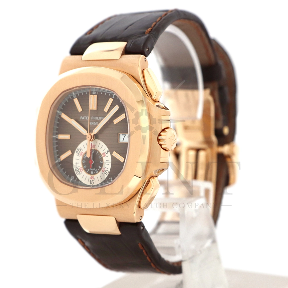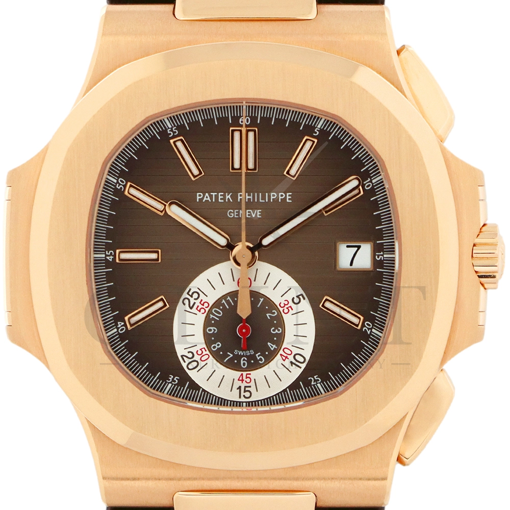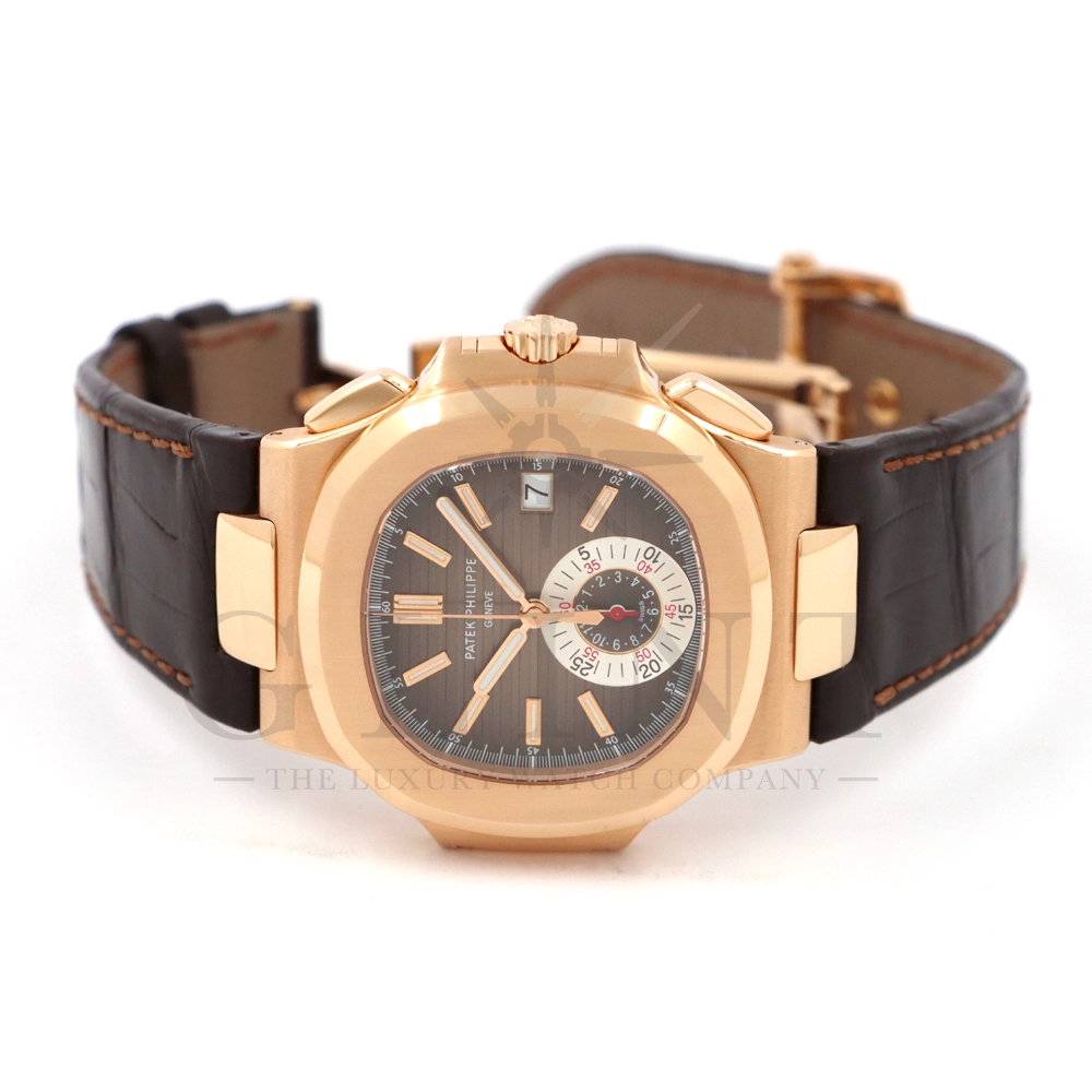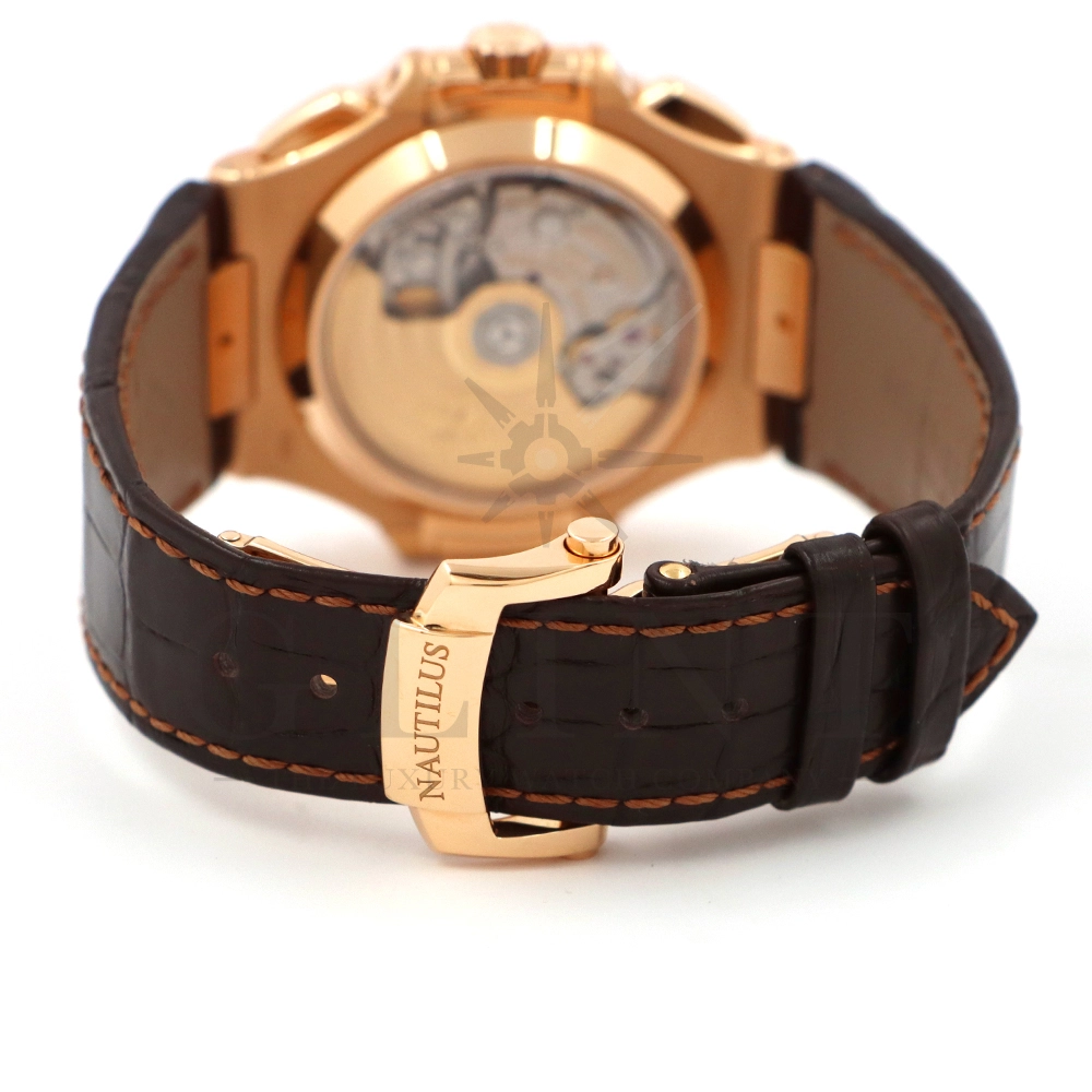 こちらはノーチラス誕生30周年を迎えた際に発表されたパテック・フィリップ ノーチラス クロノグラフです。素材に18Kローズゴールドを使用した高級感溢れるモデル。ローズゴールドモデルにしか配されないブラウンを基調としたグラデーションカラーの文字盤は特別な気持ちにさせてくれるでしょう。6時位置には60分計と12時間計を同軸で統合したクロノグラフ・サブダイアルが備えられており、パテック・フィリップらしい画期的なアイデアが詰め込まれております。ハンドメイドのアリゲーターベルトにはケースと同素材の折り畳み式バックルが付属。腕元にはめた時の装着感も考えられた仕上がりとなっており、ますますパテック・フィリップの虜になる事は間違いありません。世界最高峰の時計技術を堪能できる極上の一本をどうぞお楽しみください。