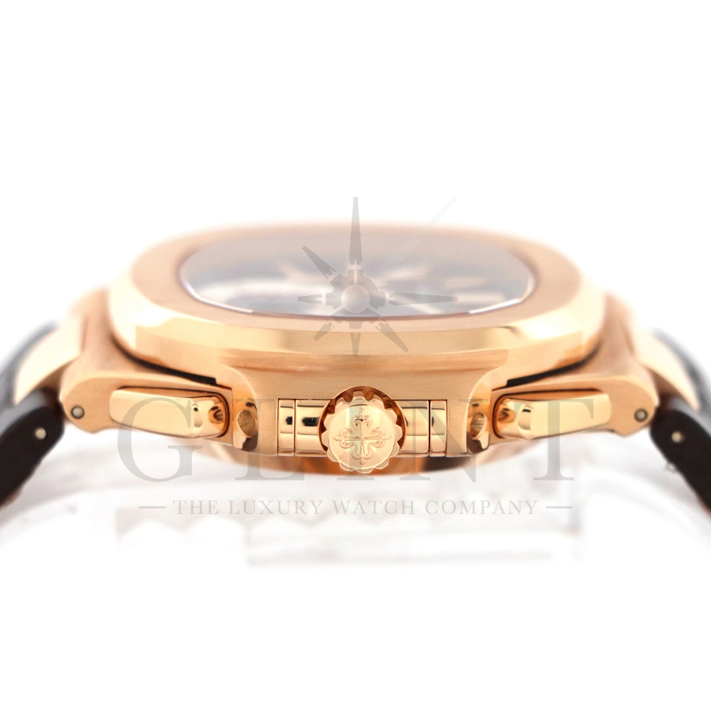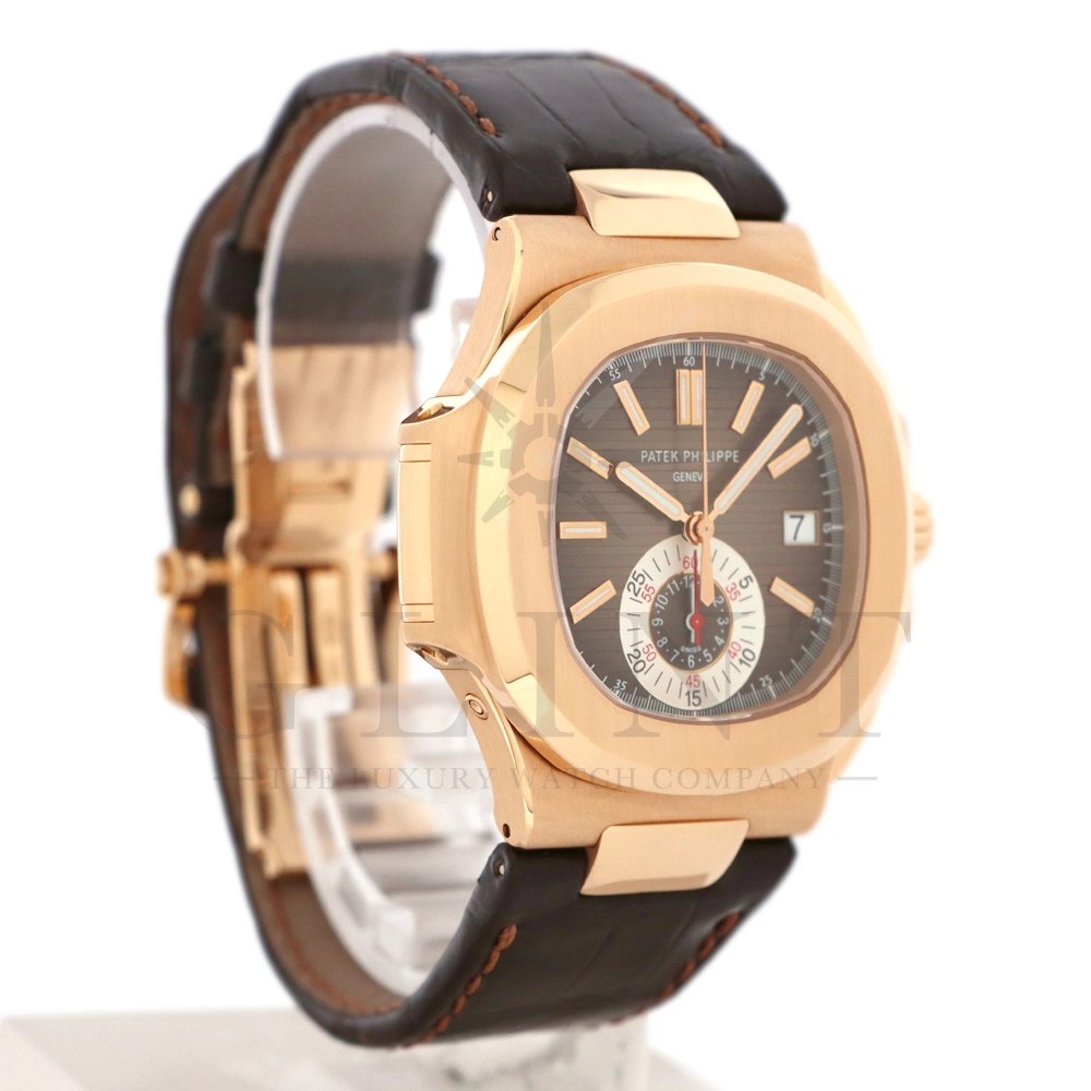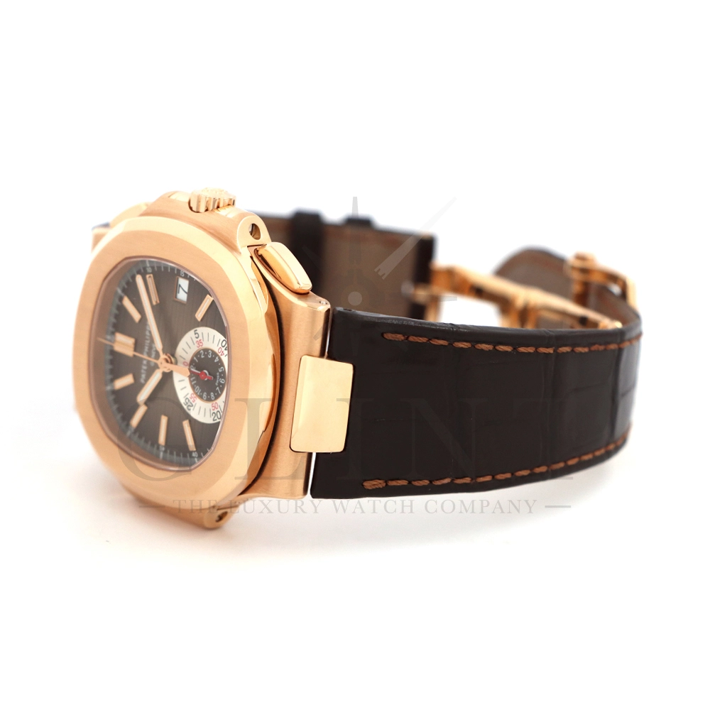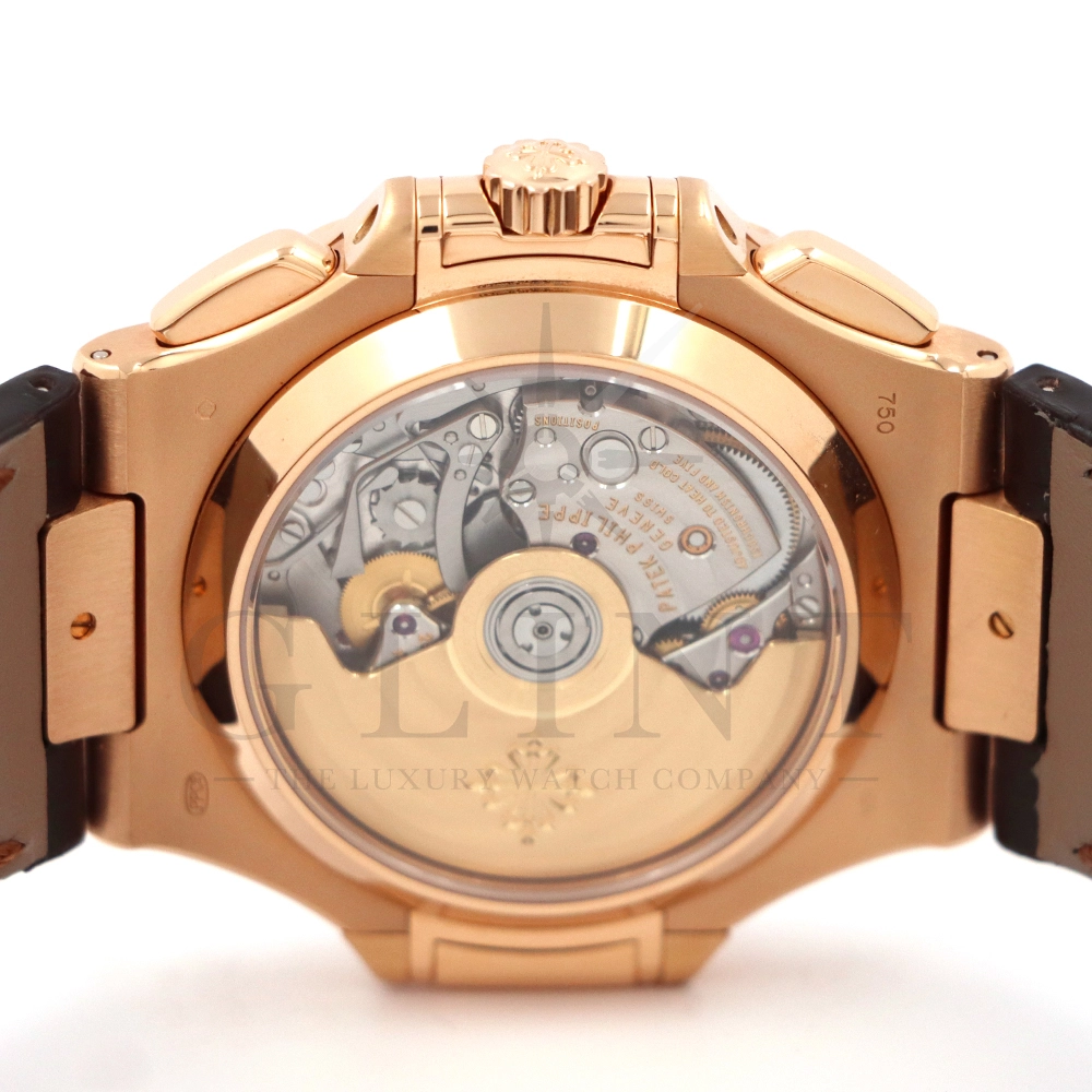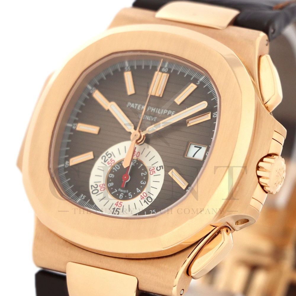 こちらはノーチラス誕生30周年を迎えた際に発表されたパテック・フィリップ ノーチラス クロノグラフです。素材に18Kローズゴールドを使用した高級感溢れるモデル。ローズゴールドモデルにしか配されないブラウンを基調としたグラデーションカラーの文字盤は特別な気持ちにさせてくれるでしょう。6時位置には60分計と12時間計を同軸で統合したクロノグラフ・サブダイアルが備えられており、パテック・フィリップらしい画期的なアイデアが詰め込まれております。ハンドメイドのアリゲーターベルトにはケースと同素材の折り畳み式バックルが付属。腕元にはめた時の装着感も考えられた仕上がりとなっており、ますますパテック・フィリップの虜になる事は間違いありません。世界最高峰の時計技術を堪能できる極上の一本をどうぞお楽しみください。