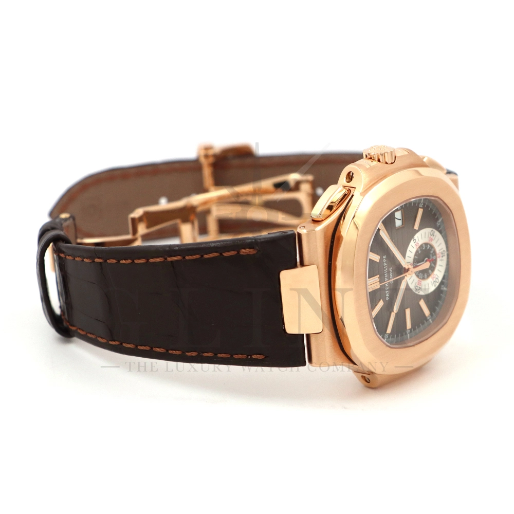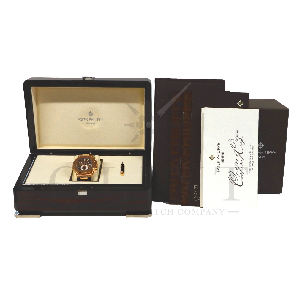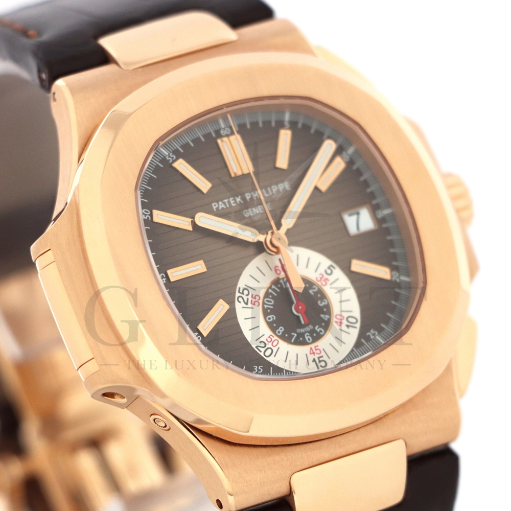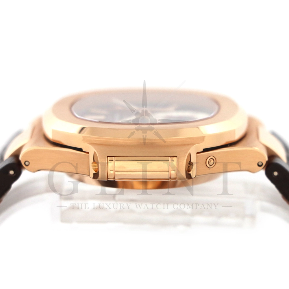 こちらはノーチラス誕生30周年を迎えた際に発表されたパテック・フィリップ ノーチラス クロノグラフです。素材に18Kローズゴールドを使用した高級感溢れるモデル。ローズゴールドモデルにしか配されないブラウンを基調としたグラデーションカラーの文字盤は特別な気持ちにさせてくれるでしょう。6時位置には60分計と12時間計を同軸で統合したクロノグラフ・サブダイアルが備えられており、パテック・フィリップらしい画期的なアイデアが詰め込まれております。ハンドメイドのアリゲーターベルトにはケースと同素材の折り畳み式バックルが付属。腕元にはめた時の装着感も考えられた仕上がりとなっており、ますますパテック・フィリップの虜になる事は間違いありません。世界最高峰の時計技術を堪能できる極上の一本をどうぞお楽しみください。