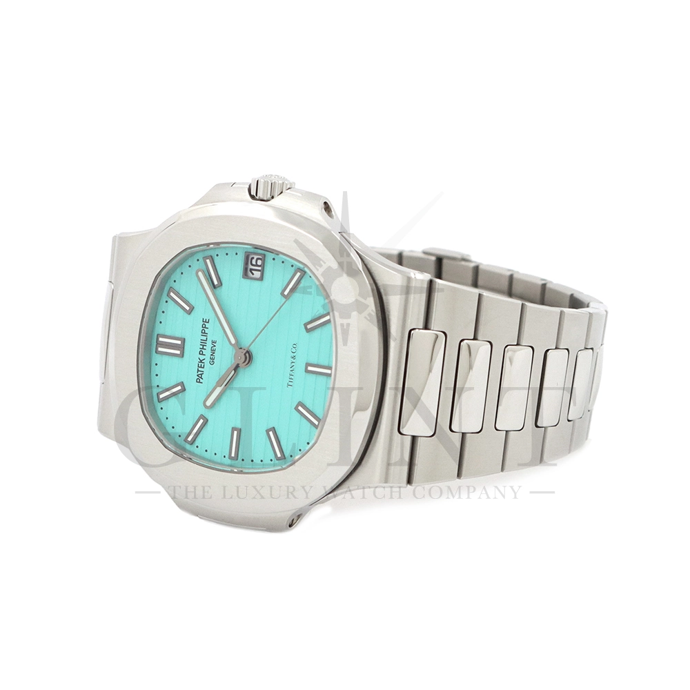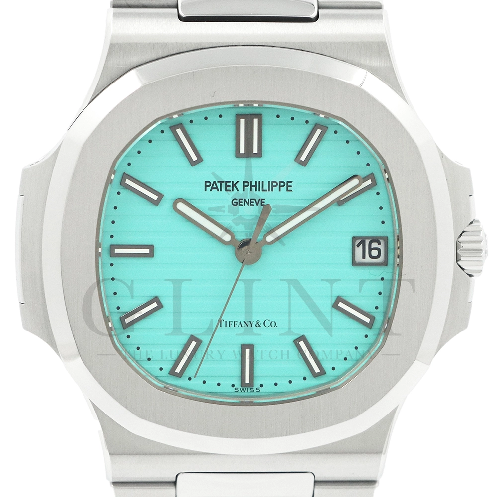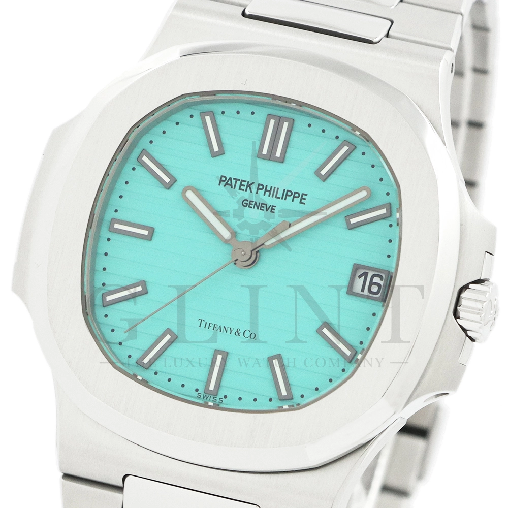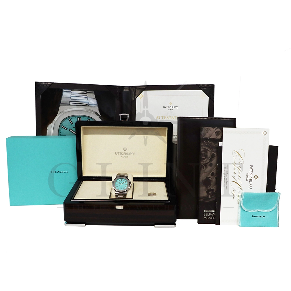 こちらはパテックフィリップ ノーチラス ティファニーブルー 170周年記念モデルです。パテック フィリップは、ティファニーとの提携170年記念を祝い、有名なティファニーブルーと両社のブランドネームを文字盤に携えたノーチラスの限定モデルを2021年12月6日に発表。これまでに数々のダブルネームのモデルが登場しましたが、文字盤にティファニーブルーが採用されたのは今回が初となります。ティファニーのブランドカラー(コーポレートカラー)でもあり、誰もが一目見ればそれと認識する”ティファニーブルー”という色は、「ロビンズエッグブルー」とも呼ばれるコマドリの卵の鮮やかな青色に由来。コマドリはイギリスの国鳥で、春を告げ、幸せを運ぶ鳥と言われていて、ティファニーブルーは幸せと品格を暗示します。170周年に伴い、170本のみ限定生産されたこちらのモデルはティファニーのニューヨーク本店、ビバリーヒルズ、サンフランシスコのブティックでのみ販売されました。ノーチラスのシグネチャー要素であるタペストリーレリーフ(エンボス加工)を備えたダイヤルの読みやすさは、黒く塗られたホワイトゴールド製のバトン型アワーマーカーとバトンアワーハンドおよびミニッツハンドによって増幅され、すべてに夜光や塗布されています。ケースの目立つデザイン、ベゼル、および一体型スティールブレスレットは、完成までに55の生産ステップを必要とするプロセスを手作業で行い、サテン仕上げと研磨リンクの洗練されたシーケンスによって強調されています。堅牢なケースは120メートルの防水性です。ムーブメントにはシリコン製スピロマックスヒゲゼンマイを備えた、センターローターの自動巻キャリバー 26-330 S Cが搭載。キャリバー324 S Cから派生したこの新しいムーブメントは、特に巻き上げシステムに関し、多くの技術革新と最適化された機能を備え、1秒単位の正確さで時刻合わせのできるストップセコンド機能も特徴となっております。そして、サファイアクリスタル製ケースバックには、「“170th Anniversary 1851-2021 Tiffany & Co. – Patek Philippe”」という記念の表記。2021年の数字「1」をよく見てみると、 “LVMH”の文字が縦に並んでいることが分かります。これは、ティファニー社と共有した170年のビジョンと、パテックフィリップとアメリカ合衆国を結ぶ歴史的な結びつきに敬意を表していると言えるでしょう。シンプルながらもエレガントでラグジュアリーな印象を与えてくれるノーチラス。名実ともに世界最高の高級時計ブランドが誇る極上のタイムピースです。