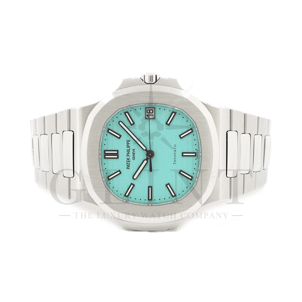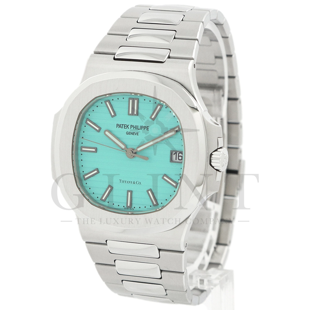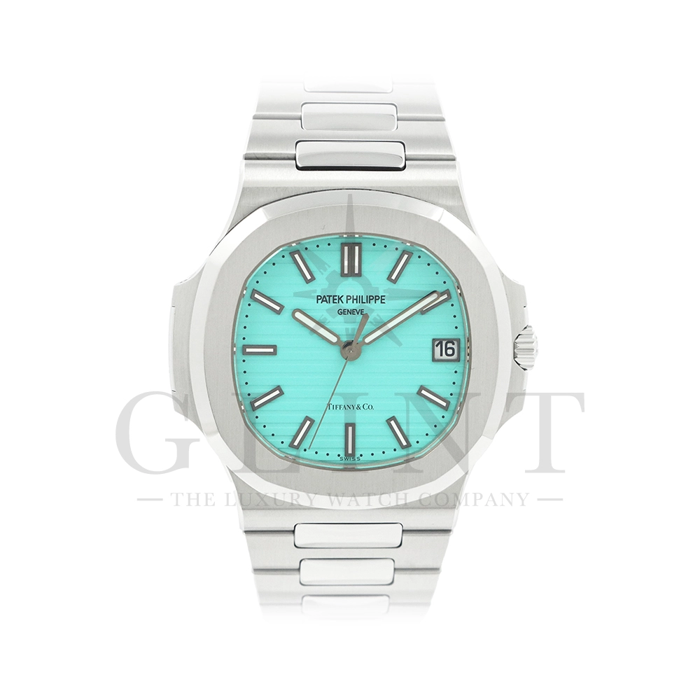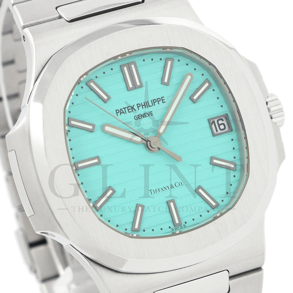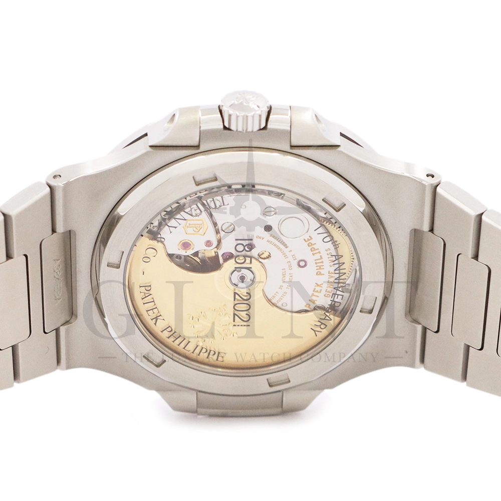 こちらはパテックフィリップ ノーチラス ティファニーブルー 170周年記念モデルです。パテック フィリップは、ティファニーとの提携170年記念を祝い、有名なティファニーブルーと両社のブランドネームを文字盤に携えたノーチラスの限定モデルを2021年12月6日に発表。これまでに数々のダブルネームのモデルが登場しましたが、文字盤にティファニーブルーが採用されたのは今回が初となります。ティファニーのブランドカラー(コーポレートカラー)でもあり、誰もが一目見ればそれと認識する”ティファニーブルー”という色は、「ロビンズエッグブルー」とも呼ばれるコマドリの卵の鮮やかな青色に由来。コマドリはイギリスの国鳥で、春を告げ、幸せを運ぶ鳥と言われていて、ティファニーブルーは幸せと品格を暗示します。170周年に伴い、170本のみ限定生産されたこちらのモデルはティファニーのニューヨーク本店、ビバリーヒルズ、サンフランシスコのブティックでのみ販売されました。ノーチラスのシグネチャー要素であるタペストリーレリーフ(エンボス加工)を備えたダイヤルの読みやすさは、黒く塗られたホワイトゴールド製のバトン型アワーマーカーとバトンアワーハンドおよびミニッツハンドによって増幅され、すべてに夜光や塗布されています。ケースの目立つデザイン、ベゼル、および一体型スティールブレスレットは、完成までに55の生産ステップを必要とするプロセスを手作業で行い、サテン仕上げと研磨リンクの洗練されたシーケンスによって強調されています。堅牢なケースは120メートルの防水性です。ムーブメントにはシリコン製スピロマックスヒゲゼンマイを備えた、センターローターの自動巻キャリバー 26-330 S Cが搭載。キャリバー324 S Cから派生したこの新しいムーブメントは、特に巻き上げシステムに関し、多くの技術革新と最適化された機能を備え、1秒単位の正確さで時刻合わせのできるストップセコンド機能も特徴となっております。そして、サファイアクリスタル製ケースバックには、「“170th Anniversary 1851-2021 Tiffany & Co. – Patek Philippe”」という記念の表記。2021年の数字「1」をよく見てみると、 “LVMH”の文字が縦に並んでいることが分かります。これは、ティファニー社と共有した170年のビジョンと、パテックフィリップとアメリカ合衆国を結ぶ歴史的な結びつきに敬意を表していると言えるでしょう。シンプルながらもエレガントでラグジュアリーな印象を与えてくれるノーチラス。名実ともに世界最高の高級時計ブランドが誇る極上のタイムピースです。