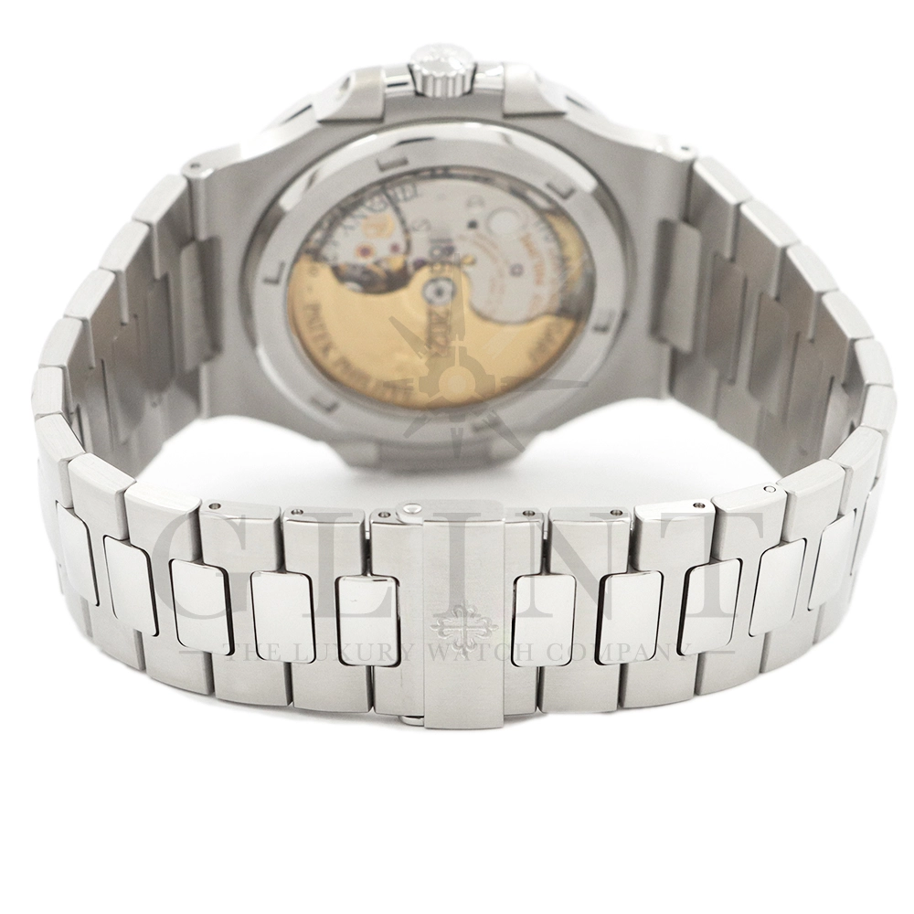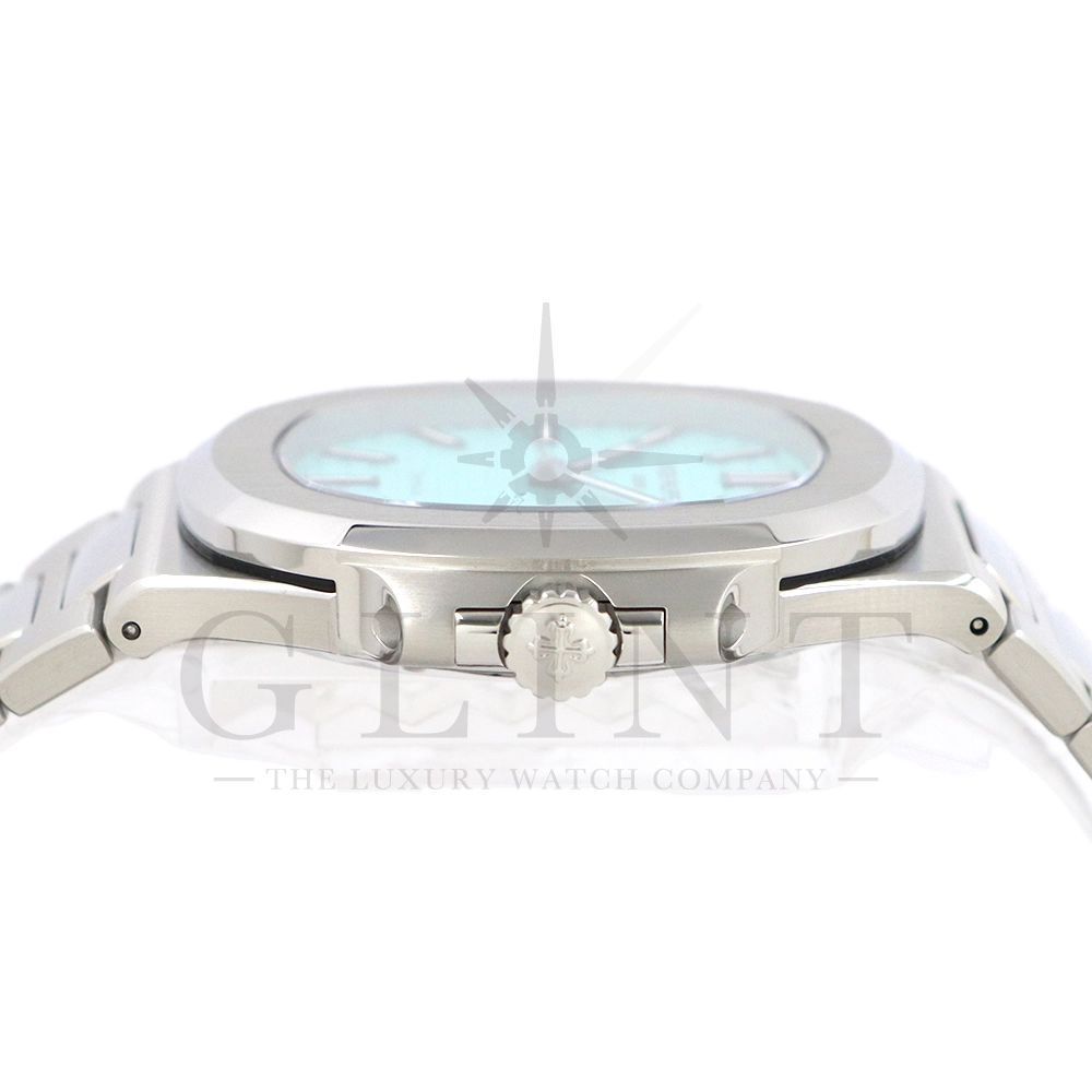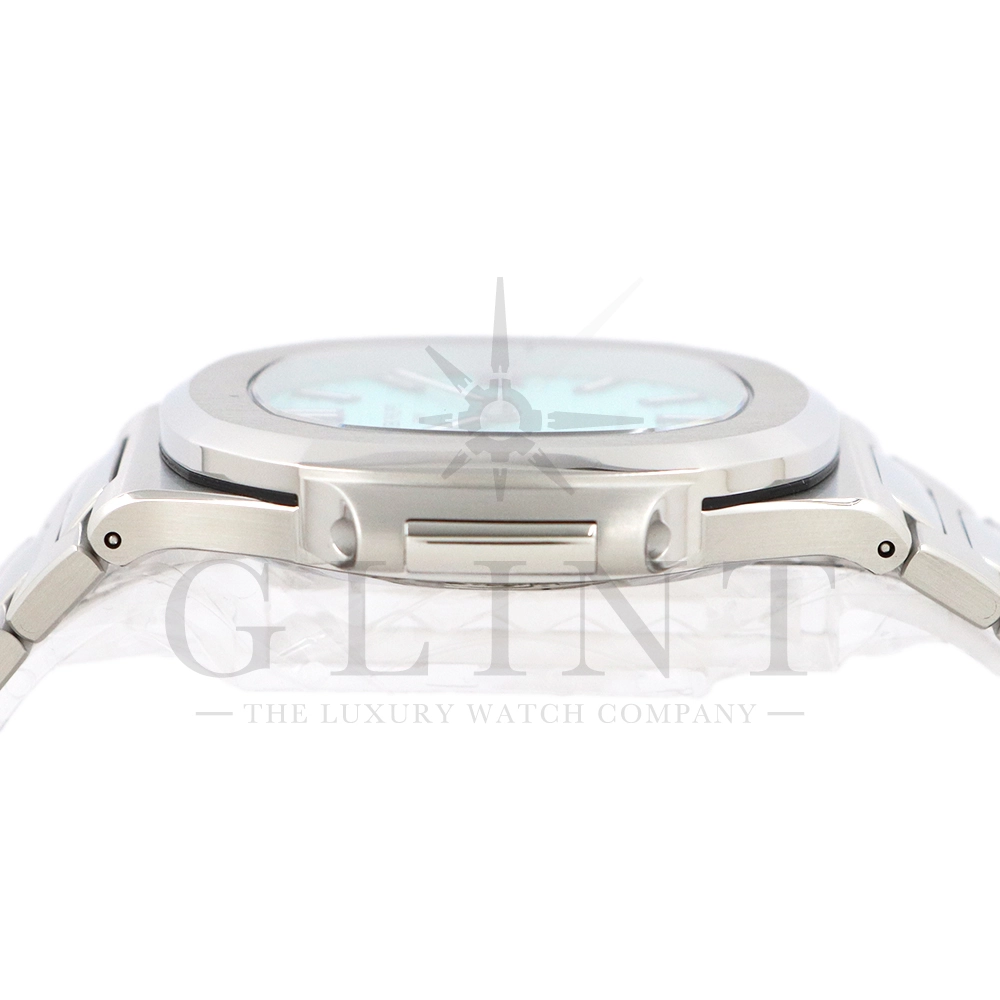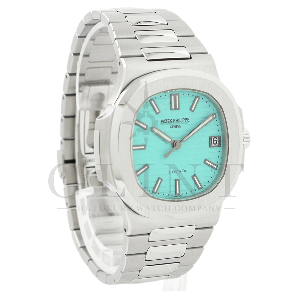 こちらはパテックフィリップ ノーチラス ティファニーブルー 170周年記念モデルです。パテック フィリップは、ティファニーとの提携170年記念を祝い、有名なティファニーブルーと両社のブランドネームを文字盤に携えたノーチラスの限定モデルを2021年12月6日に発表。これまでに数々のダブルネームのモデルが登場しましたが、文字盤にティファニーブルーが採用されたのは今回が初となります。ティファニーのブランドカラー(コーポレートカラー)でもあり、誰もが一目見ればそれと認識する”ティファニーブルー”という色は、「ロビンズエッグブルー」とも呼ばれるコマドリの卵の鮮やかな青色に由来。コマドリはイギリスの国鳥で、春を告げ、幸せを運ぶ鳥と言われていて、ティファニーブルーは幸せと品格を暗示します。170周年に伴い、170本のみ限定生産されたこちらのモデルはティファニーのニューヨーク本店、ビバリーヒルズ、サンフランシスコのブティックでのみ販売されました。ノーチラスのシグネチャー要素であるタペストリーレリーフ(エンボス加工)を備えたダイヤルの読みやすさは、黒く塗られたホワイトゴールド製のバトン型アワーマーカーとバトンアワーハンドおよびミニッツハンドによって増幅され、すべてに夜光や塗布されています。ケースの目立つデザイン、ベゼル、および一体型スティールブレスレットは、完成までに55の生産ステップを必要とするプロセスを手作業で行い、サテン仕上げと研磨リンクの洗練されたシーケンスによって強調されています。堅牢なケースは120メートルの防水性です。ムーブメントにはシリコン製スピロマックスヒゲゼンマイを備えた、センターローターの自動巻キャリバー 26-330 S Cが搭載。キャリバー324 S Cから派生したこの新しいムーブメントは、特に巻き上げシステムに関し、多くの技術革新と最適化された機能を備え、1秒単位の正確さで時刻合わせのできるストップセコンド機能も特徴となっております。そして、サファイアクリスタル製ケースバックには、「“170th Anniversary 1851-2021 Tiffany & Co. – Patek Philippe”」という記念の表記。2021年の数字「1」をよく見てみると、 “LVMH”の文字が縦に並んでいることが分かります。これは、ティファニー社と共有した170年のビジョンと、パテックフィリップとアメリカ合衆国を結ぶ歴史的な結びつきに敬意を表していると言えるでしょう。シンプルながらもエレガントでラグジュアリーな印象を与えてくれるノーチラス。名実ともに世界最高の高級時計ブランドが誇る極上のタイムピースです。