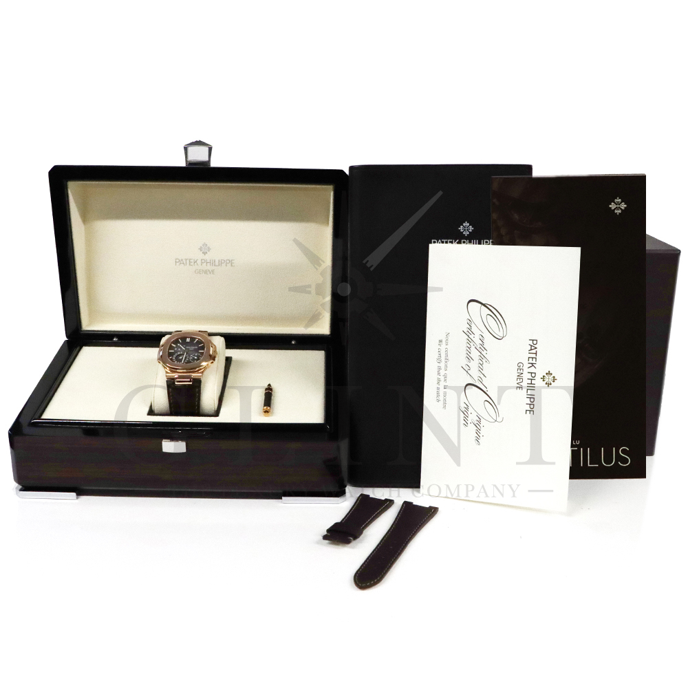 こちらはパテックフィリップ ノーチラスです。5712R-001はノーチラスが誕生して30周年を迎えた2006年に新たなラインナップとして発表されたコレクションの中でも高い人気を誇るモデルで、ポインターデイト、ムーンフェイズ、パワーリザーブなど様々な機能を搭載したプチコンプリケーションが魅力の一つです。多機能ながらこれほどまでの薄型を実現する事が出来るのも世界最高水準の時計技術を誇るパテックフィリップだからこそ。そしてケースにはローズゴールドを採用し、エレガンスな印象をより一層強調してくれます。更にはノーチラスシリーズでは初となる革ベルトを採用しており、スポーツモデルながらもフォーマルな印象も与え、ステータス性の高い洗練された大人の雰囲気を演出してくれる魅力的な逸品です。