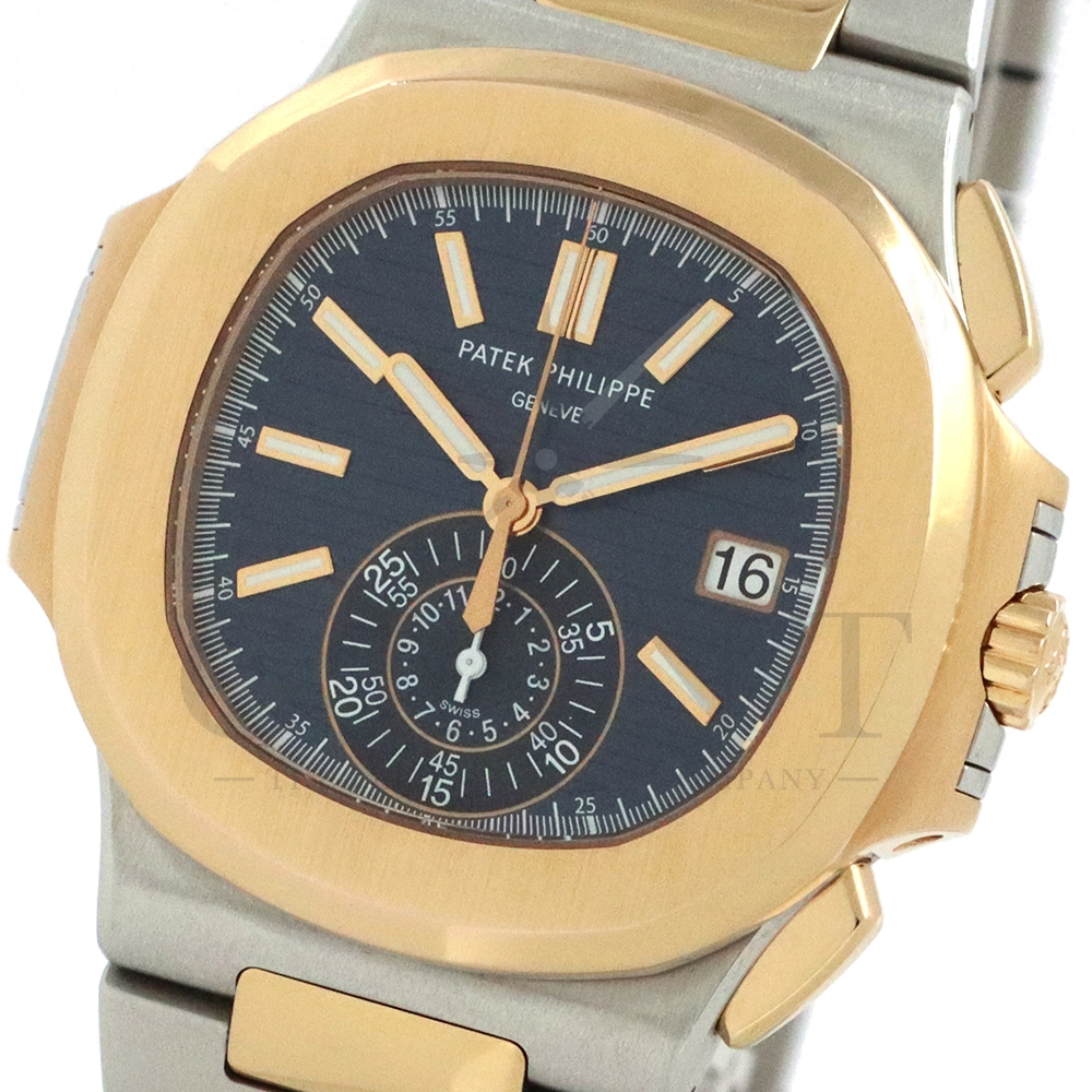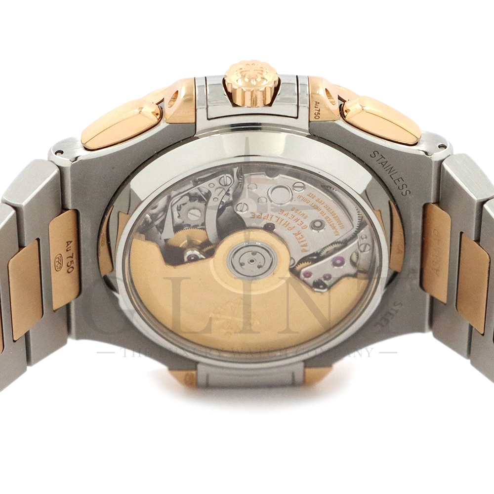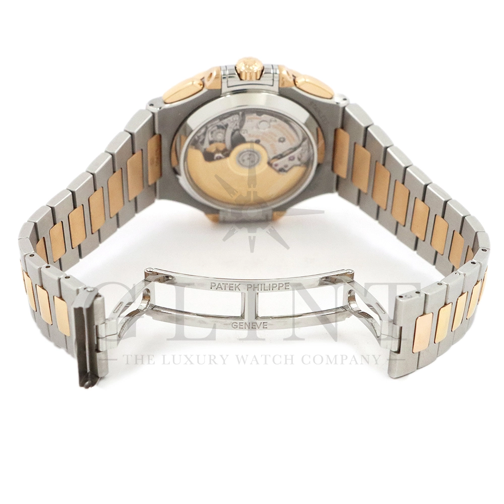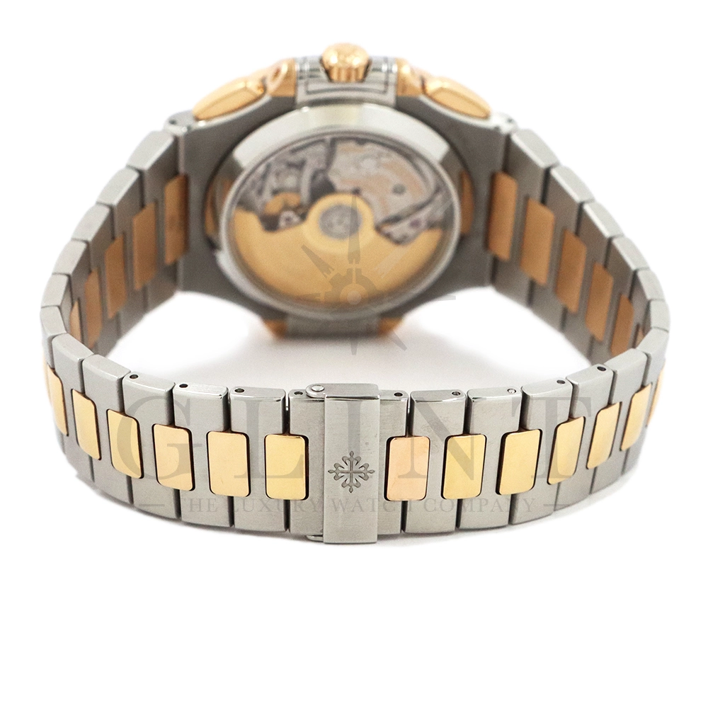 こちらはノーチラス初のスポーツクロノグラフ Ref.5980/1AR-001。ケースとベルトにステンレススティールとローズゴールドを使用したラグジュアリーなモデルでブルー・グラデーション文字盤との組み合わせによって上品な雰囲気を演出してくれます。また、見た目の華やかさのみならず、言わずと知れた機能性と信頼性が凝縮された珠玉の一本であり、他のクロノグラフとは一線を画す唯一無二のモデルです。シースルーのケースバックからは、自社開発自動巻きクロノグラフ「Cal.CH28-520」を覗き見る事ができ、機械式時計の最高峰を追及した名門パテックフィリップが作り出す独自の世界観を存分に堪能することができるでしょう。