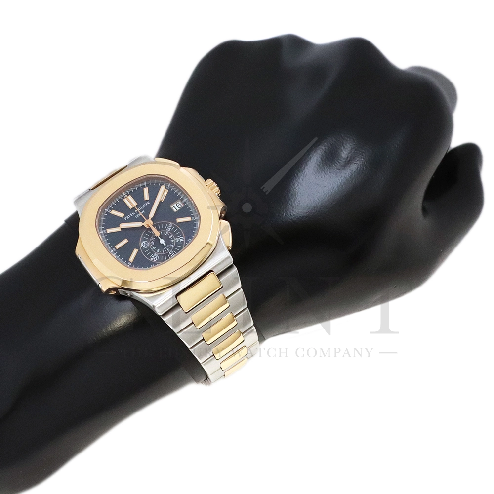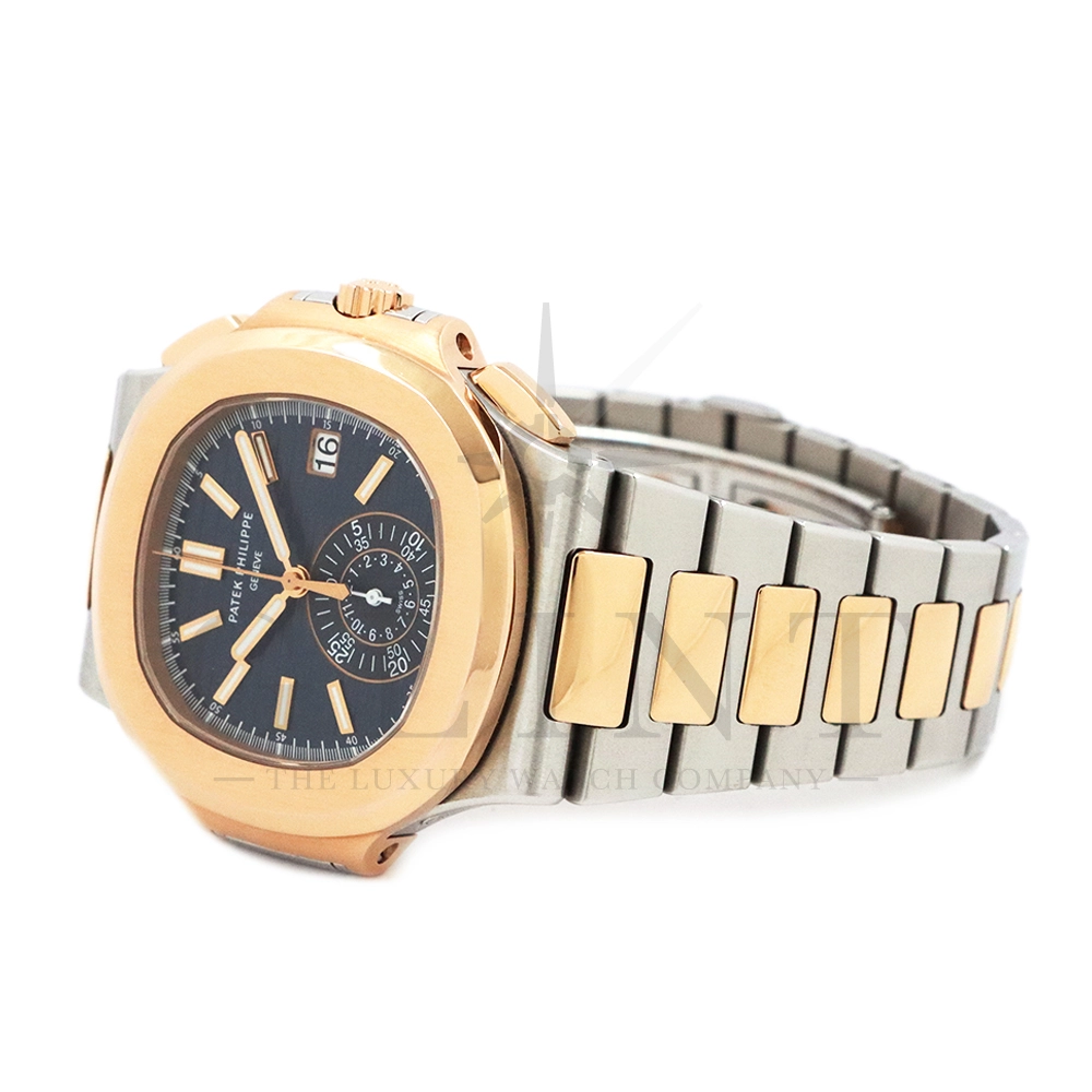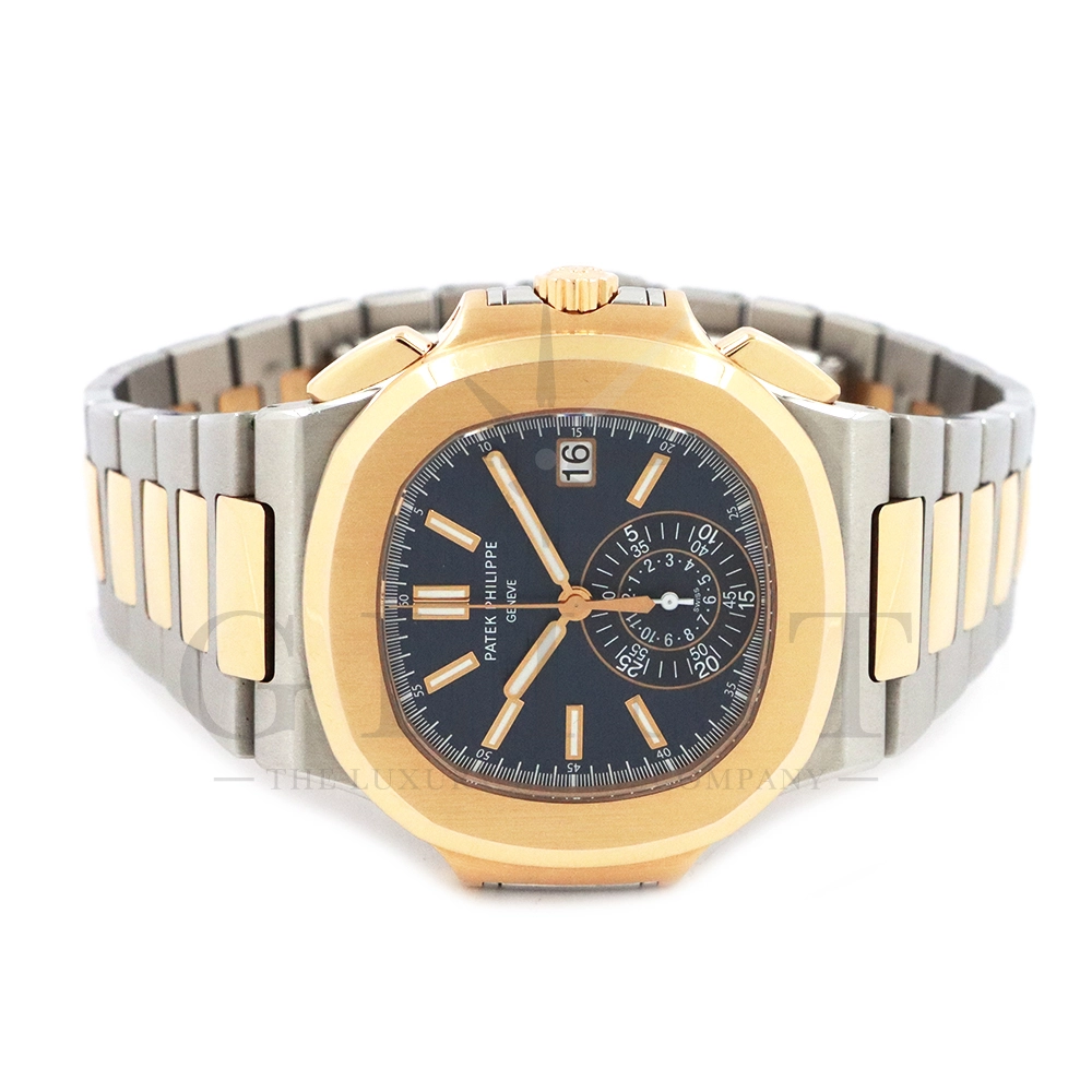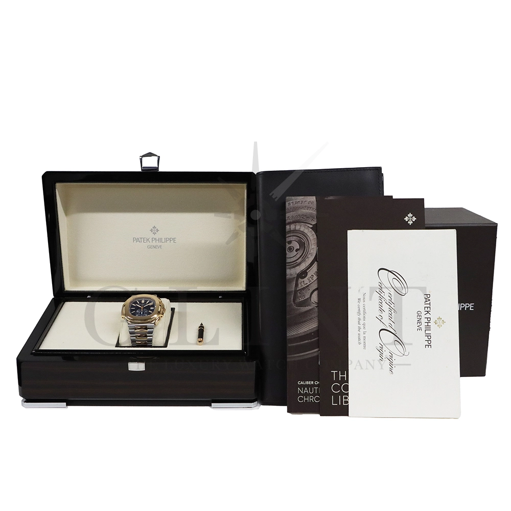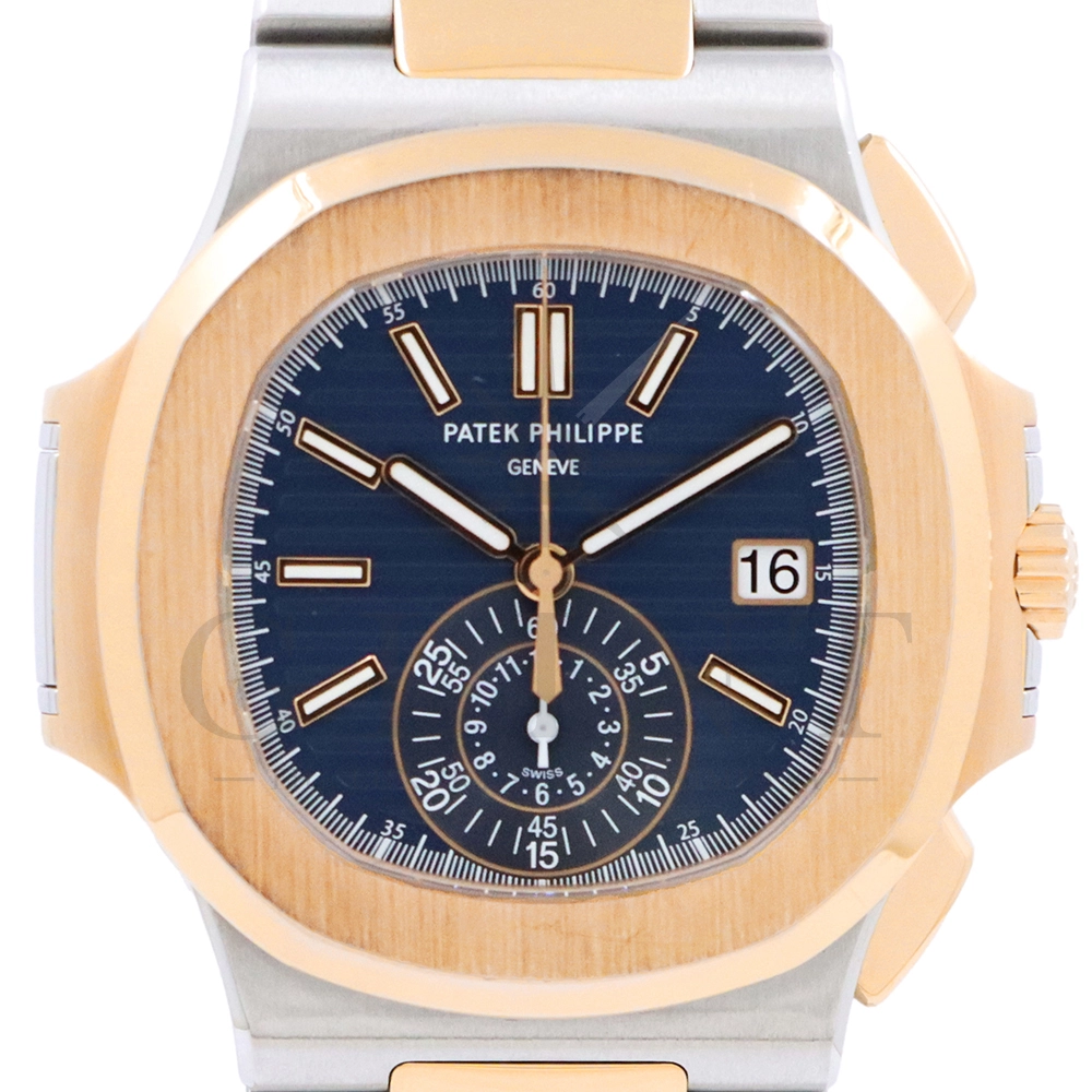 こちらはノーチラス初のスポーツクロノグラフ Ref.5980/1AR-001。ケースとベルトにステンレススティールとローズゴールドを使用したラグジュアリーなモデルでブルー・グラデーション文字盤との組み合わせによって上品な雰囲気を演出してくれます。また、見た目の華やかさのみならず、言わずと知れた機能性と信頼性が凝縮された珠玉の一本であり、他のクロノグラフとは一線を画す唯一無二のモデルです。シースルーのケースバックからは、自社開発自動巻きクロノグラフ「Cal.CH28-520」を覗き見る事ができ、機械式時計の最高峰を追及した名門パテックフィリップが作り出す独自の世界観を存分に堪能することができるでしょう。