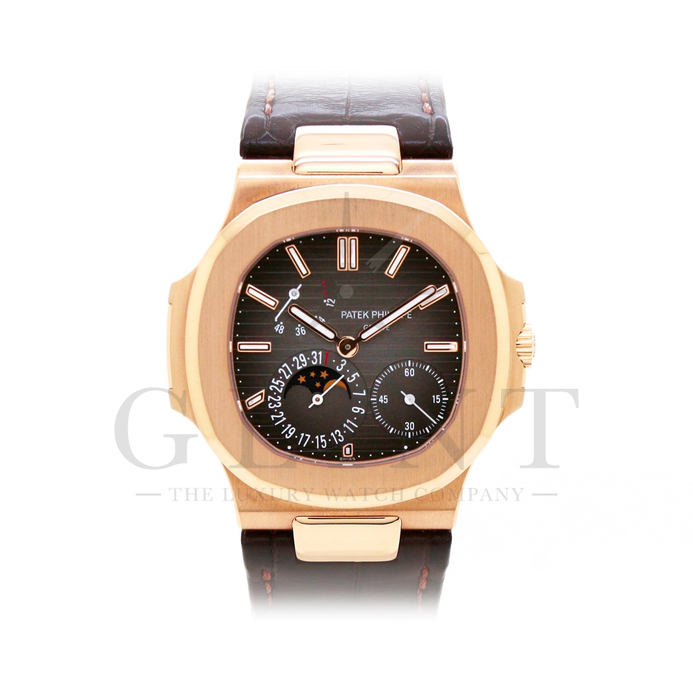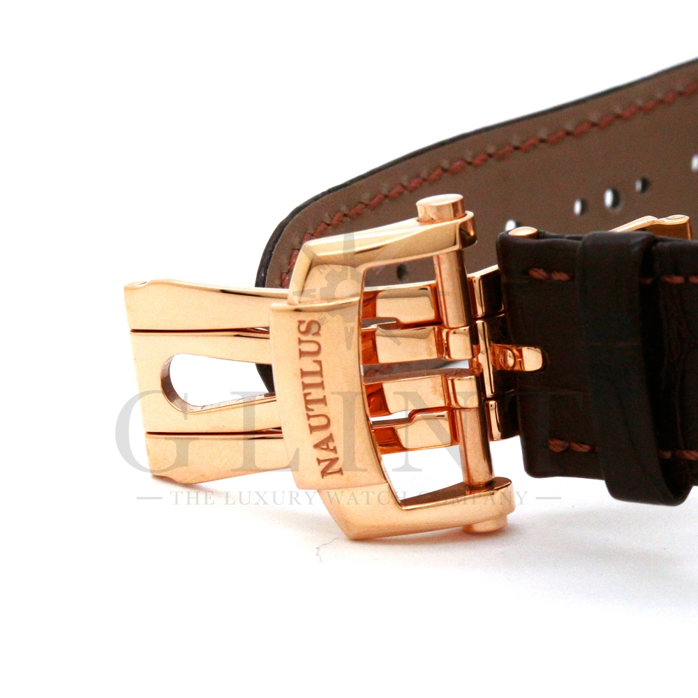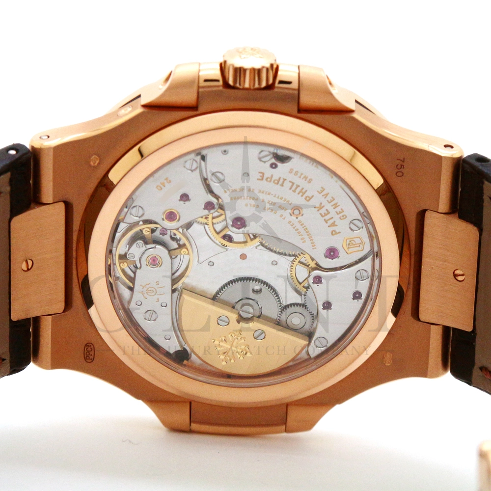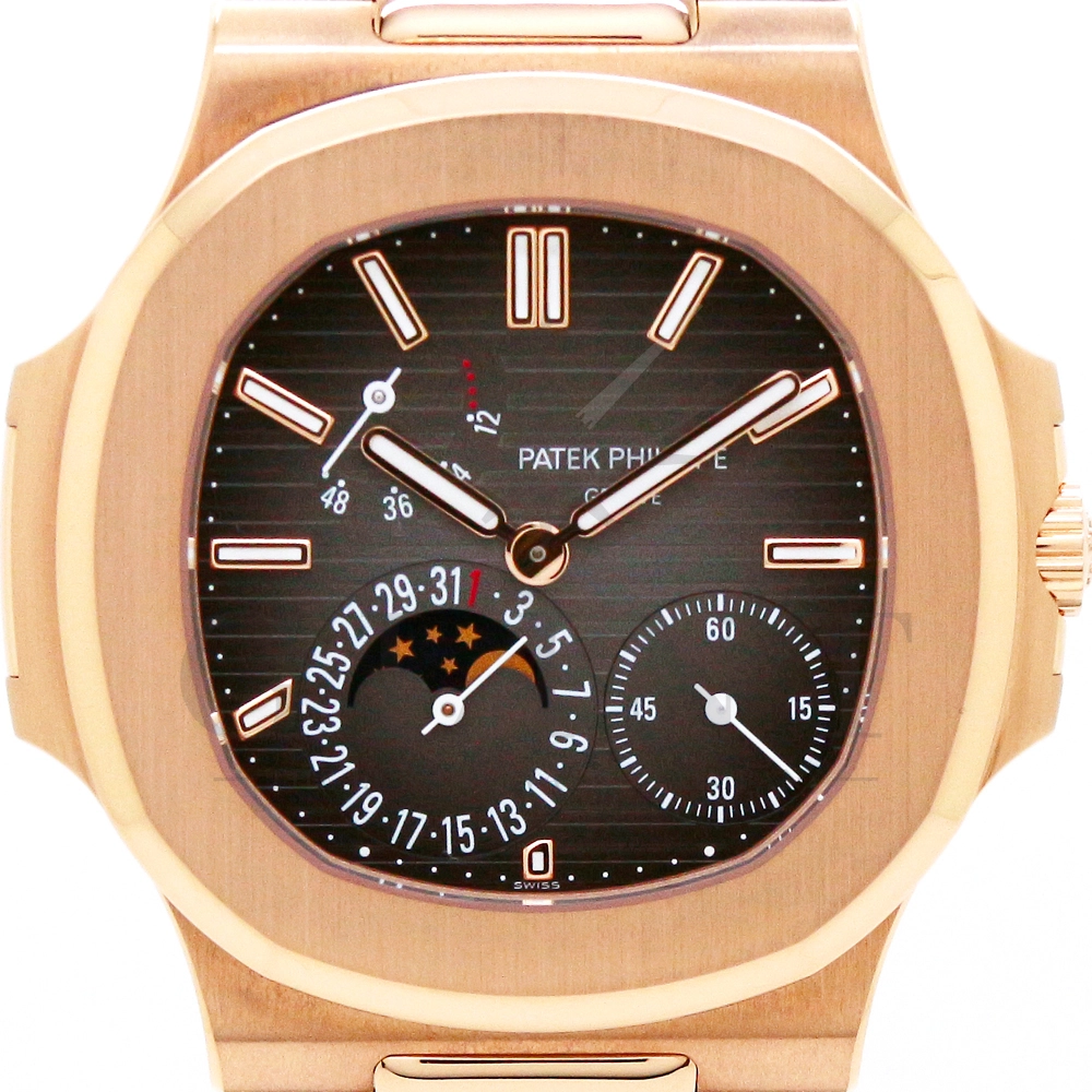こちらのRef.5712Rはノーチラスが誕生して30周年を迎えた2006年に新たなラインナップとして発表されたたコレクションの中でも高い人気を誇るモデルで、ポインターデイト、ムーンフェイズ、パワーリザーブなど様々な機能を搭載したプチコンプリケーションが魅力の一つです。多機能ながらこれほどまでの薄型を実現する事が出来るのも世界最高水準の時計技術を誇るパテックフィリップだからこそ。そしてケースにはローズゴールドを採用し、エレガンスな印象をより一層強調してくれます。更にはノーチラスシリーズでは初となる革ベルトを採用しており、スポーツモデルながらもフォーマルな印象も与え、ステータス性の高い洗練された大人の雰囲気を演出してくれる魅力的な逸品です。