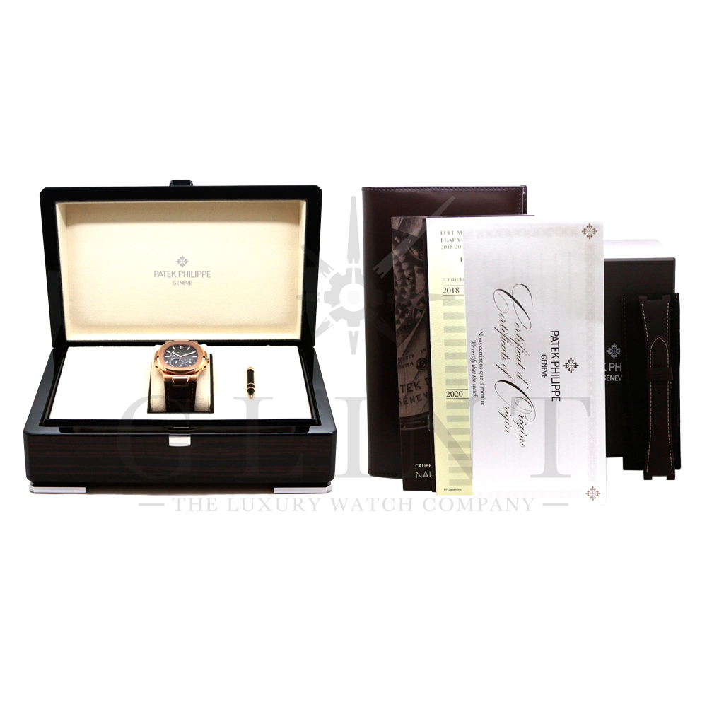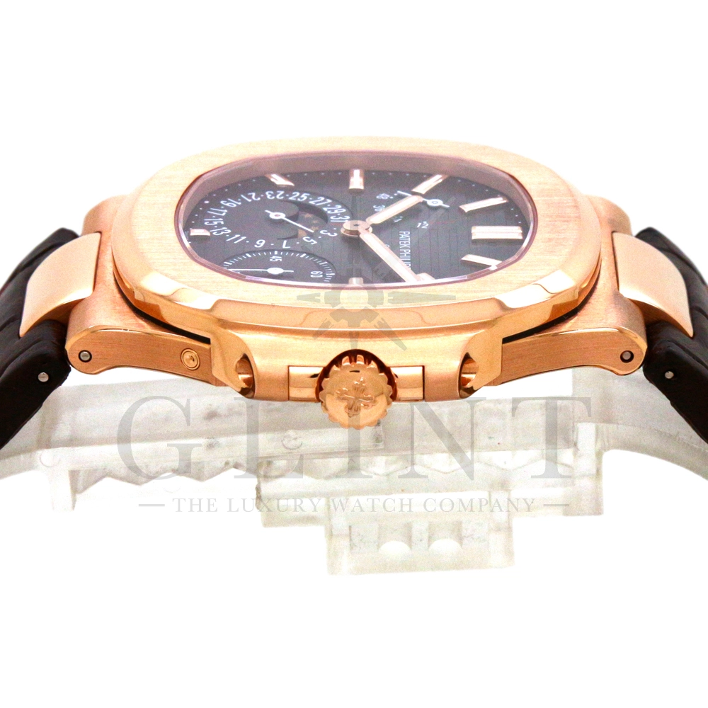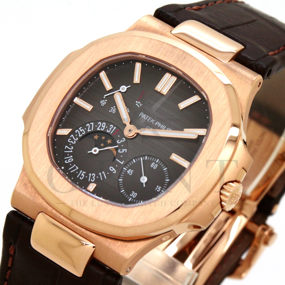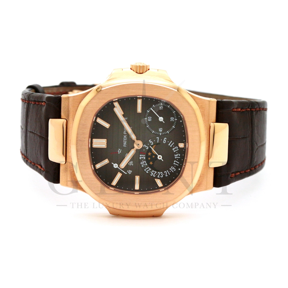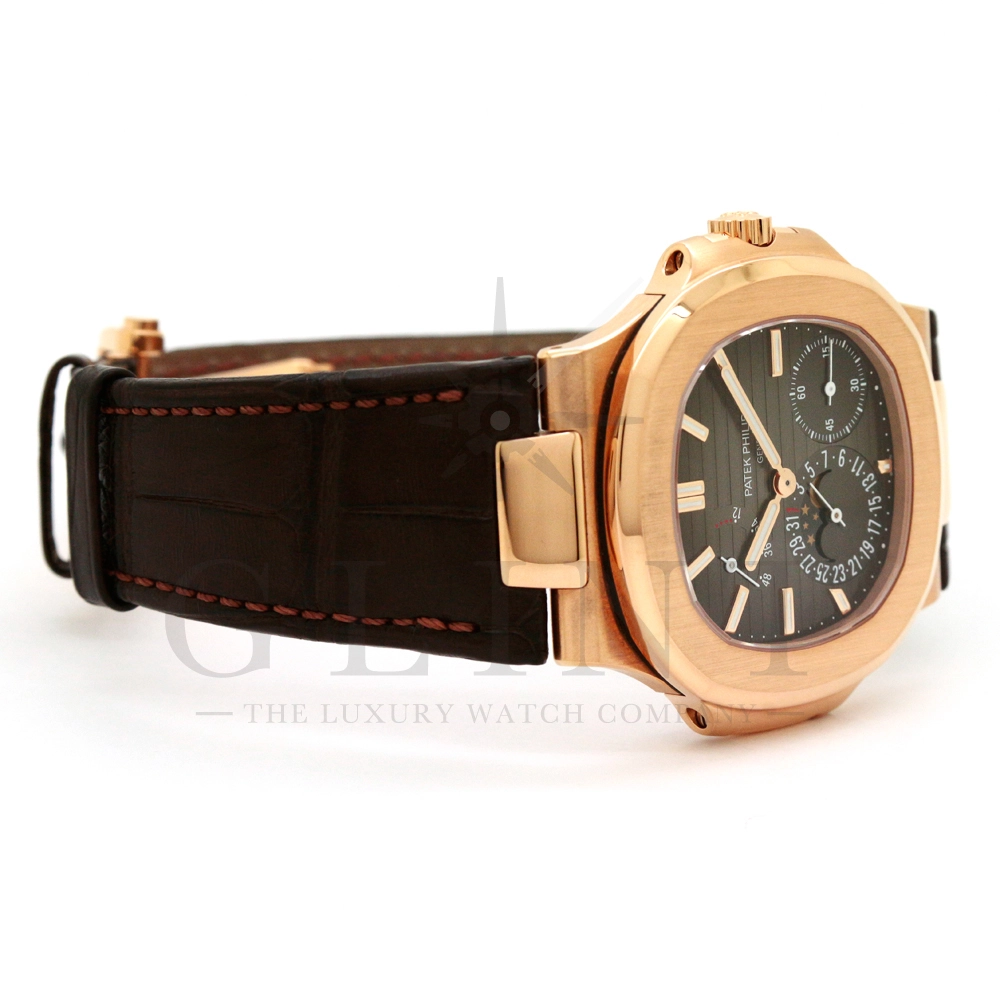 こちらのRef.5712Rはノーチラスが誕生して30周年を迎えた2006年に新たなラインナップとして発表されたたコレクションの中でも高い人気を誇るモデルで、ポインターデイト、ムーンフェイズ、パワーリザーブなど様々な機能を搭載したプチコンプリケーションが魅力の一つです。多機能ながらこれほどまでの薄型を実現する事が出来るのも世界最高水準の時計技術を誇るパテックフィリップだからこそ。そしてケースにはローズゴールドを採用し、エレガンスな印象をより一層強調してくれます。更にはノーチラスシリーズでは初となる革ベルトを採用しており、スポーツモデルながらもフォーマルな印象も与え、ステータス性の高い洗練された大人の雰囲気を演出してくれる魅力的な逸品です。
