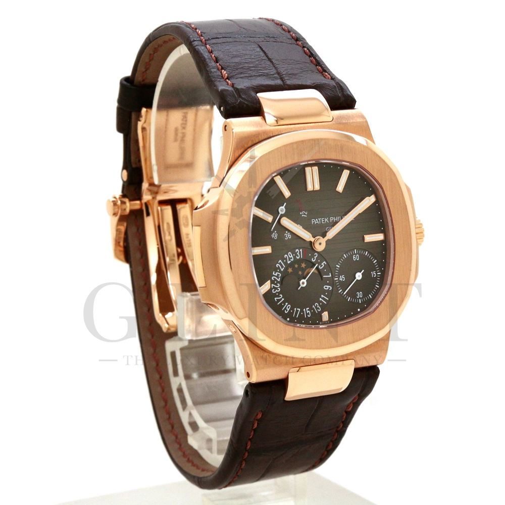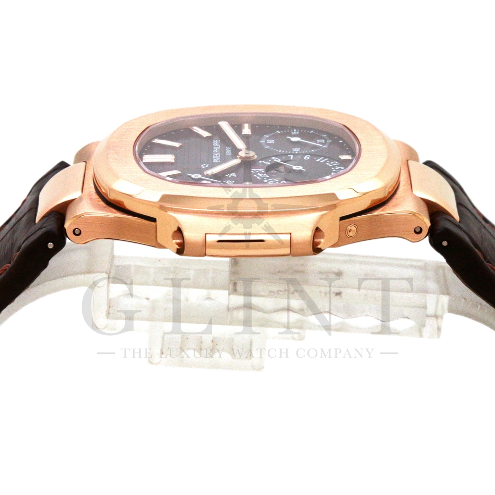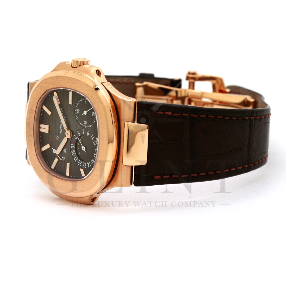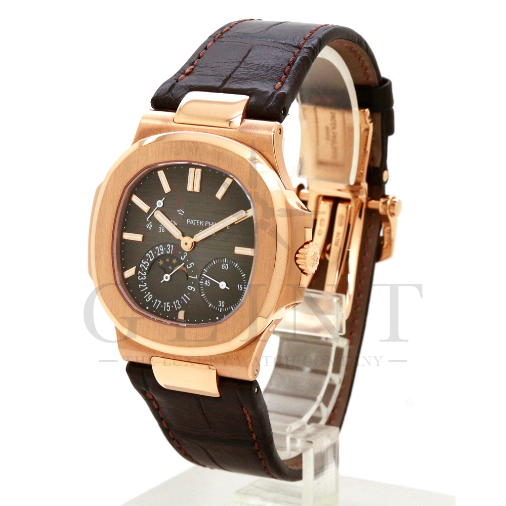 こちらのRef.5712Rはノーチラスが誕生して30周年を迎えた2006年に新たなラインナップとして発表されたたコレクションの中でも高い人気を誇るモデルで、ポインターデイト、ムーンフェイズ、パワーリザーブなど様々な機能を搭載したプチコンプリケーションが魅力の一つです。多機能ながらこれほどまでの薄型を実現する事が出来るのも世界最高水準の時計技術を誇るパテックフィリップだからこそ。そしてケースにはローズゴールドを採用し、エレガンスな印象をより一層強調してくれます。更にはノーチラスシリーズでは初となる革ベルトを採用しており、スポーツモデルながらもフォーマルな印象も与え、ステータス性の高い洗練された大人の雰囲気を演出してくれる魅力的な逸品です。
