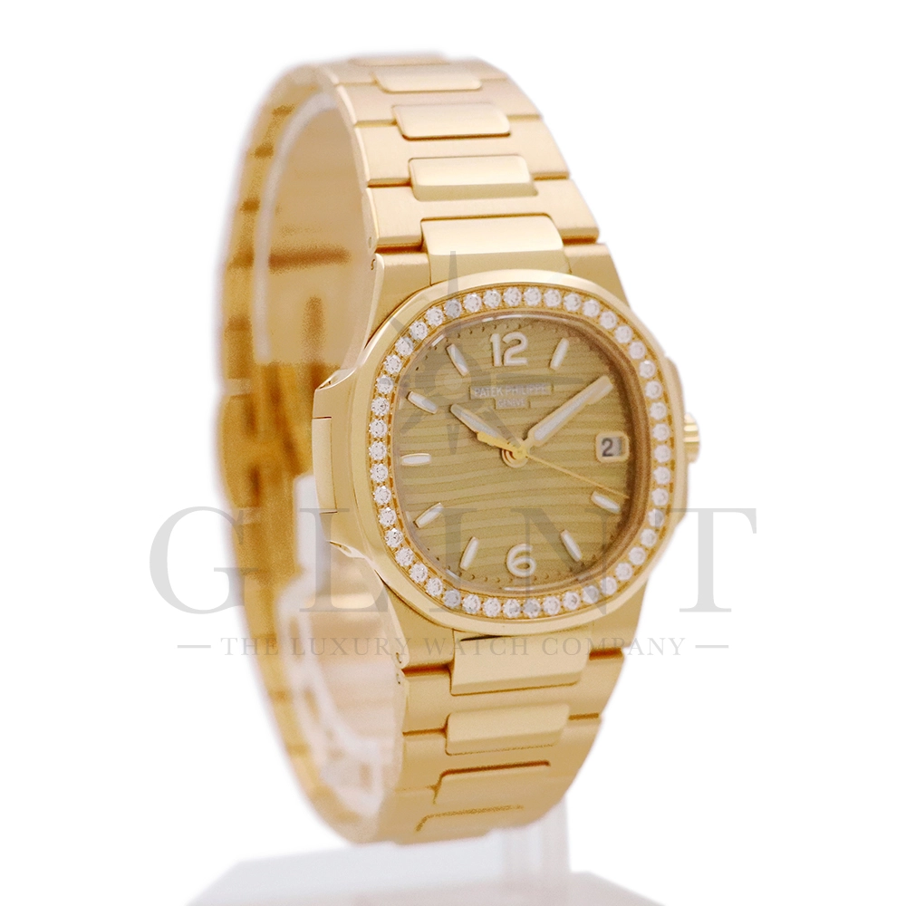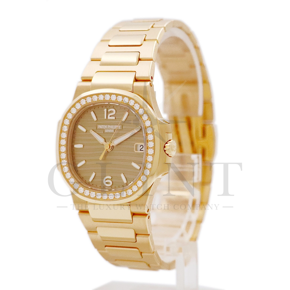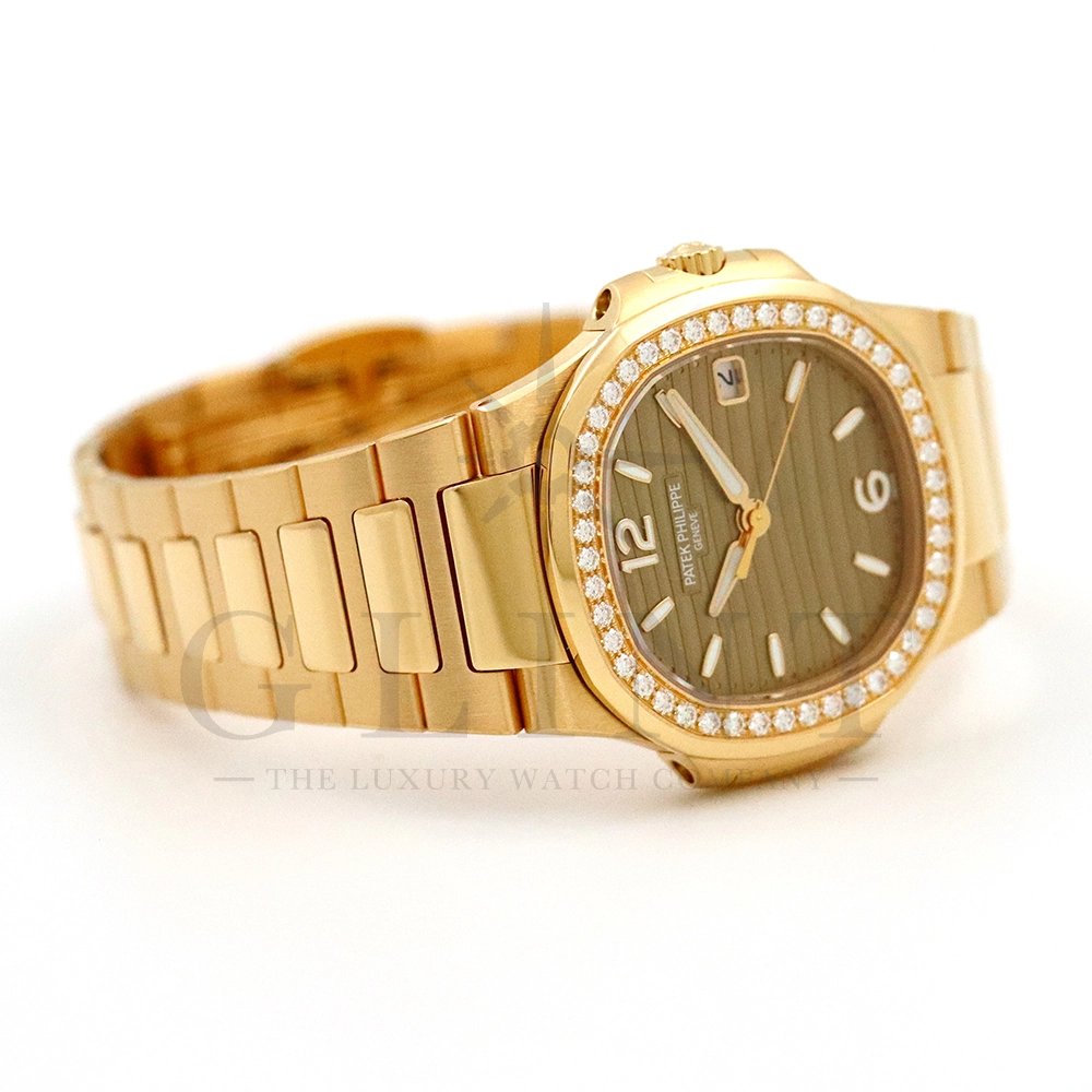 こちらはノーチラス 7010/1R-012です。ケースサイズは32mmでアクセサリー感覚でつけることが出来るサイズ感です。ケース、ブレスレットには18Kローズゴールドを使用し、ベゼルにはIFクラスのダイヤモンドが46個セッティングされ美しい輝きを放っております。ゴールデン・ブラウンの文字盤には水平エンボス模様にウェーブが加えられ、ベゼルのダイヤモンドとローズゴールドのケースと相まって、腕元を華やかに演出し、より一層女性らしさを引き立ててくれるでしょう。ペアでお揃いでお楽しみいただく事もできる洗練された雰囲気と繊細なデザインが魅力の一本です。