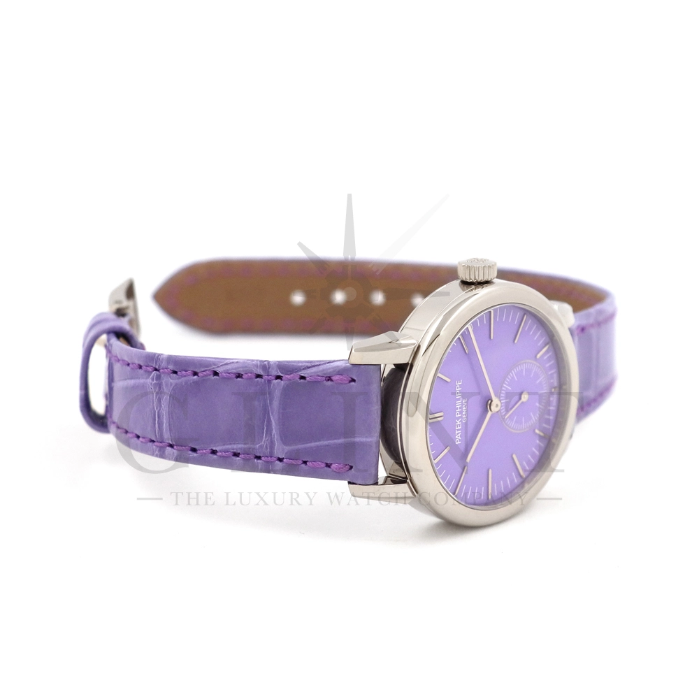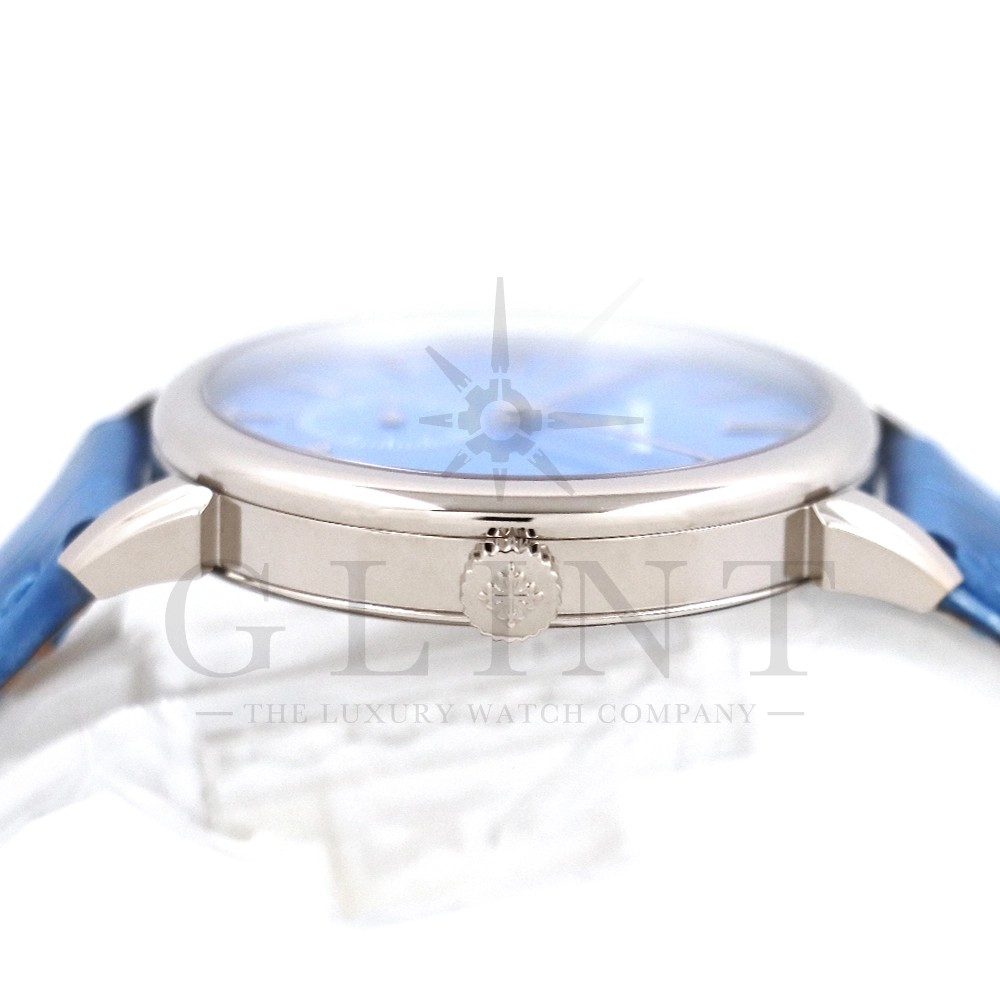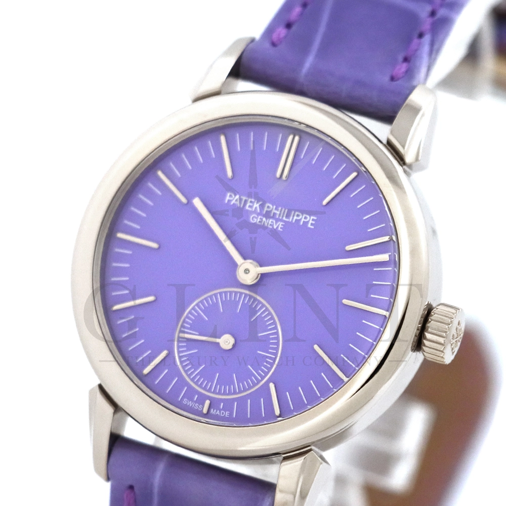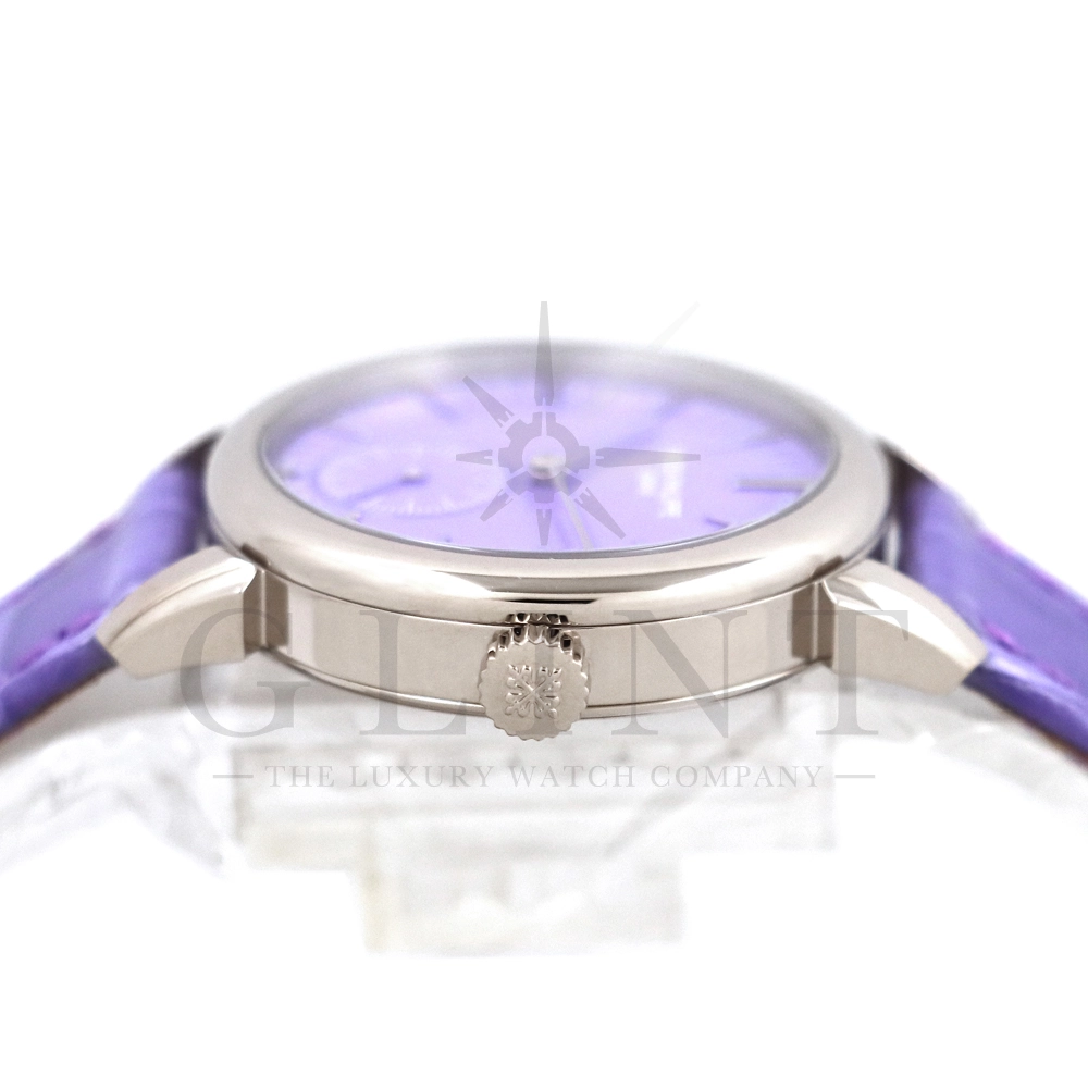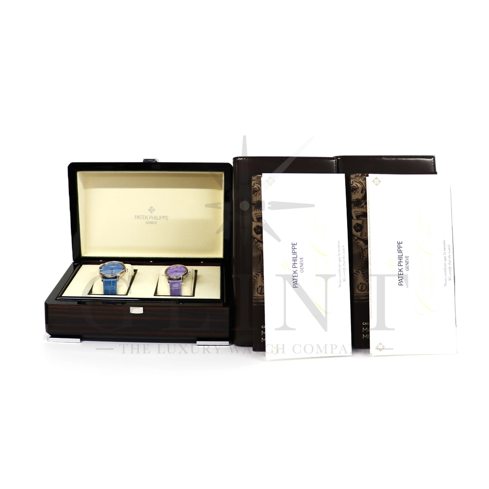 こちらは『ウォッチアート グランド エキシビジョン 東京2023』を記念して発表されたRef.6127G-010、Ref.7127G-010です。各400本生産された内、こちらは300セット限定で販売されたペアウォッチとなります。ケースサイズ36mmの6127G-010はラック・ライトブルー文字盤、ケースサイズ31mmの7127G-010はライラック・トーン文字盤が採用され、それぞれ同色のブリリアント・アリゲーターでまとめられたことによって、一見ポップな印象ながらも老舗メーカーによる繊細で奥深い世界観を味わうことができます。蝶の羽を連想させる5270モデルからインスピレーションを得た2段のベベルカットされたラグ、ホワイトゴールドの植字アワーマーカー、スモールセコンドのリング、そしてスリムなホワイトゴールドのシュヴー型指針など精緻を極めた美しいディテールが特徴的です。そして、ケースバックには「PATEK PHLIPPE TOKYO」のエングレービングが施され、心臓部にはパテック フィリップ最小の機械式ムーブメント(直径21.9mm、厚さ2.55 mm)である手巻キャリバー 215 PSを搭載。更にペアウォッチについては、記念モデルに相応しくダブル・プレゼンテーション・ボックスが付属され、付属品までもが特別仕様となっております。