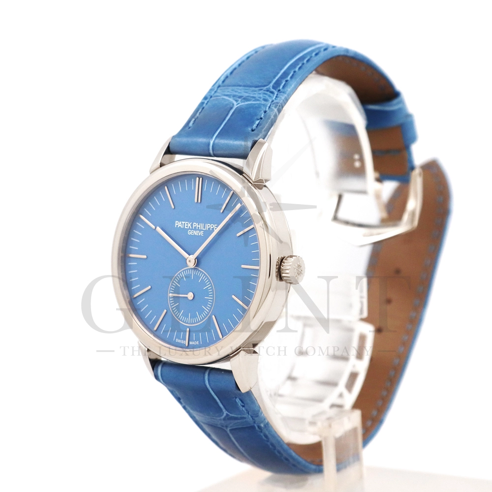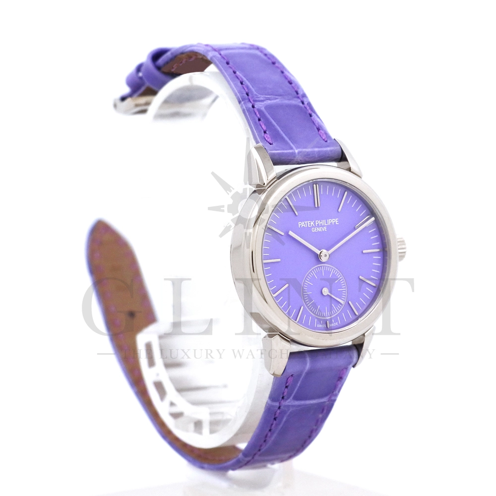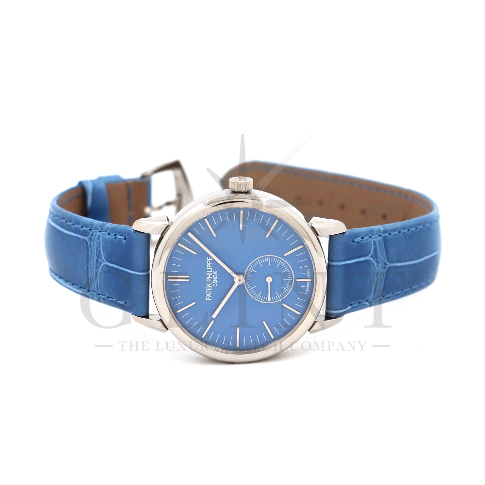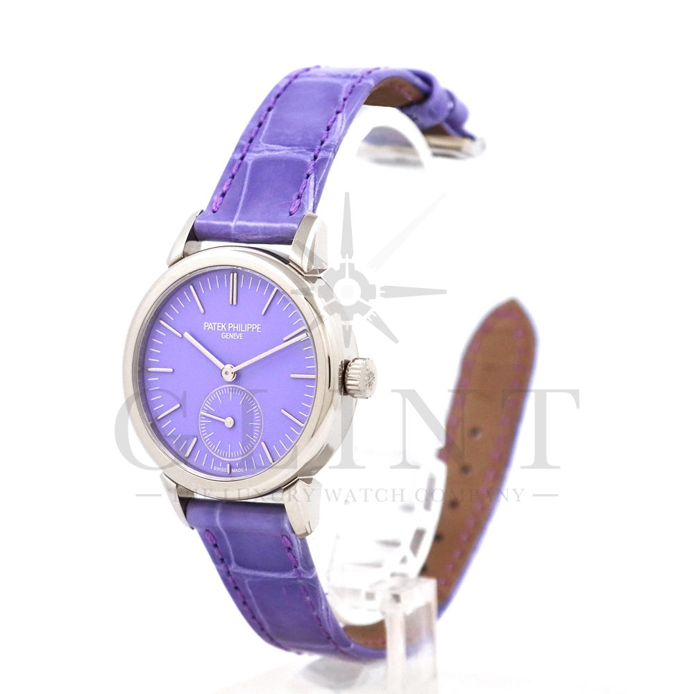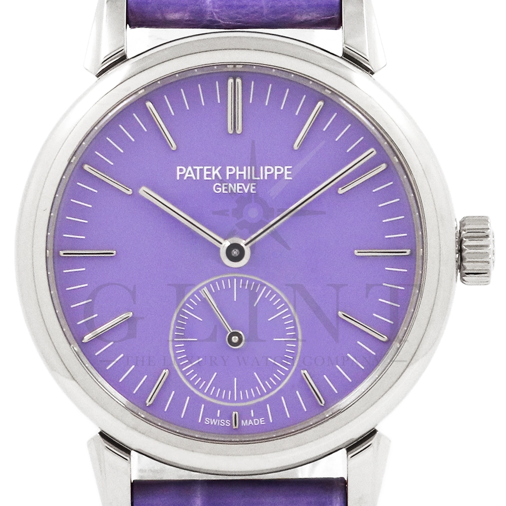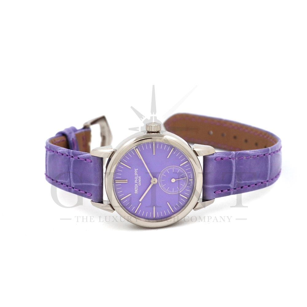 こちらは『ウォッチアート グランド エキシビジョン 東京2023』を記念して発表されたRef.6127G-010、Ref.7127G-010です。各400本生産された内、こちらは300セット限定で販売されたペアウォッチとなります。ケースサイズ36mmの6127G-010はラック・ライトブルー文字盤、ケースサイズ31mmの7127G-010はライラック・トーン文字盤が採用され、それぞれ同色のブリリアント・アリゲーターでまとめられたことによって、一見ポップな印象ながらも老舗メーカーによる繊細で奥深い世界観を味わうことができます。蝶の羽を連想させる5270モデルからインスピレーションを得た2段のベベルカットされたラグ、ホワイトゴールドの植字アワーマーカー、スモールセコンドのリング、そしてスリムなホワイトゴールドのシュヴー型指針など精緻を極めた美しいディテールが特徴的です。そして、ケースバックには「PATEK PHLIPPE TOKYO」のエングレービングが施され、心臓部にはパテック フィリップ最小の機械式ムーブメント(直径21.9mm、厚さ2.55 mm)である手巻キャリバー 215 PSを搭載。更にペアウォッチについては、記念モデルに相応しくダブル・プレゼンテーション・ボックスが付属され、付属品までもが特別仕様となっております。