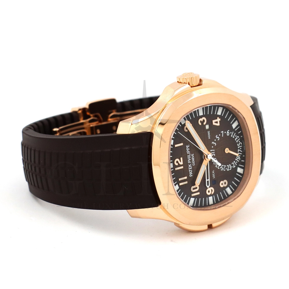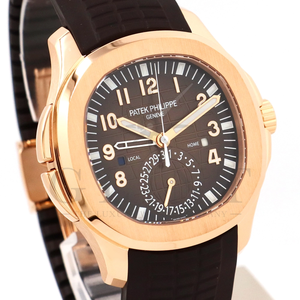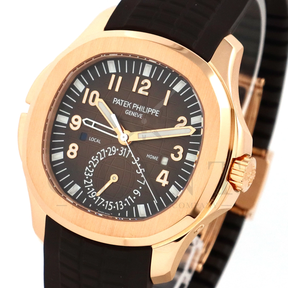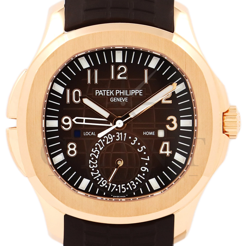 2016年に発表された5164R-001です。ステンレスモデルしか展開されていなかったアクアノート トラベルタイムにローズゴールドモデルが登場。トラベルタイムは重なり合う2本の時針により、2つの異なったタイムゾーンの時刻を一目で判るように表示する機構で、こちらのモデルは出発地と現地の2つの昼夜窓表示を搭載するなど、より実用性に特化した仕様となっております。更には、12気圧防水、ねじ込み式リュウズ、海水にも耐えるコンポジット素材を採用したトロピカルバンドが最高の安全性を保証。そして美しい文字盤の構造的なデザインは、トロピカルバンドのモチーフと統一されており、丸みを帯びた八角形の驚くほどモダンなフォルムが、アクアノートの魅力を存分に引き出してくれます。新型バックルの5164R-001を入荷いたしました。こちらは保証書の写し付きとなります。時計界に数々の金字塔を打ち立てた名門パテックフィリップが送り出す創造性あふれるデザインと最高水準の技術が結集されたアクアノートトラベルタイム。特にグローバルなビジネスシーンやプライベート旅行を楽しまれる方にお勧めの逸品です。