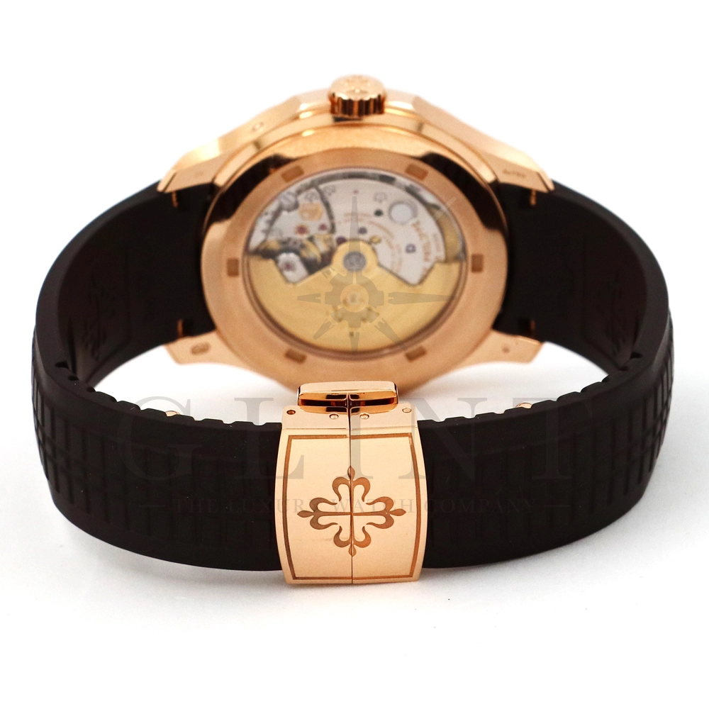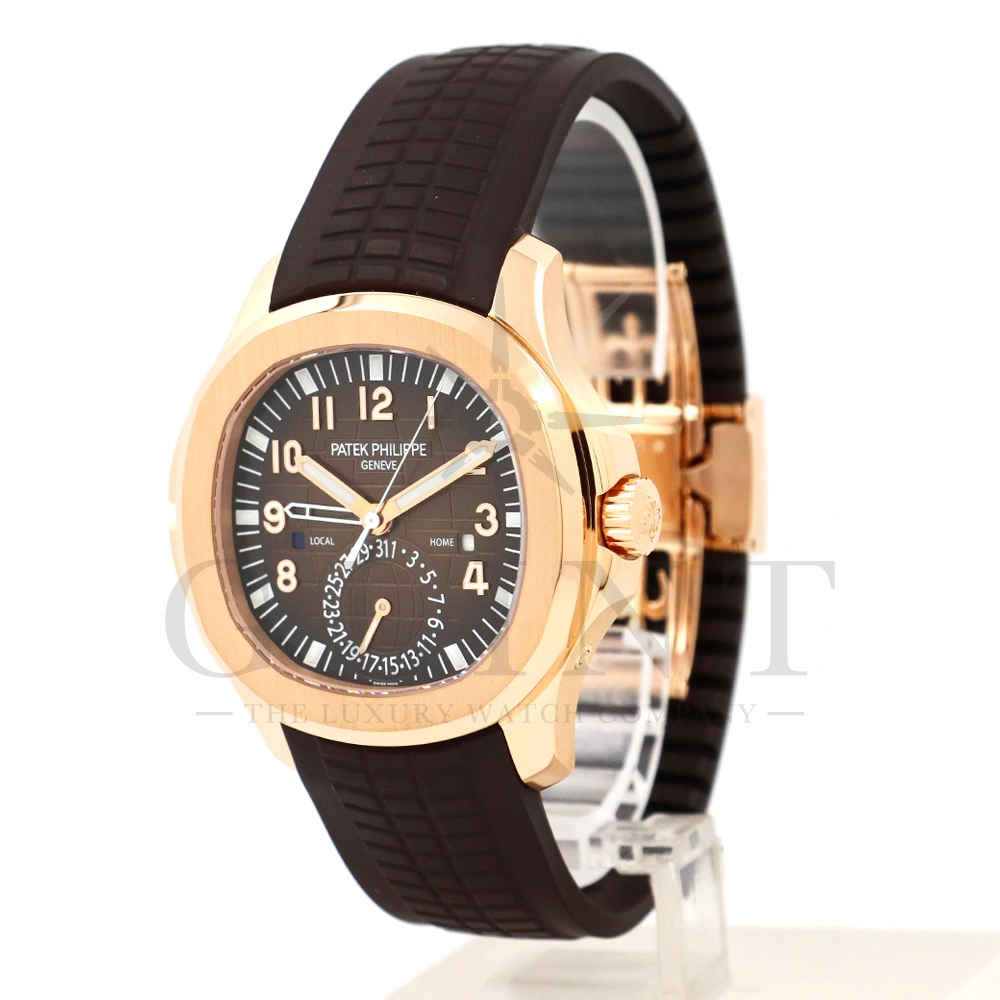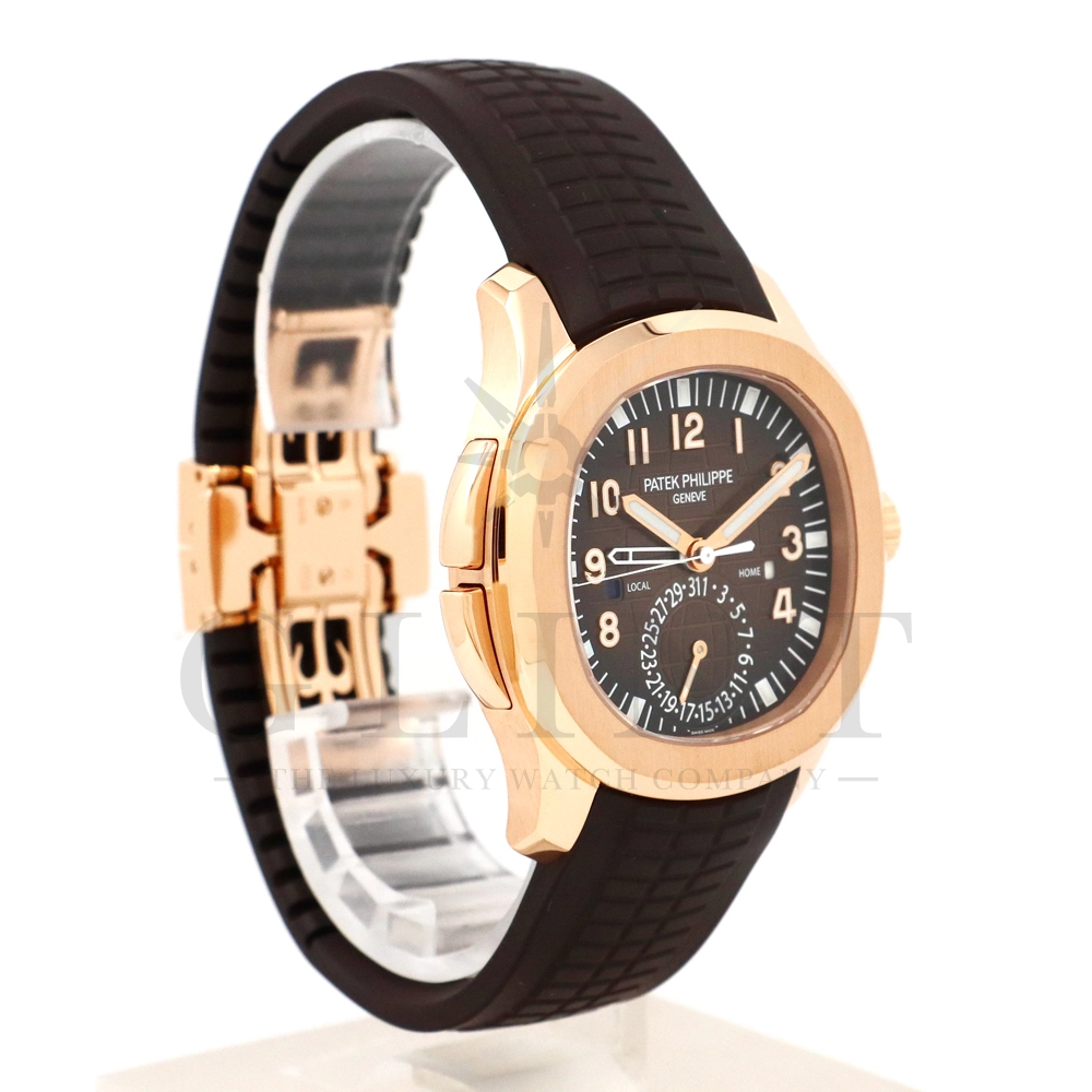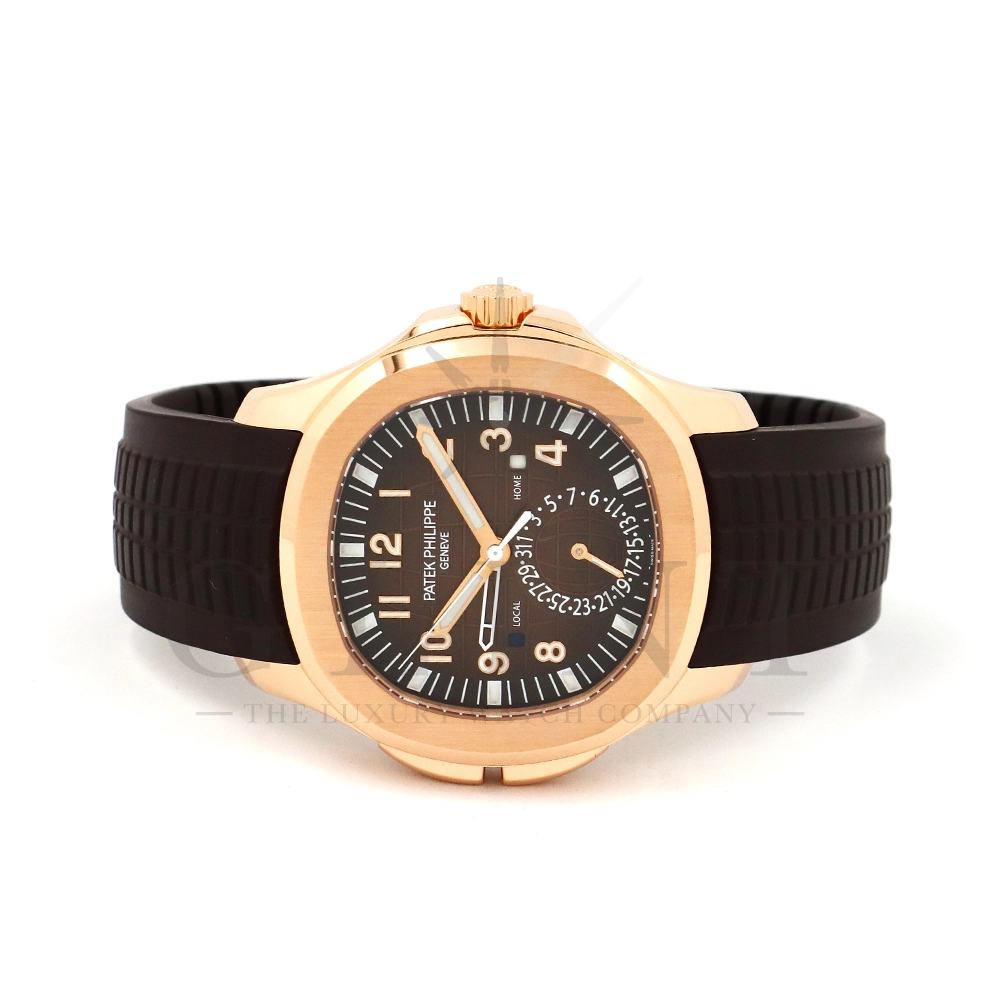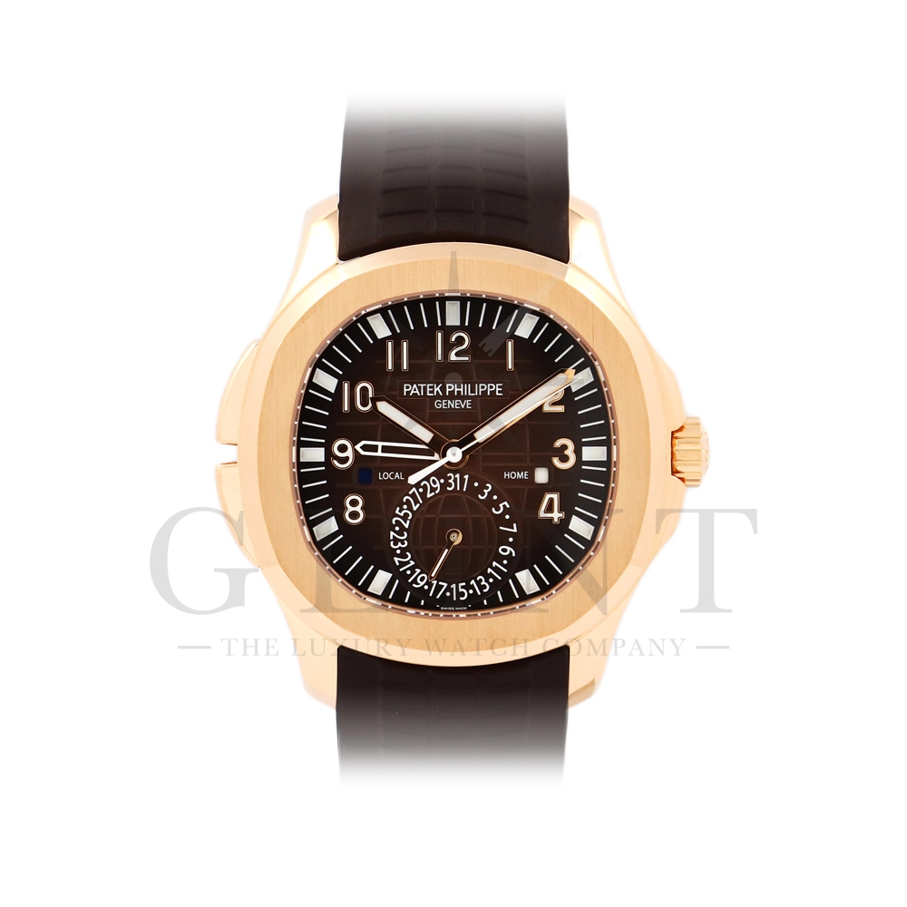 2016年に発表された5164R-001です。ステンレスモデルしか展開されていなかったアクアノート トラベルタイムにローズゴールドモデルが登場。トラベルタイムは重なり合う2本の時針により、2つの異なったタイムゾーンの時刻を一目で判るように表示する機構で、こちらのモデルは出発地と現地の2つの昼夜窓表示を搭載するなど、より実用性に特化した仕様となっております。更には、12気圧防水、ねじ込み式リュウズ、海水にも耐えるコンポジット素材を採用したトロピカルバンドが最高の安全性を保証。そして美しい文字盤の構造的なデザインは、トロピカルバンドのモチーフと統一されており、丸みを帯びた八角形の驚くほどモダンなフォルムが、アクアノートの魅力を存分に引き出してくれます。新型バックルの5164R-001を入荷いたしました。こちらは保証書の写し付きとなります。時計界に数々の金字塔を打ち立てた名門パテックフィリップが送り出す創造性あふれるデザインと最高水準の技術が結集されたアクアノートトラベルタイム。特にグローバルなビジネスシーンやプライベート旅行を楽しまれる方にお勧めの逸品です。