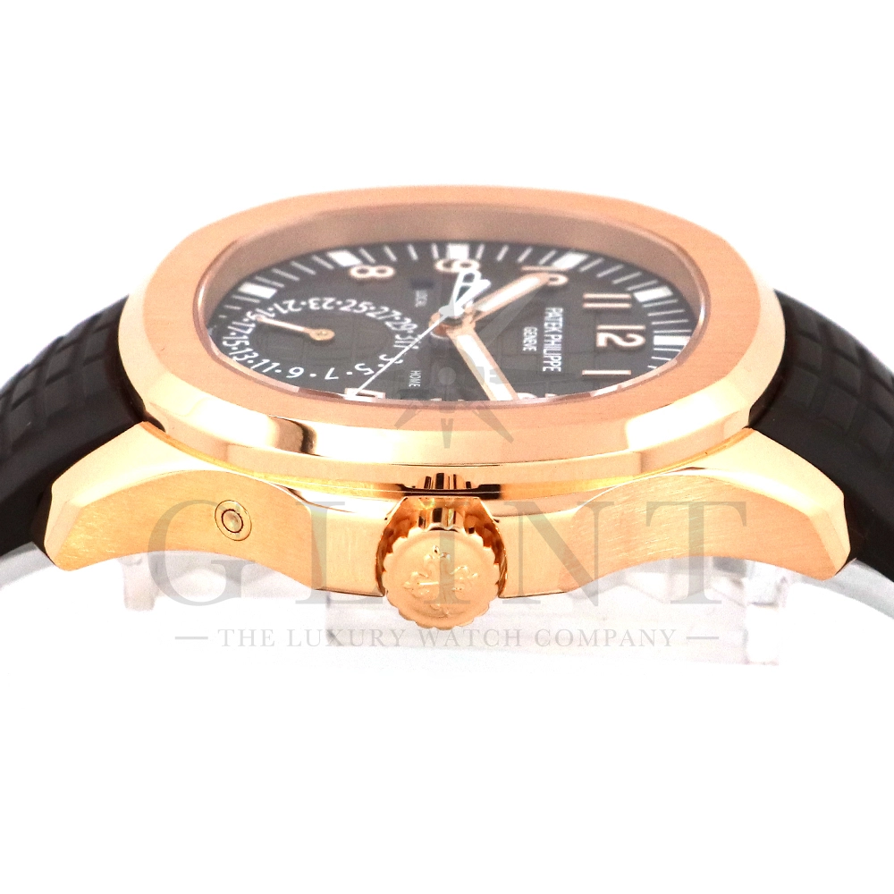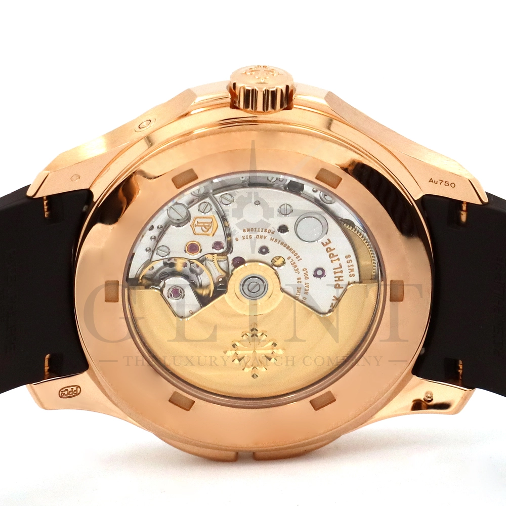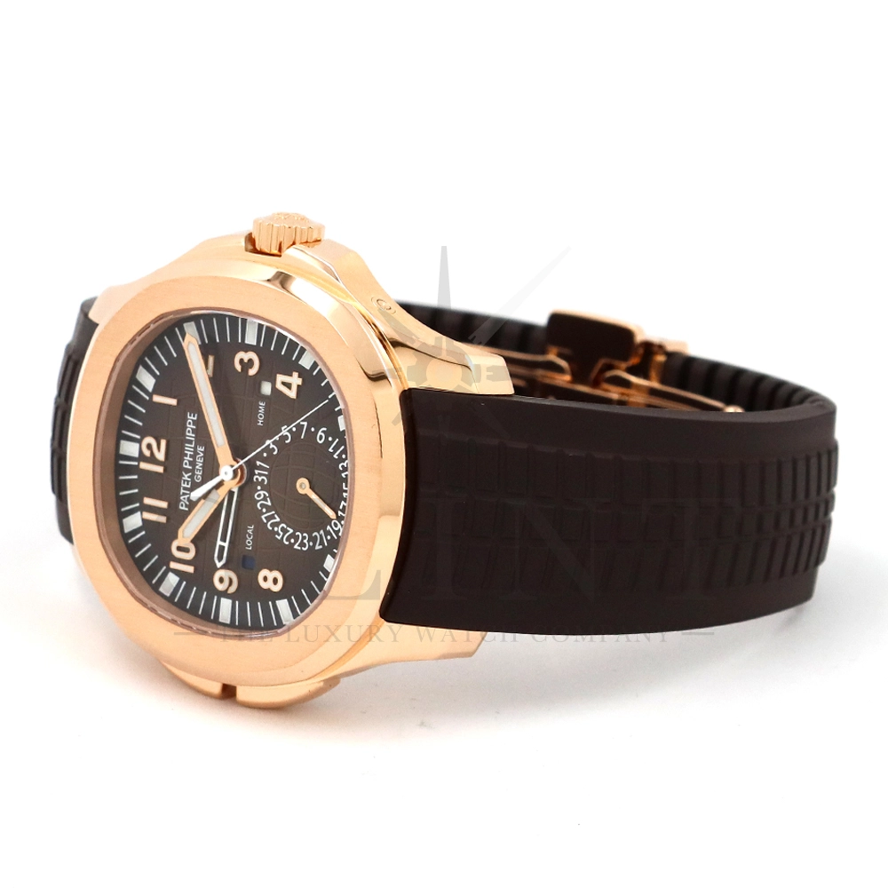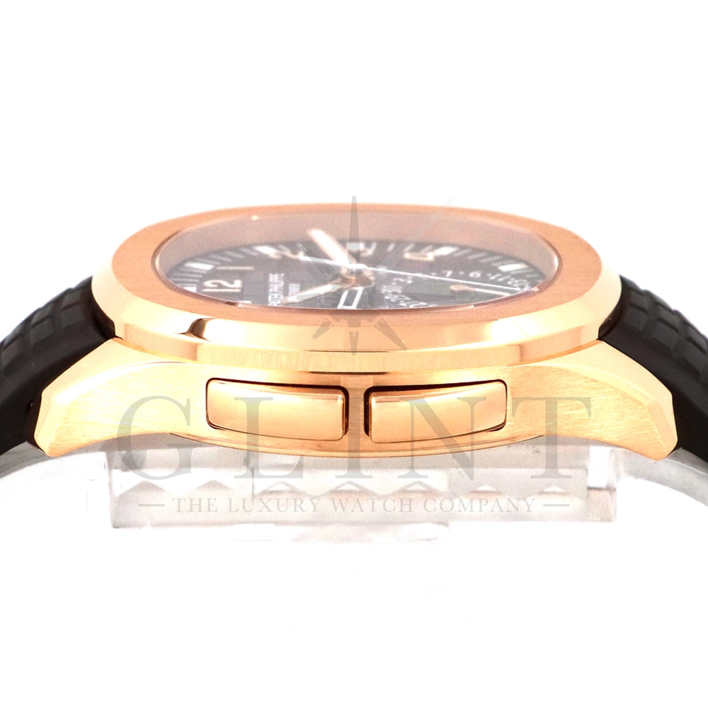 2016年に発表された5164R-001です。ステンレスモデルしか展開されていなかったアクアノート トラベルタイムにローズゴールドモデルが登場。トラベルタイムは重なり合う2本の時針により、2つの異なったタイムゾーンの時刻を一目で判るように表示する機構で、こちらのモデルは出発地と現地の2つの昼夜窓表示を搭載するなど、より実用性に特化した仕様となっております。更には、12気圧防水、ねじ込み式リュウズ、海水にも耐えるコンポジット素材を採用したトロピカルバンドが最高の安全性を保証。そして美しい文字盤の構造的なデザインは、トロピカルバンドのモチーフと統一されており、丸みを帯びた八角形の驚くほどモダンなフォルムが、アクアノートの魅力を存分に引き出してくれます。新型バックルの5164R-001を入荷いたしました。こちらは保証書の写し付きとなります。時計界に数々の金字塔を打ち立てた名門パテックフィリップが送り出す創造性あふれるデザインと最高水準の技術が結集されたアクアノートトラベルタイム。特にグローバルなビジネスシーンやプライベート旅行を楽しまれる方にお勧めの逸品です。