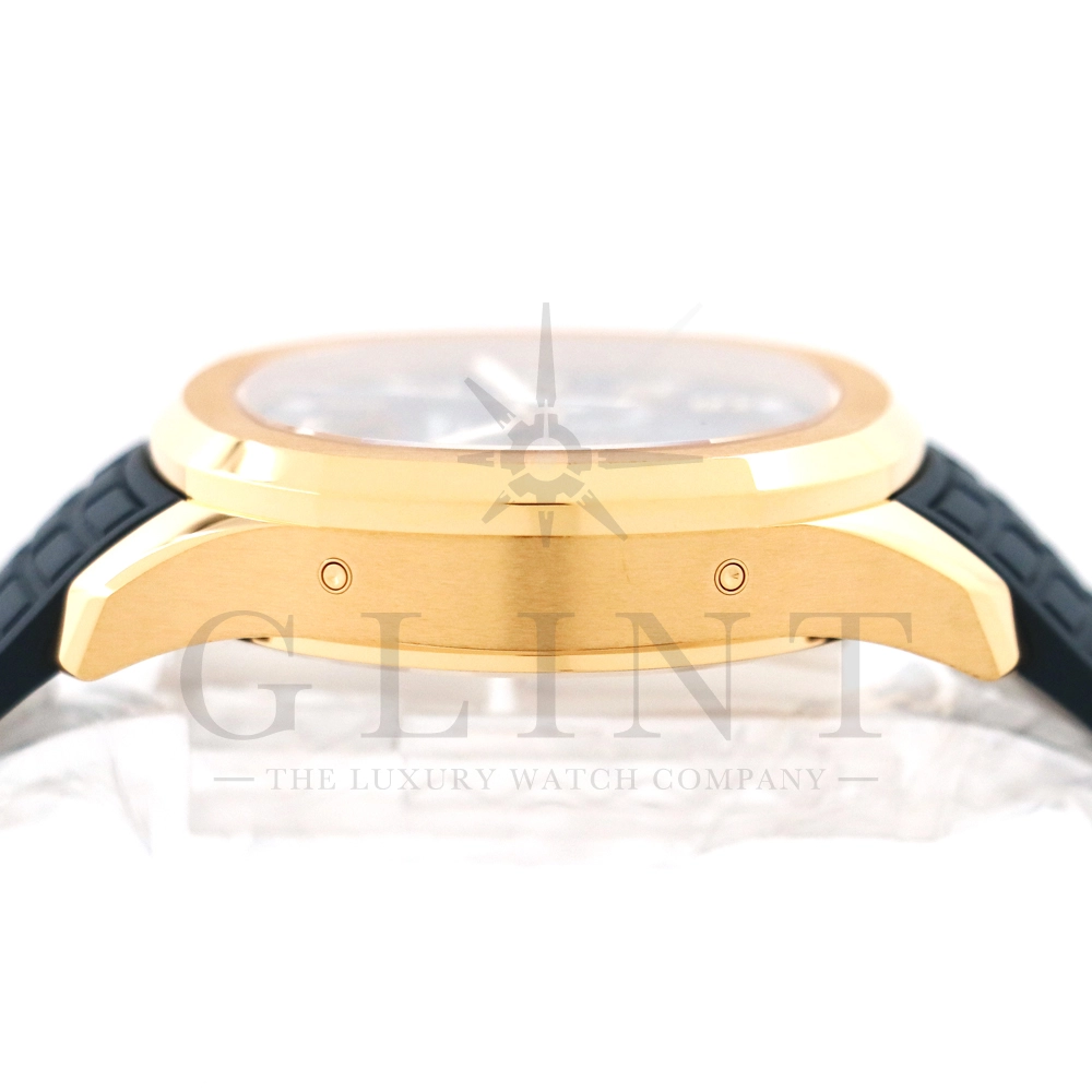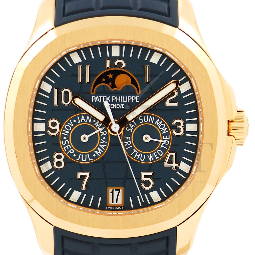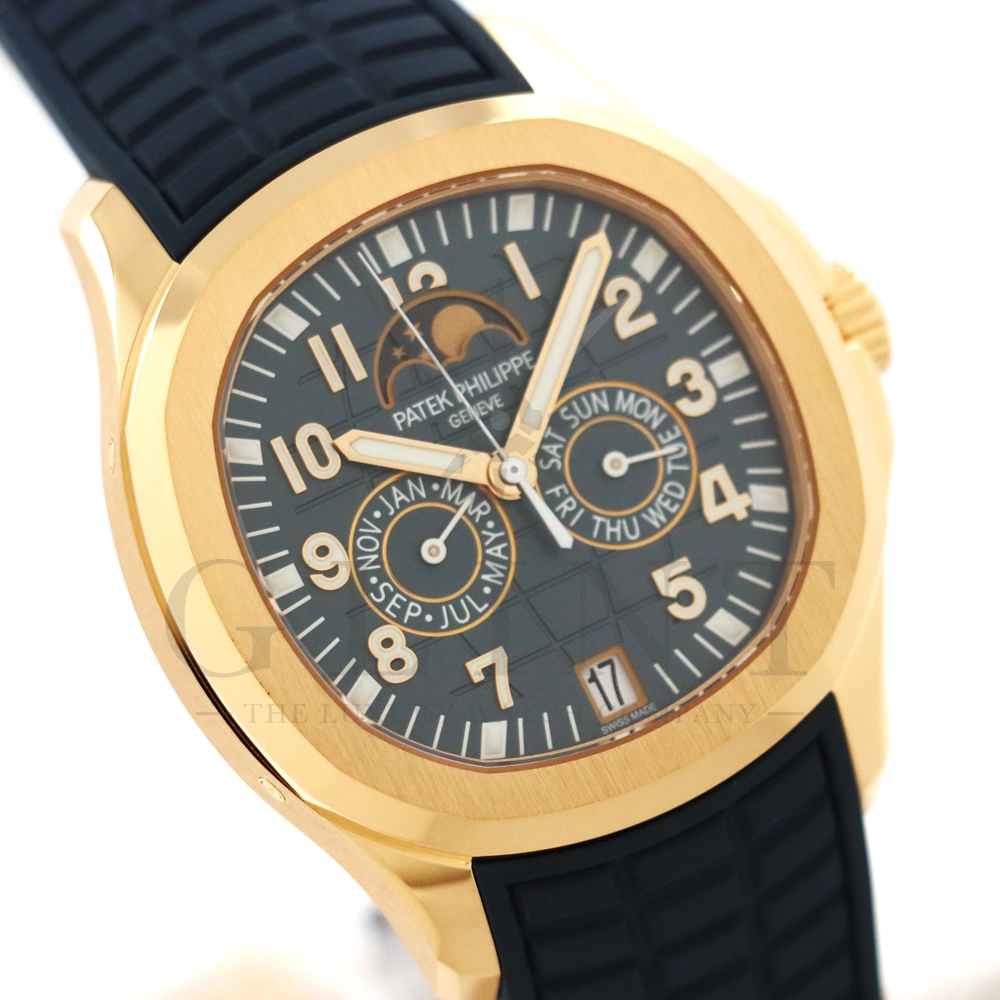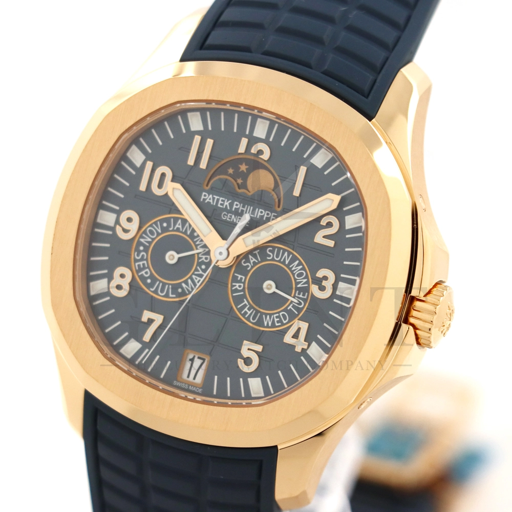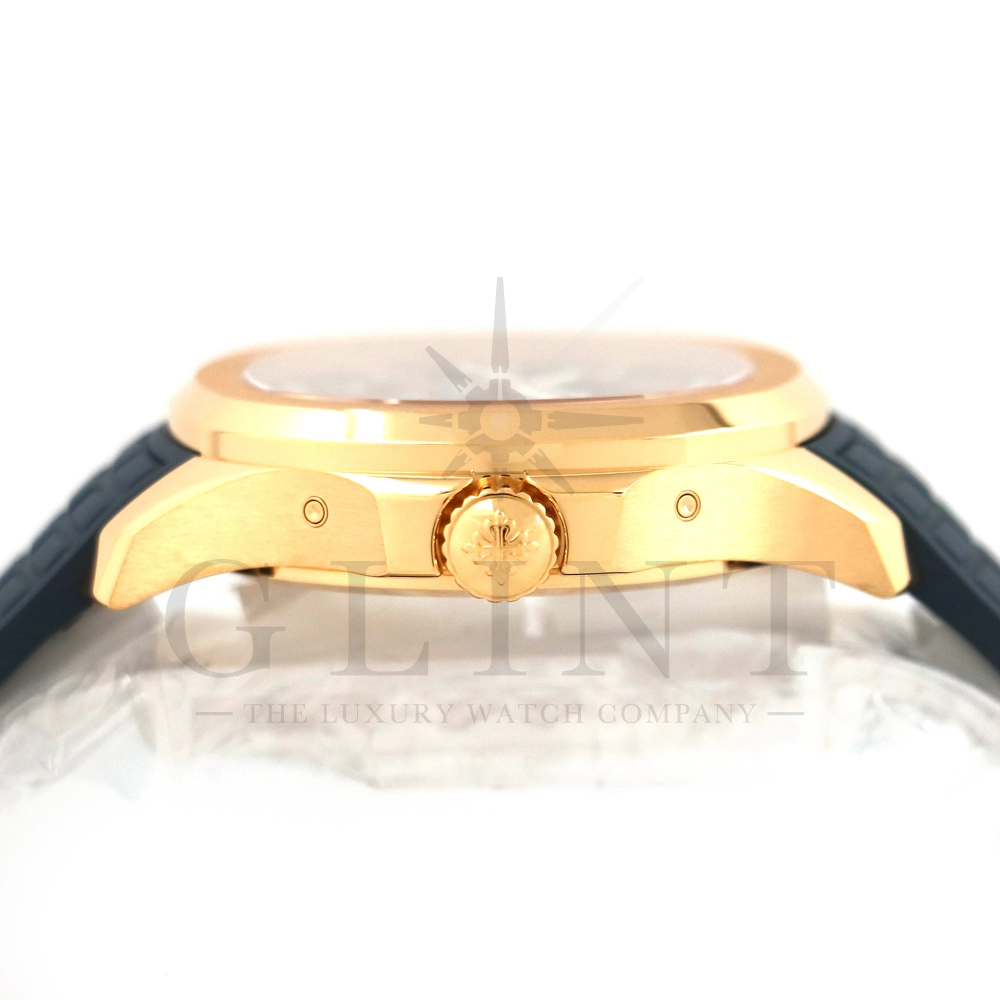 こちらは2023年新作モデルのアクアノート・ルーチェ 5261R-001です。特許取得の年次カレンダーを搭載し、婦人用コンプリケーテッド・ウォッチのレパートリーに、新たにジュエリーのないモデルが加わりました。39.9mmのローズゴールドケースとベゼルの丸みを帯びた8角形の象徴的なデザインは、ポリッシュ仕上げとサテン仕上げが生み出すコントラストによって強調されています。ブルーグレーの文字盤とアクアノート・パターンのコンポジット・バンドが、このモデルの《コンテンポラリー・カジュアル・シック》なスタイルを際立たせています。新たに進化したアクアノート・ルーチェは必ずや所有者を満足させてくれるタイムピースです。