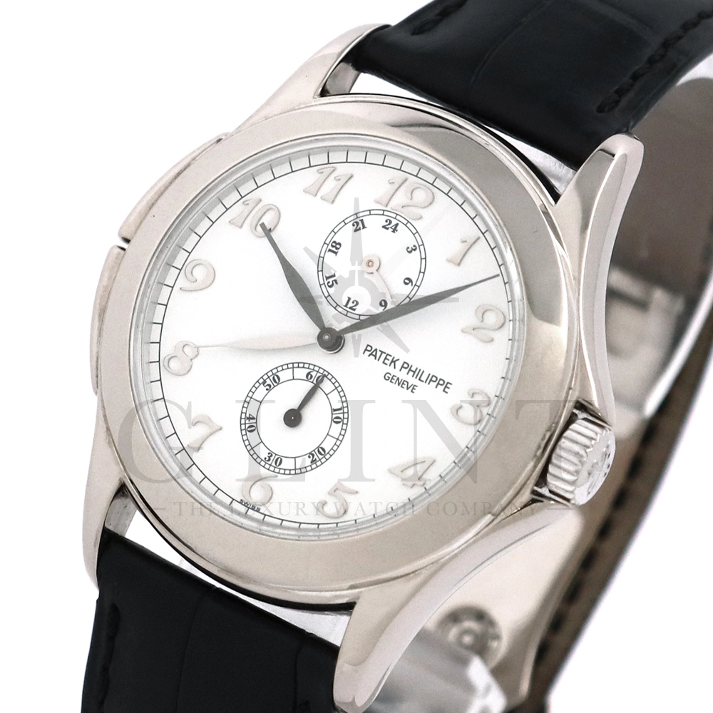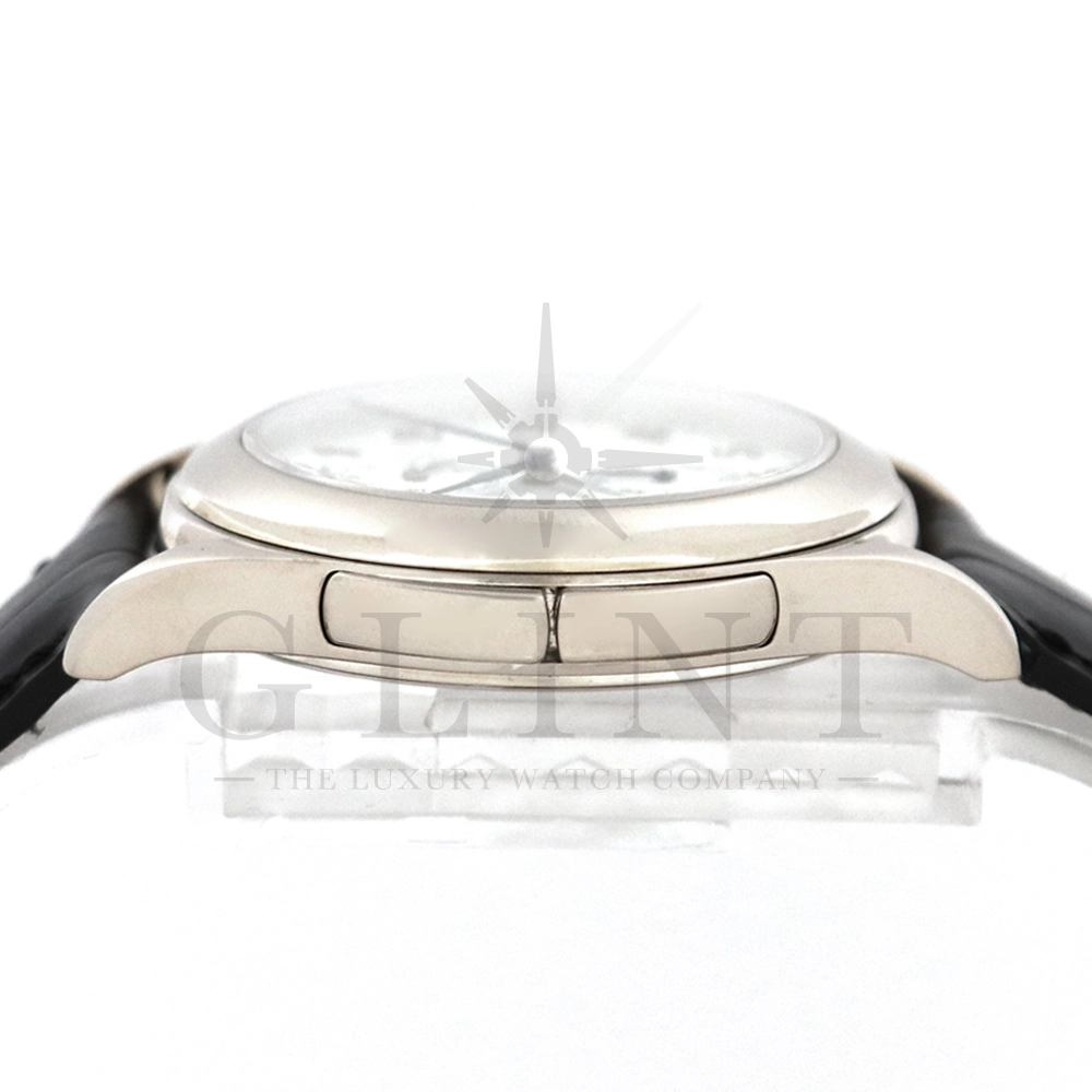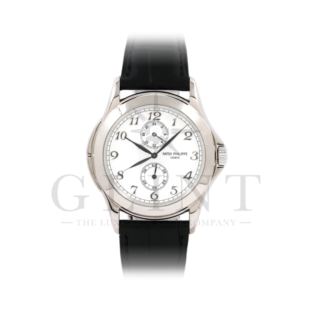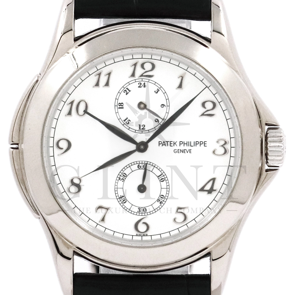 こちらはカラトラバ トラベルタイム 5134G-001です。2001~2008年まで製造されたモデルで2本ある時針で2つの異なる国の時刻を同時に表示できるパテックフィリップを代表するコンプリケーションウォッチ。18Kホワイトゴールド製のケースサイドのプッシュボタンで容易に調整が可能となっております。3時位置のリューズガードと同化するデザインで絶妙なバランスです。爽やかなシルバー文字盤の12時位置には24時間表示、6時位置にはスモールセコンドとなっております。ムーブメントには手巻き キャリバー215PS FUS 24Hを搭載。ケースバックからジュネーブシール取得の美しく仕上げられたキャリバーを堪能できるでしょう。落ち着いた雰囲気でクラシカルな印象を与えてくれる一本です。