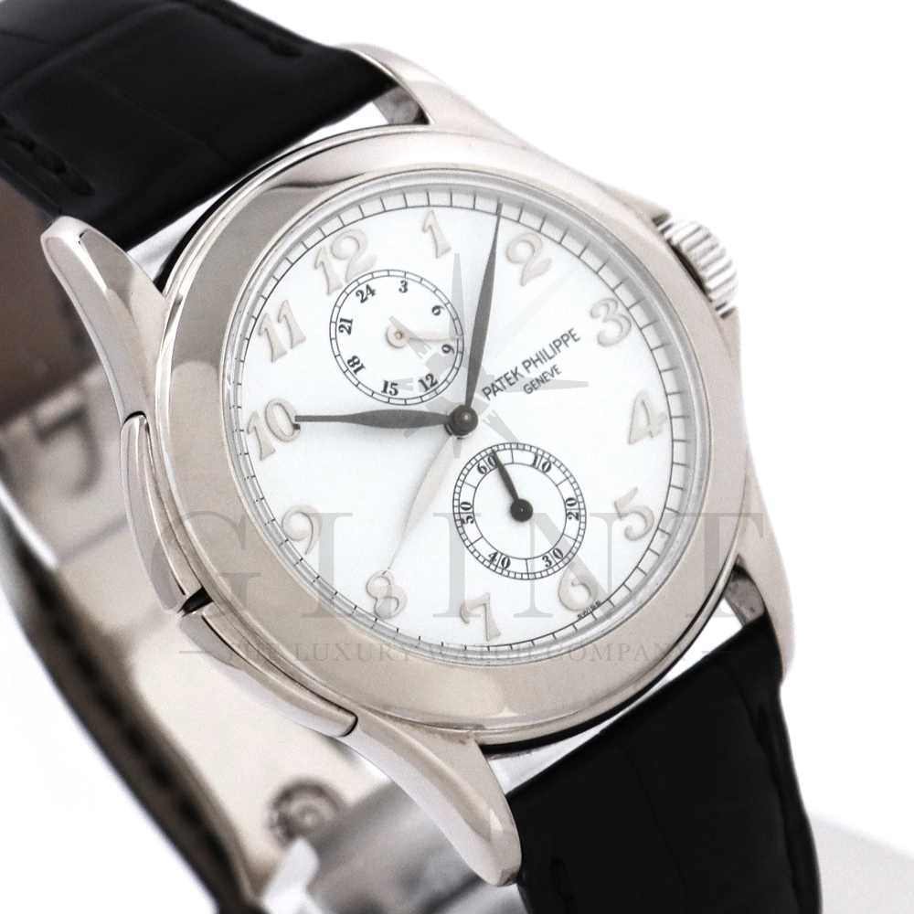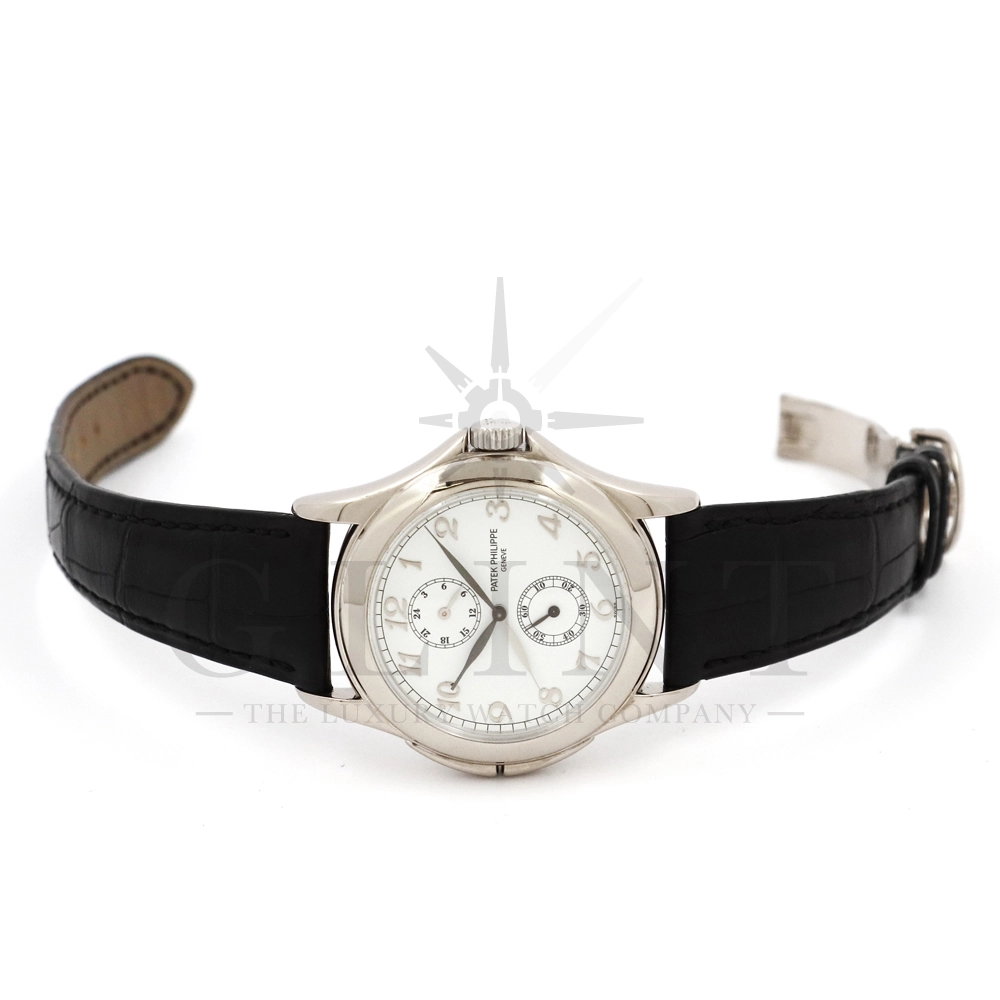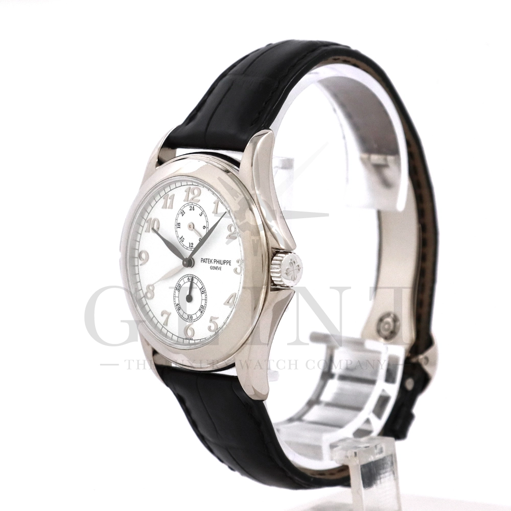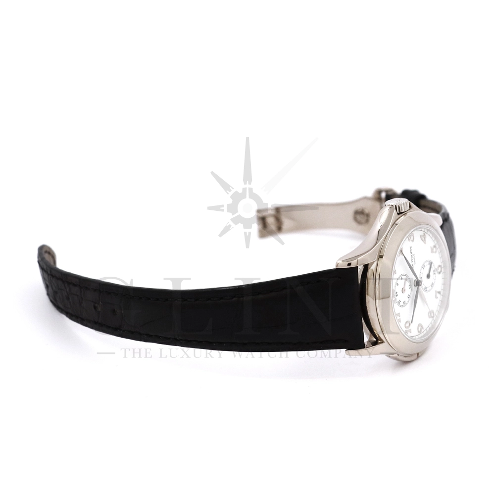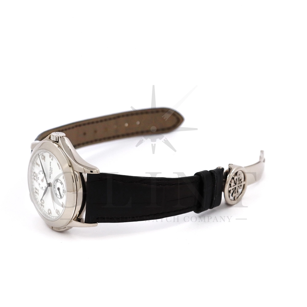 こちらはカラトラバ トラベルタイム 5134G-001です。2001~2008年まで製造されたモデルで2本ある時針で2つの異なる国の時刻を同時に表示できるパテックフィリップを代表するコンプリケーションウォッチ。18Kホワイトゴールド製のケースサイドのプッシュボタンで容易に調整が可能となっております。3時位置のリューズガードと同化するデザインで絶妙なバランスです。爽やかなシルバー文字盤の12時位置には24時間表示、6時位置にはスモールセコンドとなっております。ムーブメントには手巻き キャリバー215PS FUS 24Hを搭載。ケースバックからジュネーブシール取得の美しく仕上げられたキャリバーを堪能できるでしょう。落ち着いた雰囲気でクラシカルな印象を与えてくれる一本です。