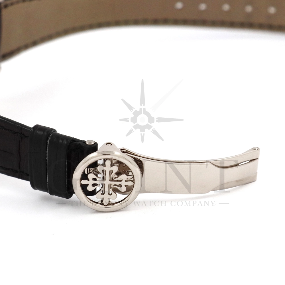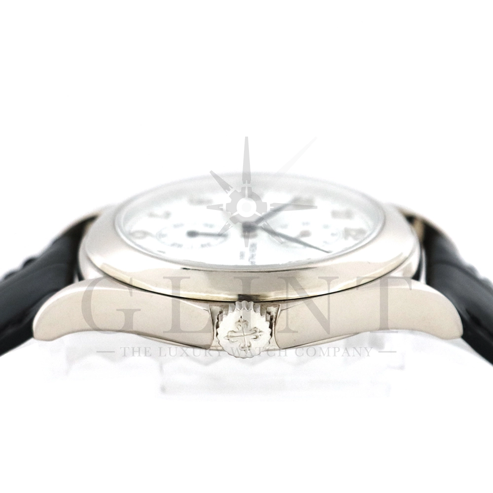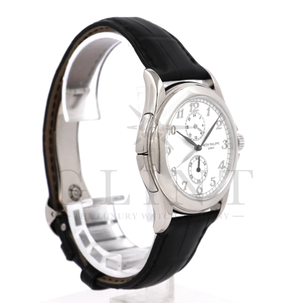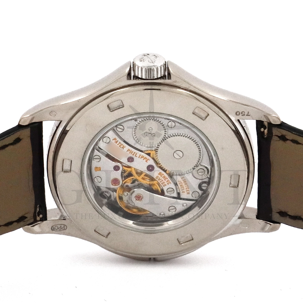 こちらはカラトラバ トラベルタイム 5134G-001です。2001~2008年まで製造されたモデルで2本ある時針で2つの異なる国の時刻を同時に表示できるパテックフィリップを代表するコンプリケーションウォッチ。18Kホワイトゴールド製のケースサイドのプッシュボタンで容易に調整が可能となっております。3時位置のリューズガードと同化するデザインで絶妙なバランスです。爽やかなシルバー文字盤の12時位置には24時間表示、6時位置にはスモールセコンドとなっております。ムーブメントには手巻き キャリバー215PS FUS 24Hを搭載。ケースバックからジュネーブシール取得の美しく仕上げられたキャリバーを堪能できるでしょう。落ち着いた雰囲気でクラシカルな印象を与えてくれる一本です。