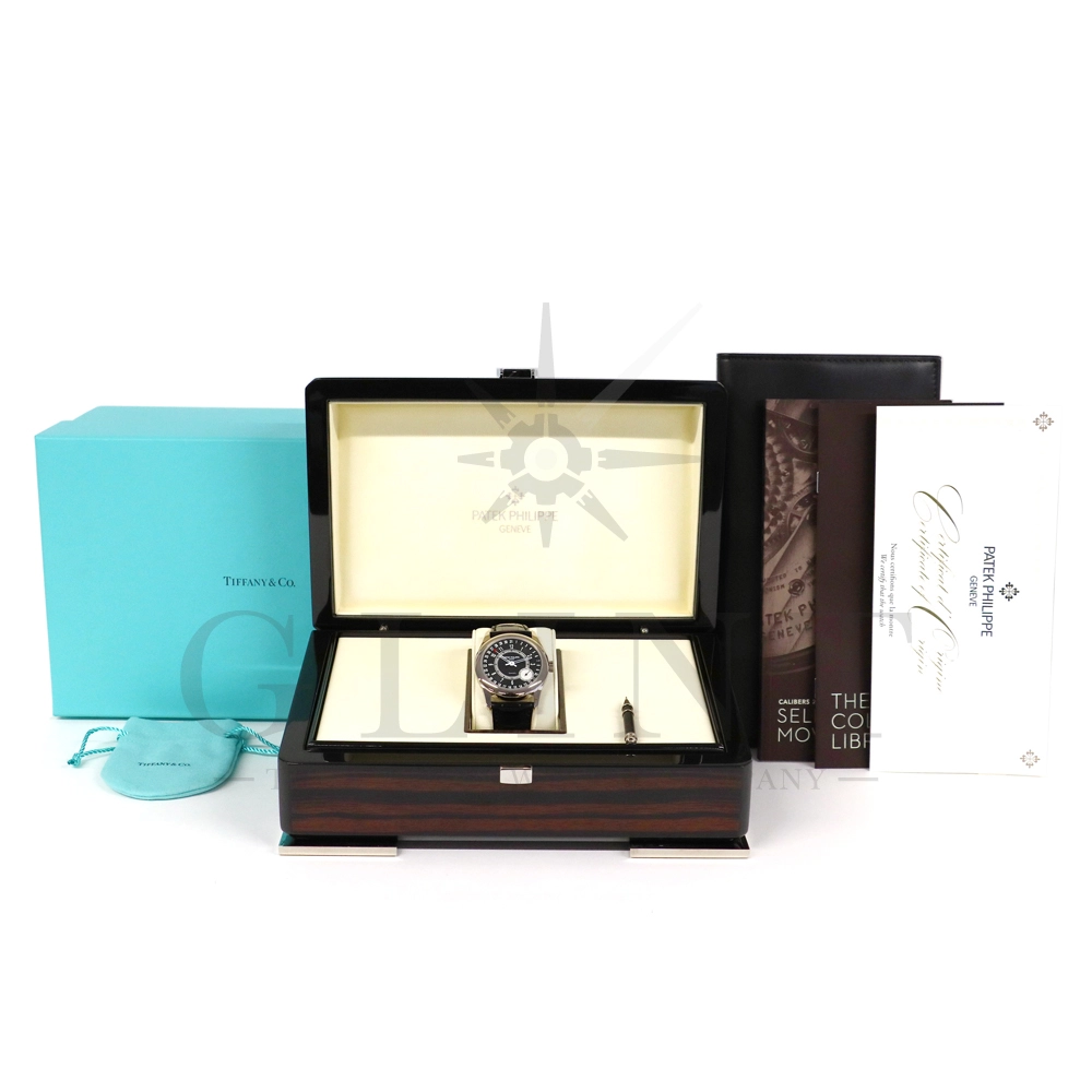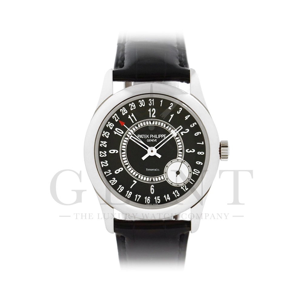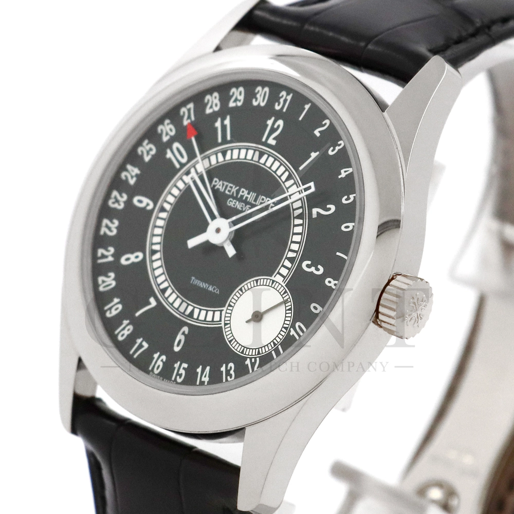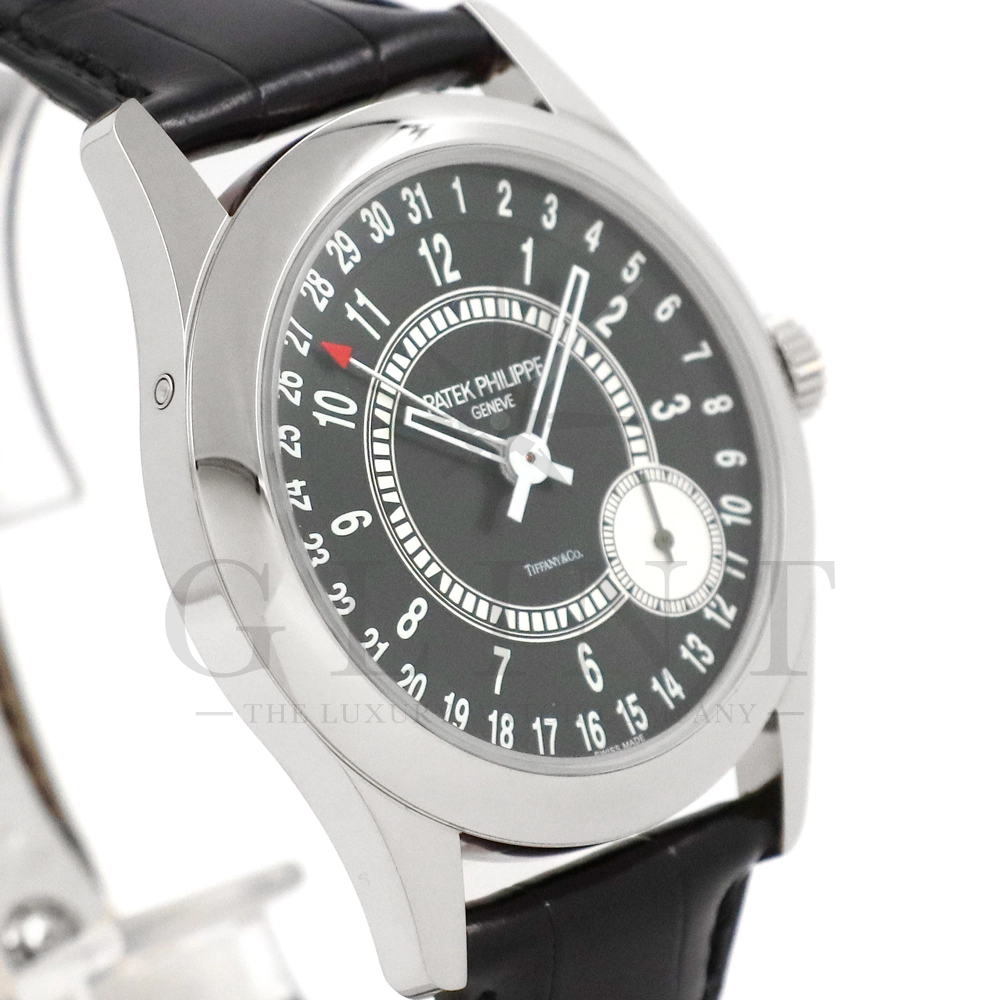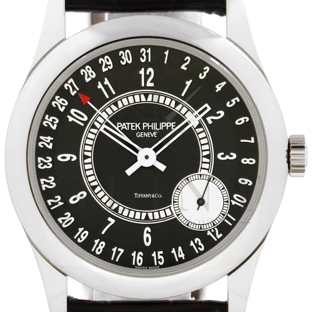 こちらはパテックフィリップ カラトラバ ティファニーWネームです。パテック フィリップは過去にティファニーやカルティエ、ギュブランなどの宝飾ブランドと結びつきがあり、その中でもティファニーとの歴史は長く、1851年にパートナーシップ契約を結んで以来、170年が経過した今でも、唯一パテックフィリップがダブルネームの使用を許可しているブランドです。こちらの6006G-010は過去へのオマージュとして満を持して復刻された、1930年代のアビエーションウォッチを完全再現したコンプリケーションモデル。超薄型ムーブメントにより一層薄さを追求するために開発された高い巻上げ効率を誇るCal.240 PS Cを搭載しており、更にはパテックフィリップとしては珍しいポインターデイト機構を採用し、針先の赤が個性的なアクセントとなっております。シースルーバックから覗ける22金のマイクロローターが時計の美しさを際立たせ、そしてベルトにはDバックルを使用するなど、通常のカラトラバコレクションとは一線を画した洗練されたデザインが魅力の逸品です。