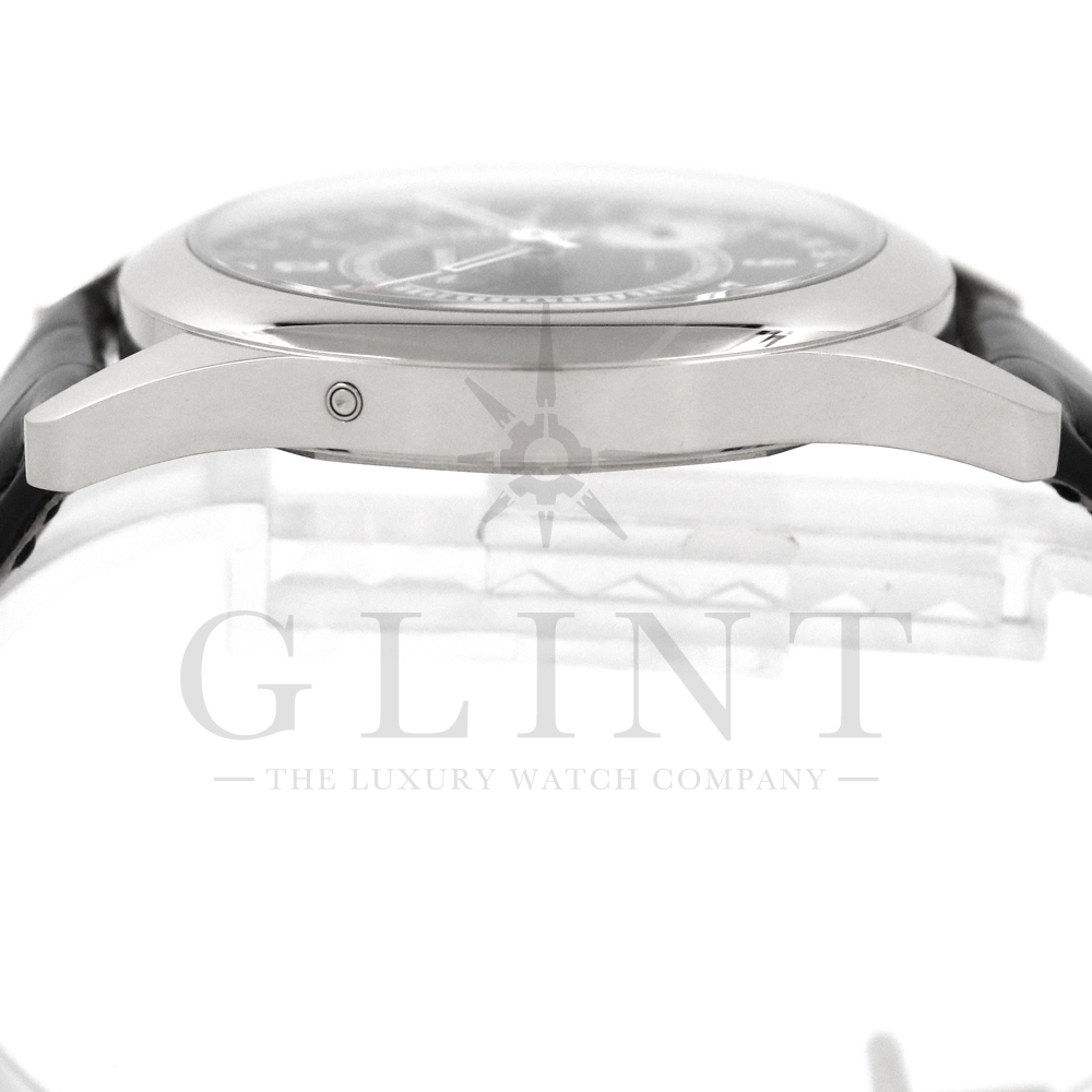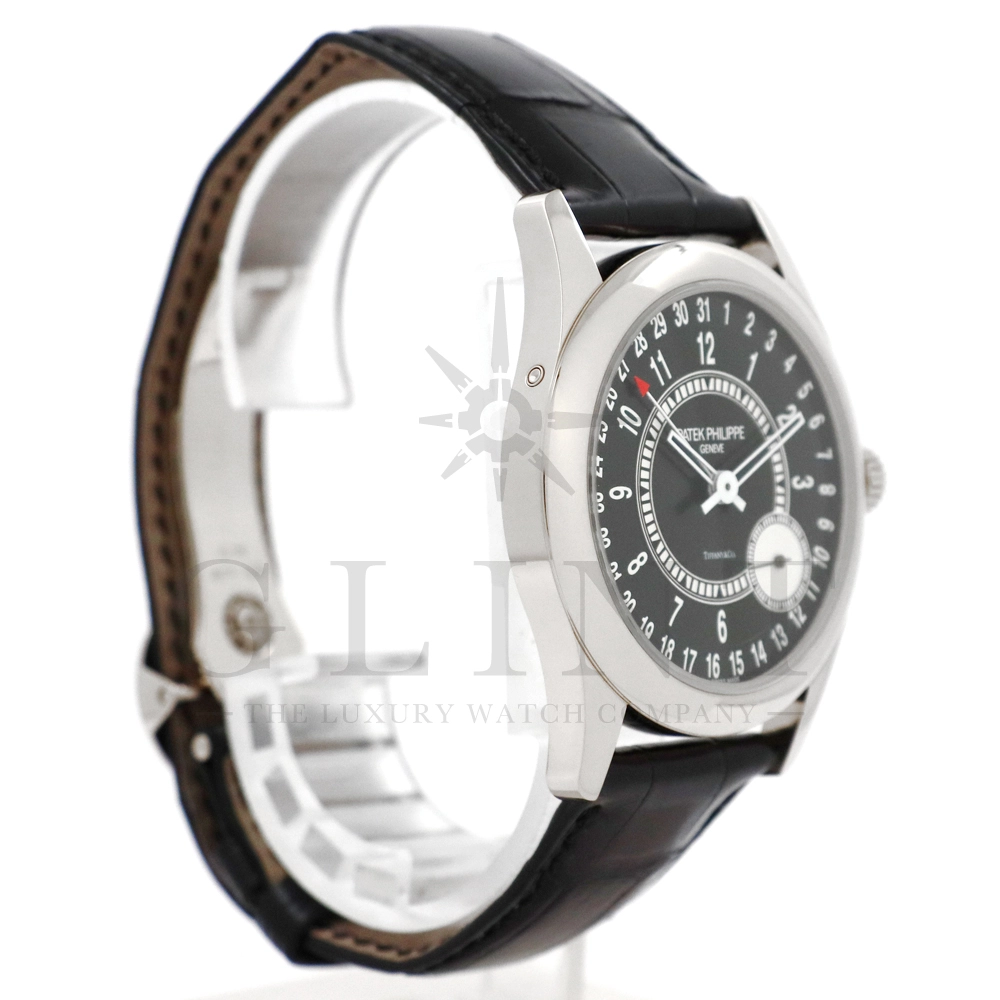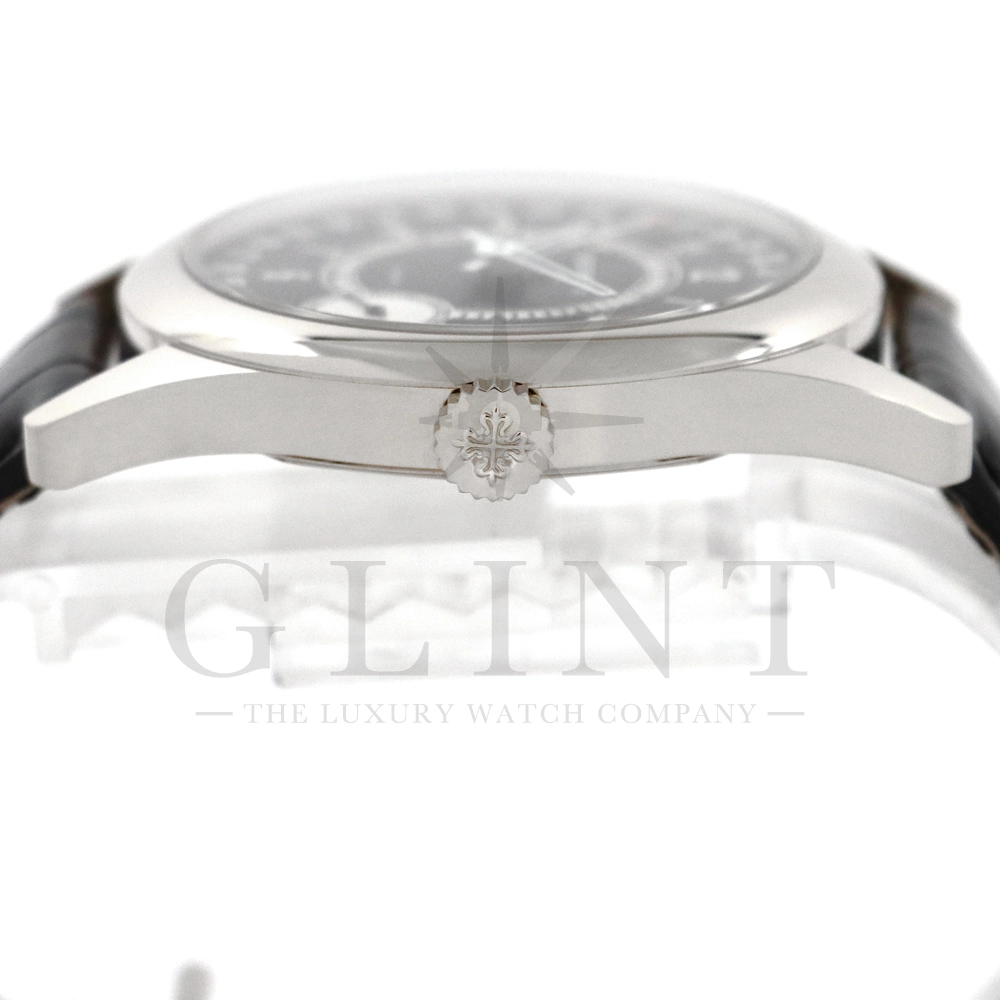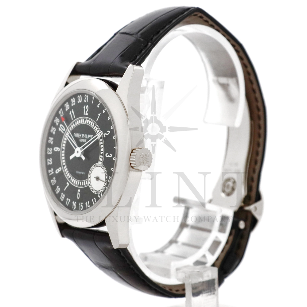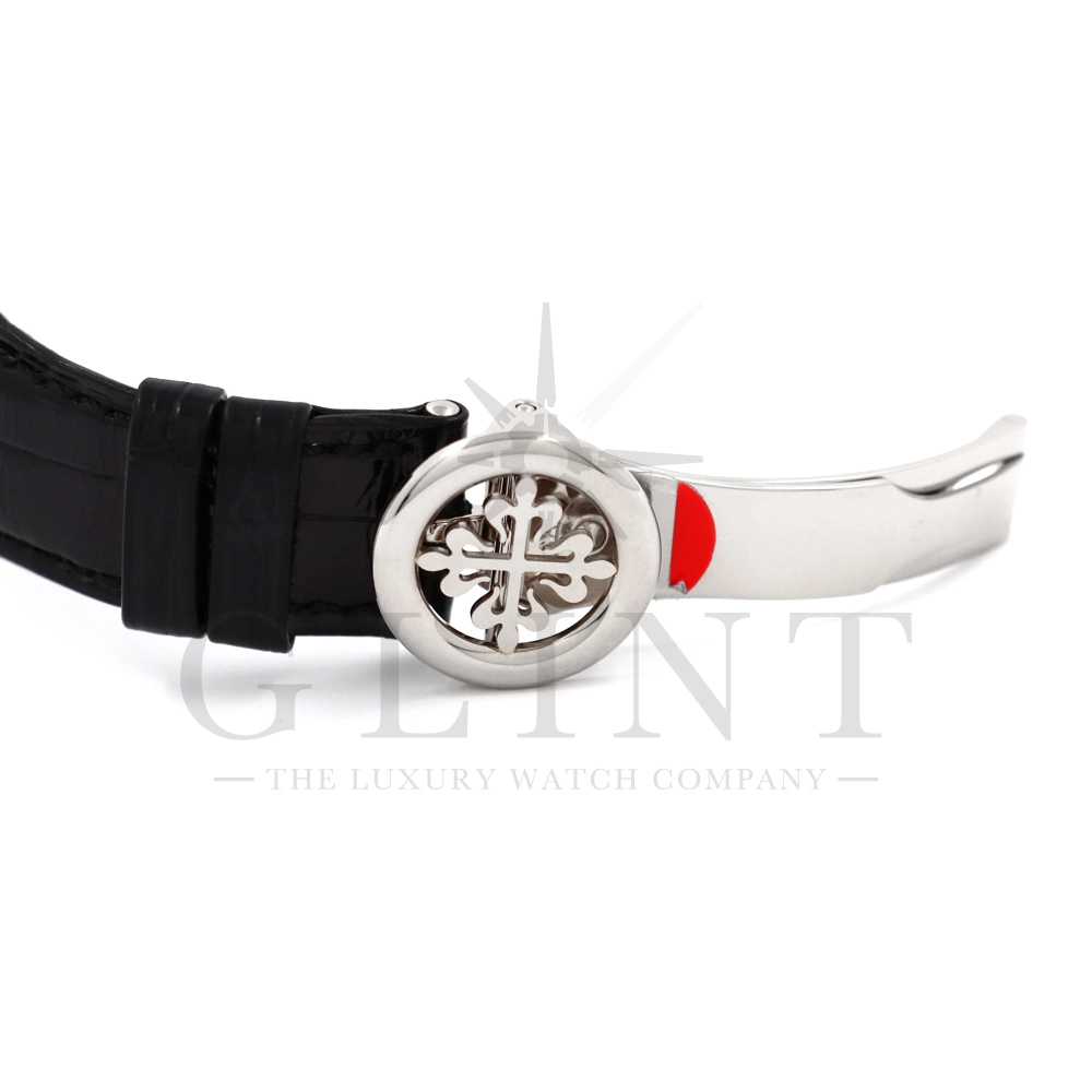 こちらはパテックフィリップ カラトラバ ティファニーWネームです。パテック フィリップは過去にティファニーやカルティエ、ギュブランなどの宝飾ブランドと結びつきがあり、その中でもティファニーとの歴史は長く、1851年にパートナーシップ契約を結んで以来、170年が経過した今でも、唯一パテックフィリップがダブルネームの使用を許可しているブランドです。こちらの6006G-010は過去へのオマージュとして満を持して復刻された、1930年代のアビエーションウォッチを完全再現したコンプリケーションモデル。超薄型ムーブメントにより一層薄さを追求するために開発された高い巻上げ効率を誇るCal.240 PS Cを搭載しており、更にはパテックフィリップとしては珍しいポインターデイト機構を採用し、針先の赤が個性的なアクセントとなっております。シースルーバックから覗ける22金のマイクロローターが時計の美しさを際立たせ、そしてベルトにはDバックルを使用するなど、通常のカラトラバコレクションとは一線を画した洗練されたデザインが魅力の逸品です。
