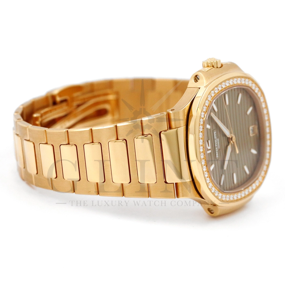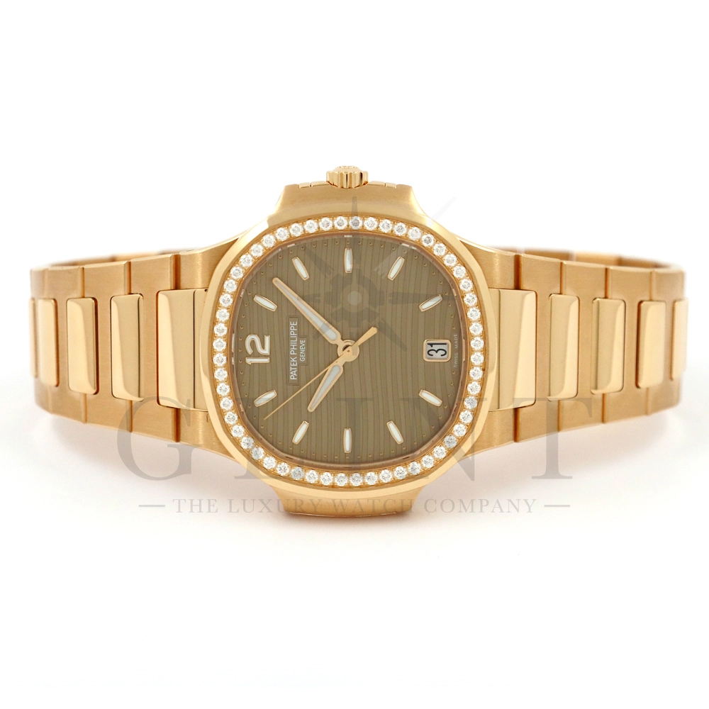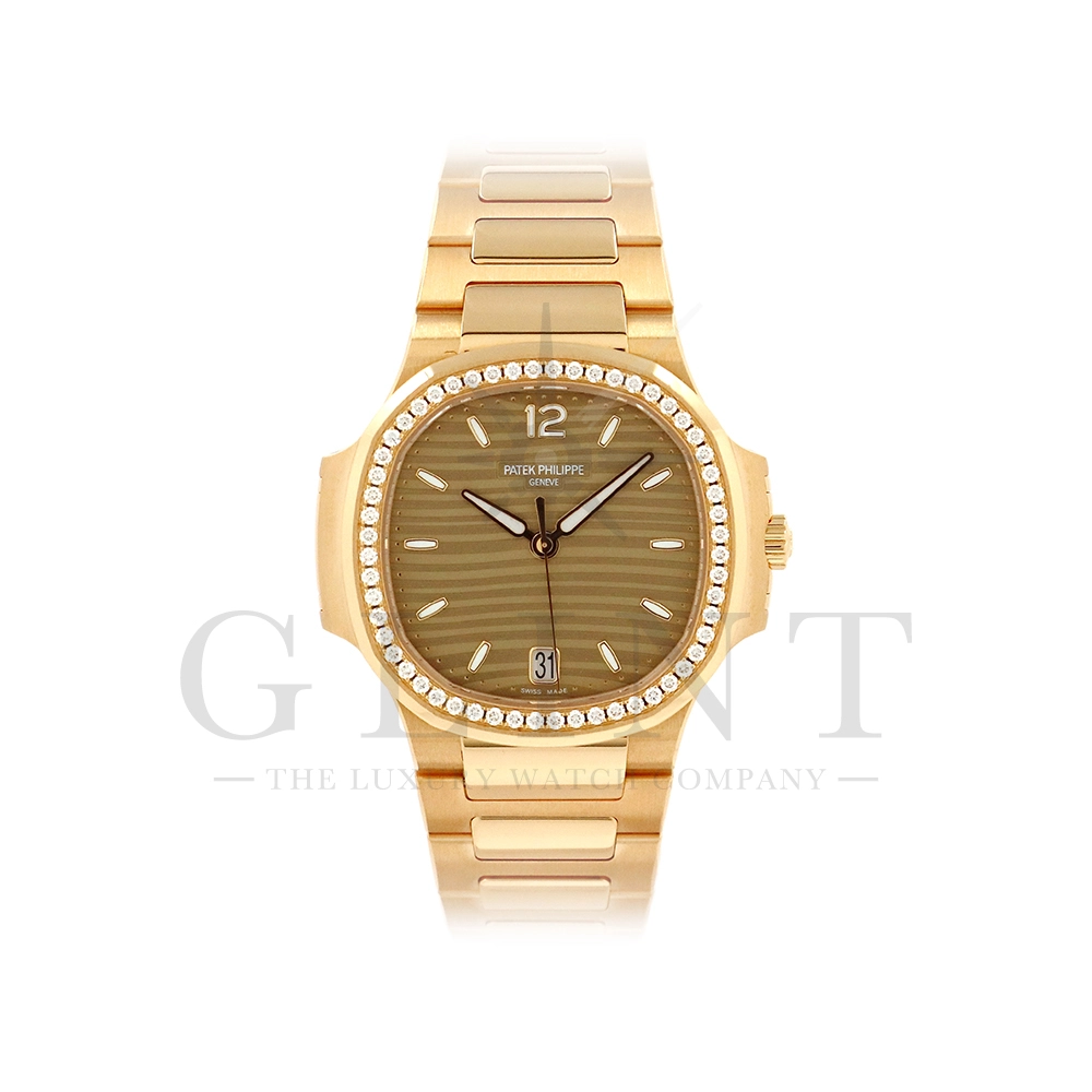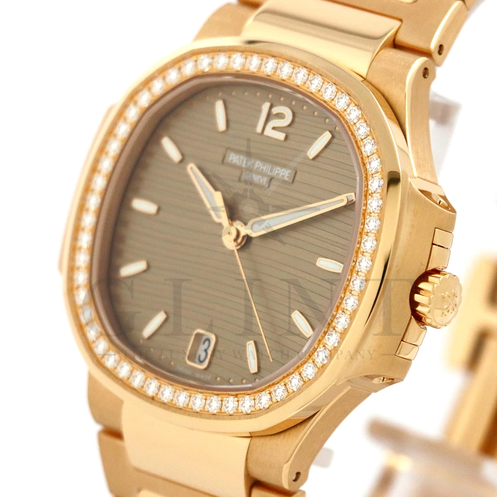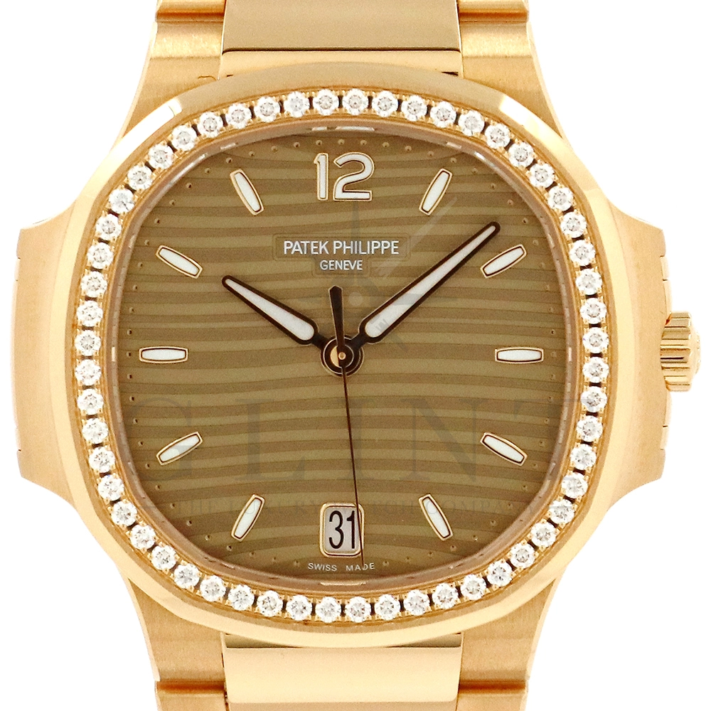 こちらはノーチラス 7118/1200R-010です。ケース、ブレスレットには18Kローズゴールドを使用。ベゼルにはダイヤモンドが56個セッティングされ、美しい輝きを放っております。ゴールド・オパーリンの文字盤には水平エンボス模様にウェーブが加えられ、ベゼルのダイヤモンドとローズゴールドのケースと相まって、腕元を華やかに演出し、より一層女性らしさを引き立ててくれるでしょう。ペアでお揃いでお楽しみいただく事もできる洗練された雰囲気と繊細なデザインが魅力の一本です。