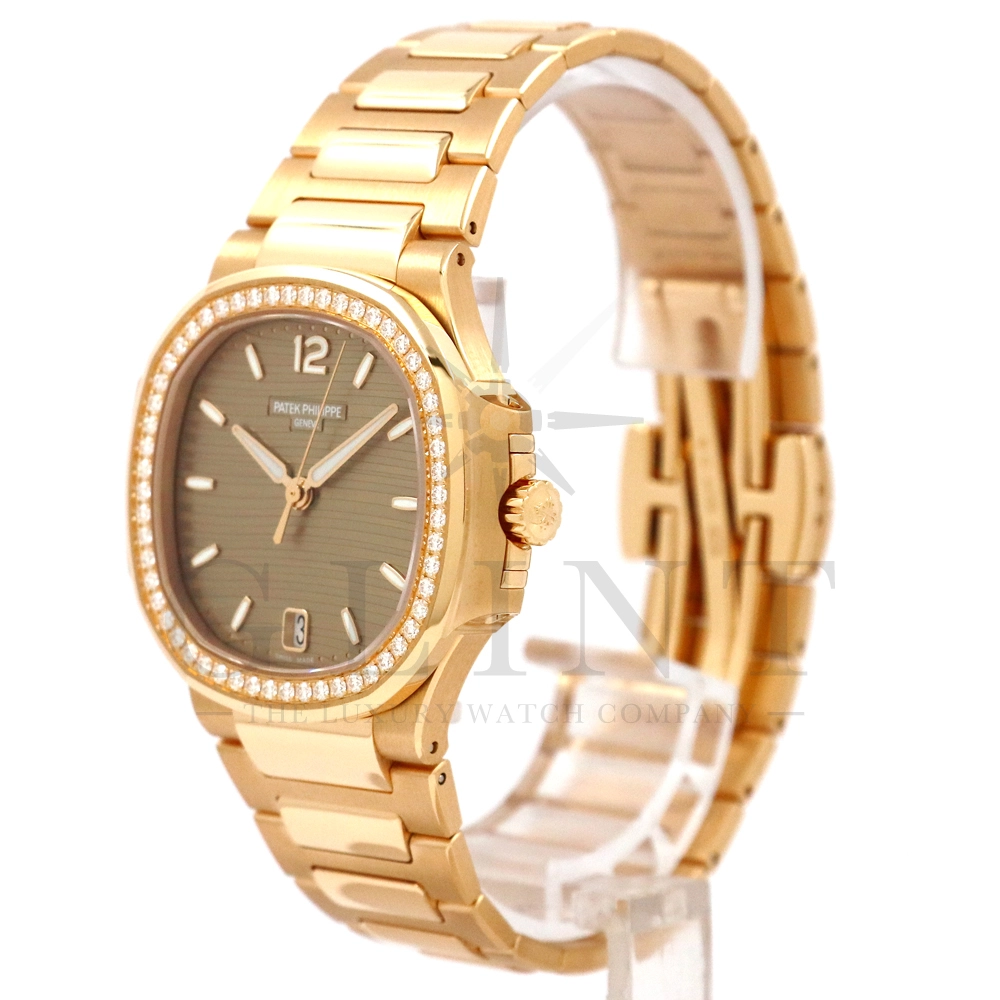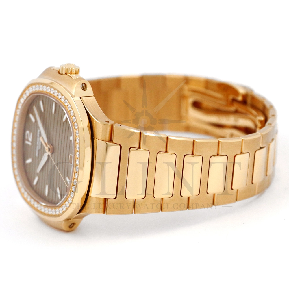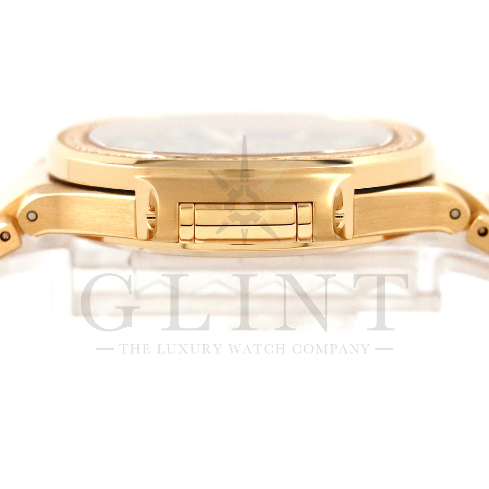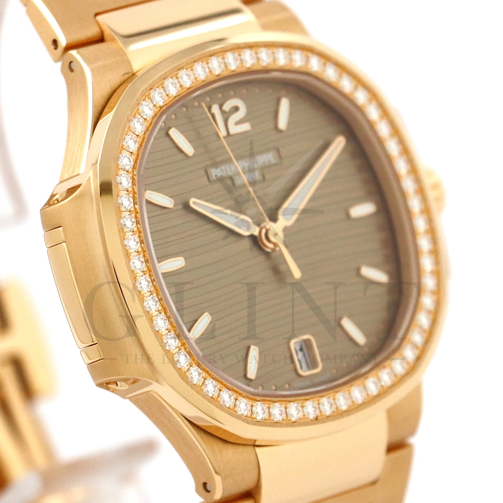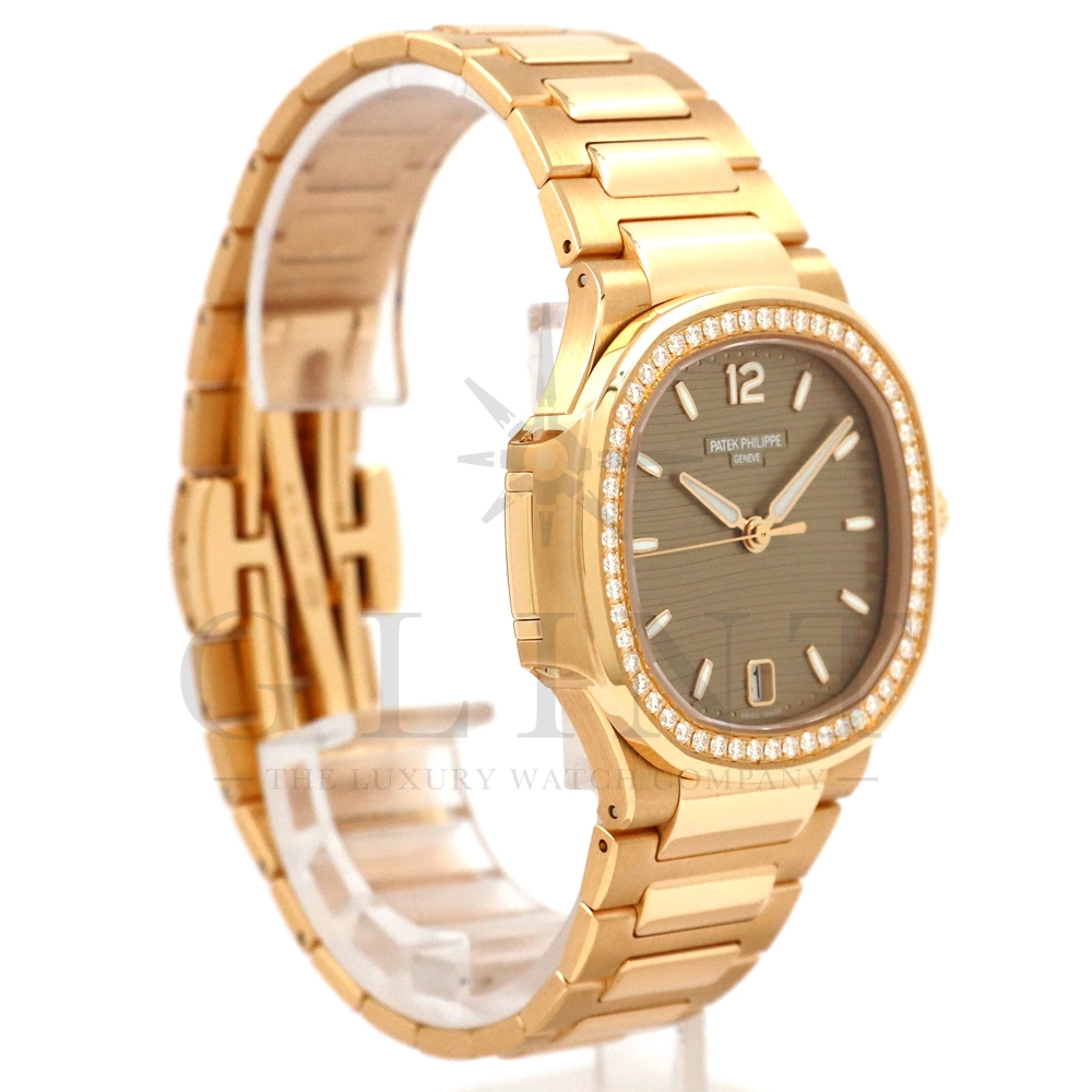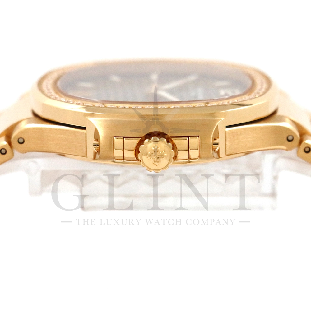 こちらはノーチラス 7118/1200R-010です。ケース、ブレスレットには18Kローズゴールドを使用。ベゼルにはダイヤモンドが56個セッティングされ、美しい輝きを放っております。ゴールド・オパーリンの文字盤には水平エンボス模様にウェーブが加えられ、ベゼルのダイヤモンドとローズゴールドのケースと相まって、腕元を華やかに演出し、より一層女性らしさを引き立ててくれるでしょう。ペアでお揃いでお楽しみいただく事もできる洗練された雰囲気と繊細なデザインが魅力の一本です。