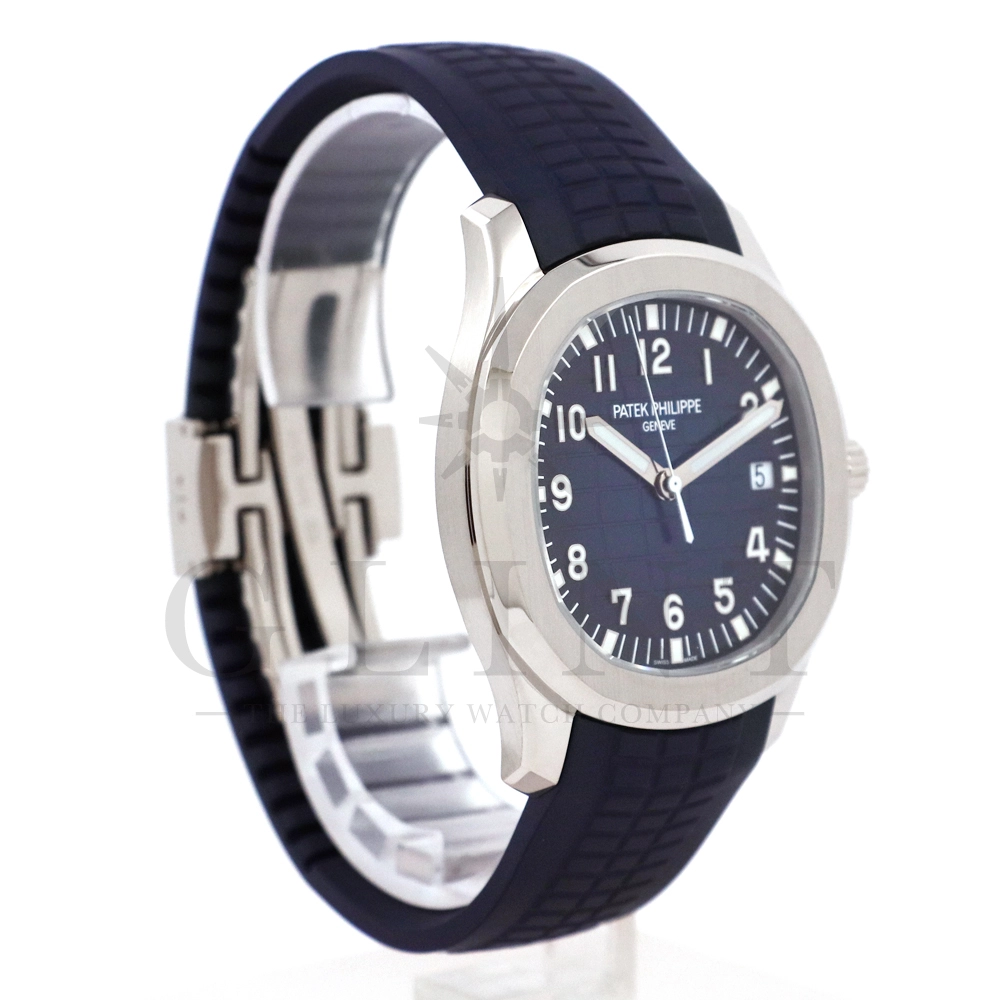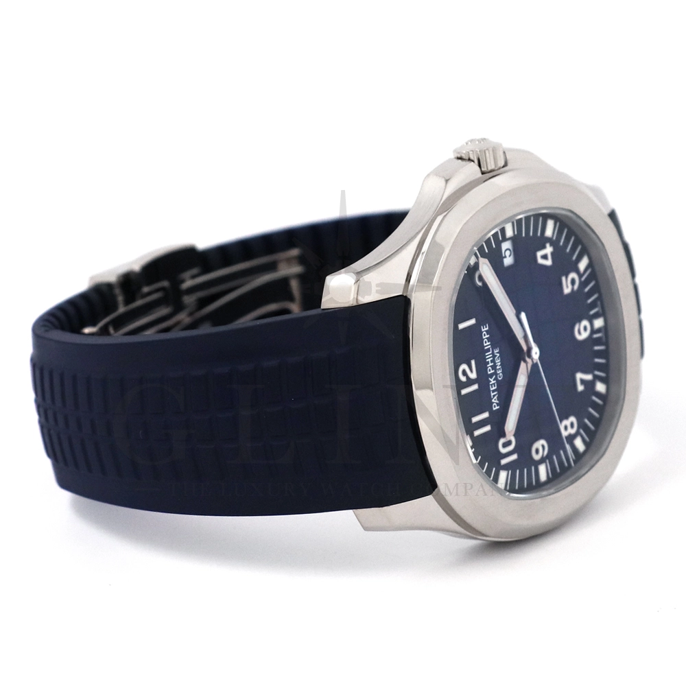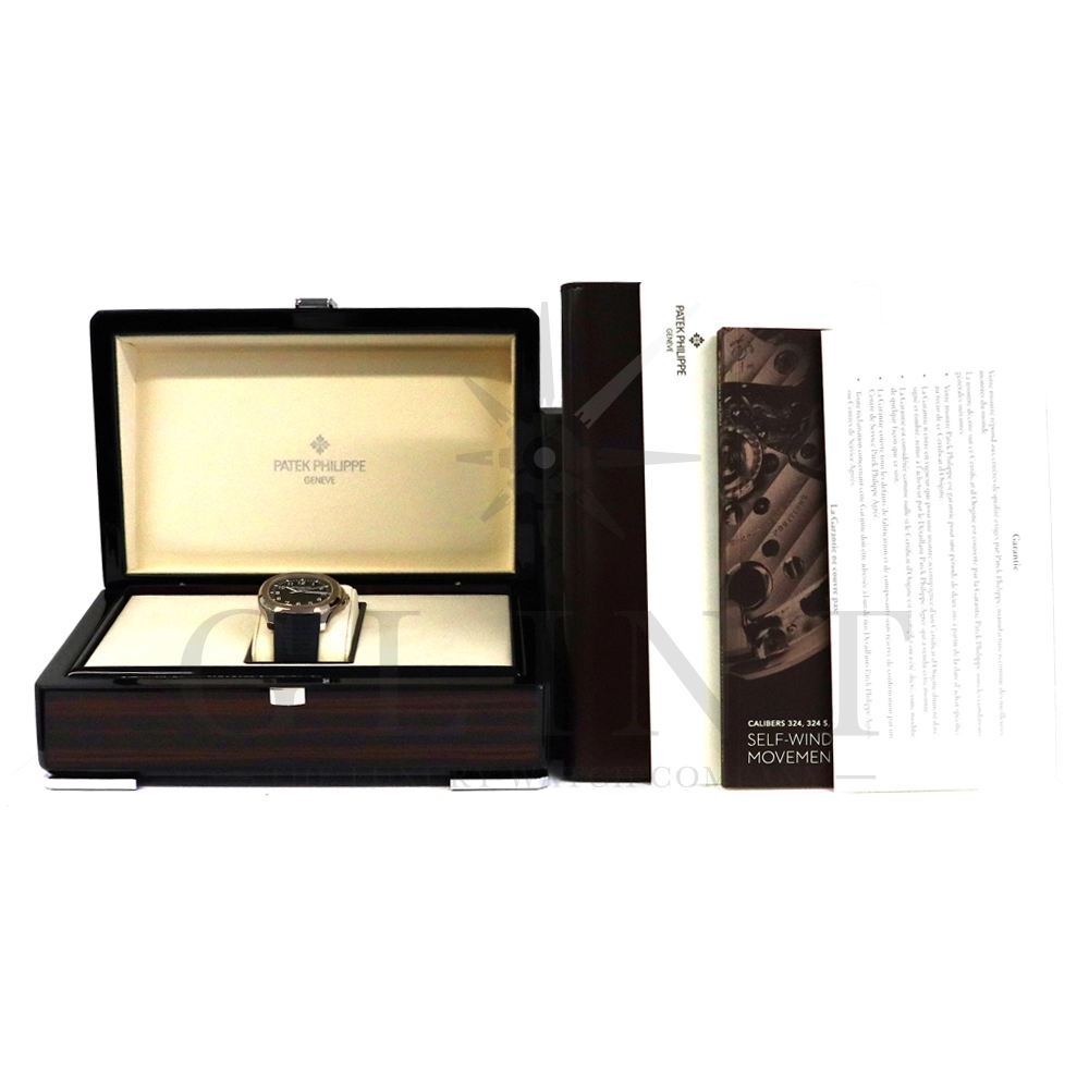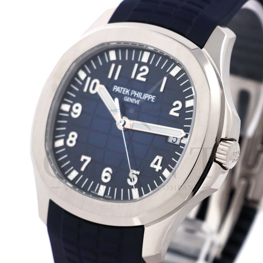 こちらはアクアノート誕生20周年を記念して発表されたアクアノート ジャンボ 5168G-001です。素材に18Kホワイトゴールドを採用。42.2mmとこれまでに無かったケースサイズであるものの、厚さ8.25mmの為、着け心地は抜群です。仕上げもパテックフィリップらしく繊細で、エンボス加工装飾が施されたブラックグラデーションのブルー文字盤、夜光付ホワイトゴールド数字を配置。8角形のラウンド型ケースは上面にポリッシュ仕上げ、断面にサテン仕上げを施し、ベゼルはケースとは対照的に上面にサテン仕上げ、側面にポリッシュ仕上げを交互に施した上品なデザインとなっています。海水にも耐えるコンポジット素材を採用したトロピカルバンドは文字盤に合わせてミッドナイトブルーカラーを採用。落ち着いた雰囲気の中にも気品さを感じさせてくれるアクアノートです。