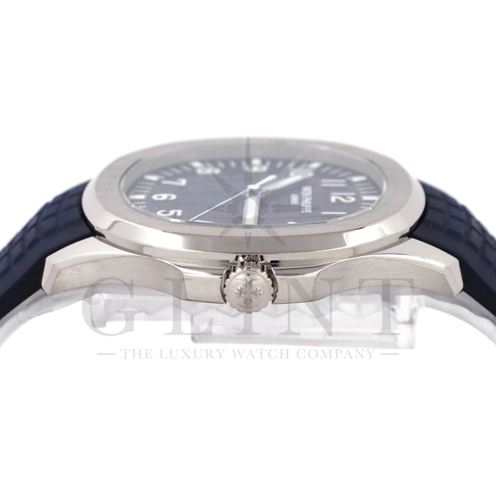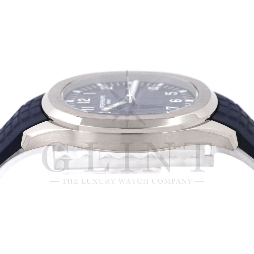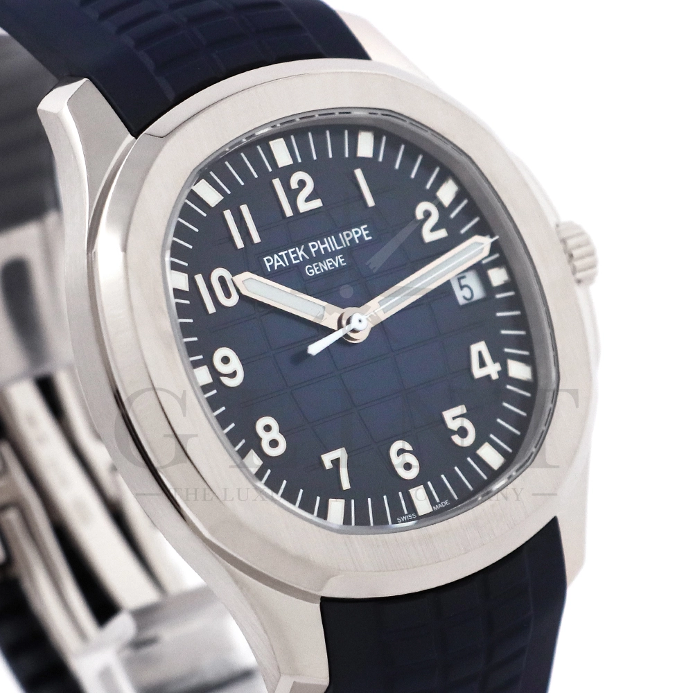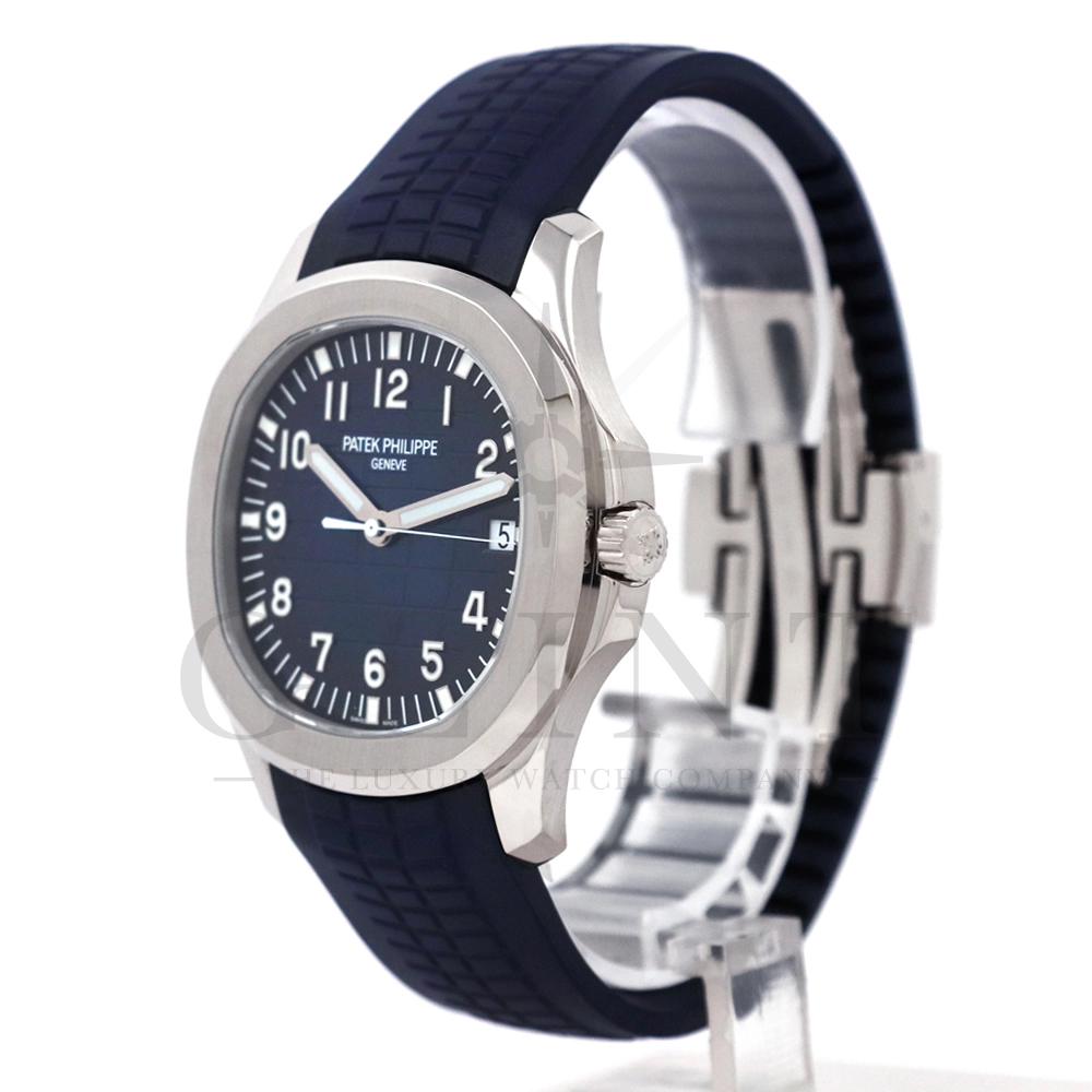 こちらはアクアノート誕生20周年を記念して発表されたアクアノート ジャンボ 5168G-001です。素材に18Kホワイトゴールドを採用。42.2mmとこれまでに無かったケースサイズであるものの、厚さ8.25mmの為、着け心地は抜群です。仕上げもパテックフィリップらしく繊細で、エンボス加工装飾が施されたブラックグラデーションのブルー文字盤、夜光付ホワイトゴールド数字を配置。8角形のラウンド型ケースは上面にポリッシュ仕上げ、断面にサテン仕上げを施し、ベゼルはケースとは対照的に上面にサテン仕上げ、側面にポリッシュ仕上げを交互に施した上品なデザインとなっています。海水にも耐えるコンポジット素材を採用したトロピカルバンドは文字盤に合わせてミッドナイトブルーカラーを採用。落ち着いた雰囲気の中にも気品さを感じさせてくれるアクアノートです。