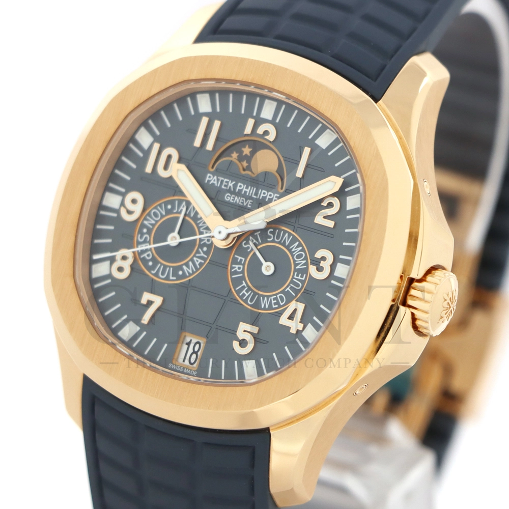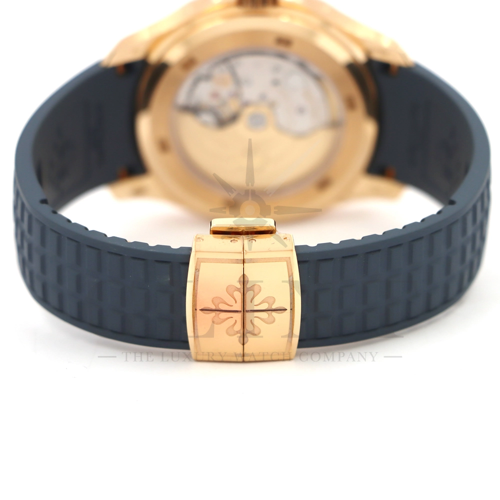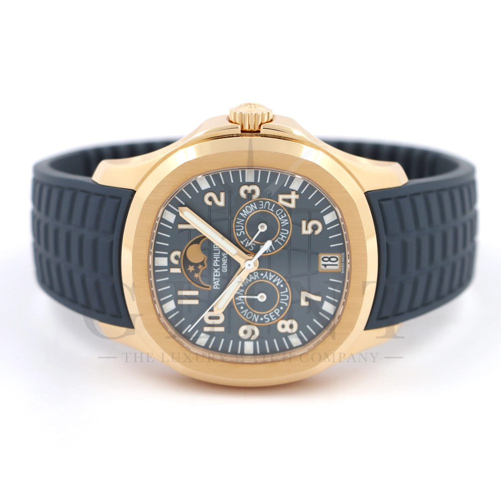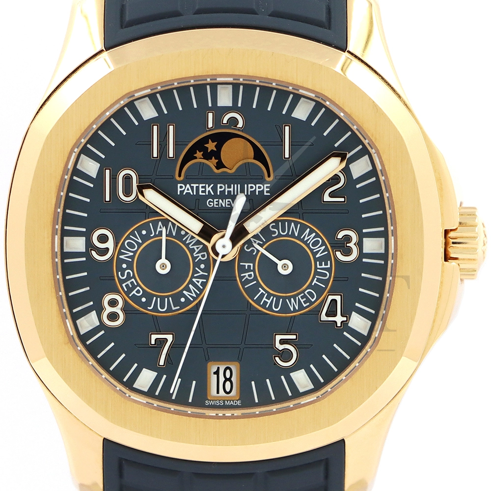 こちらは2023年新作モデルのアクアノート・ルーチェ 5261R-001です。特許取得の年次カレンダーを搭載し、婦人用コンプリケーテッド・ウォッチのレパートリーに、新たにジュエリーのないモデルが加わりました。39.9mmのローズゴールドケースとベゼルの丸みを帯びた8角形の象徴的なデザインは、ポリッシュ仕上げとサテン仕上げが生み出すコントラストによって強調されています。ブルーグレーの文字盤とアクアノート・パターンのコンポジット・バンドが、このモデルの《コンテンポラリー・カジュアル・シック》なスタイルを際立たせています。新たに進化したアクアノート・ルーチェは必ずや所有者を満足させてくれるタイムピースです。