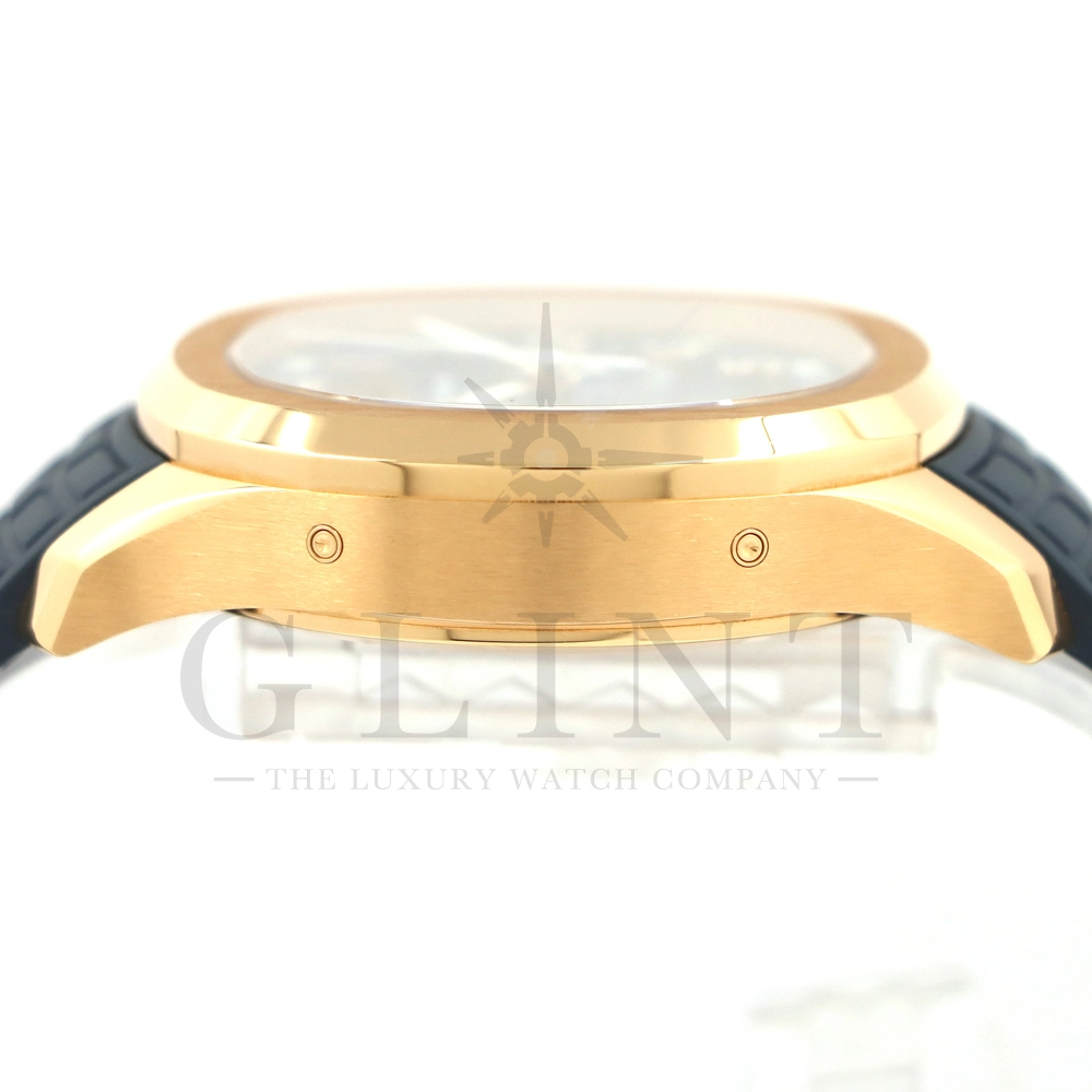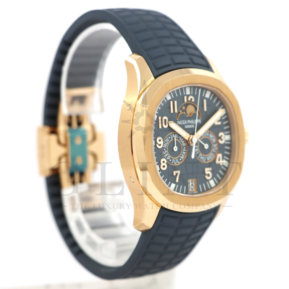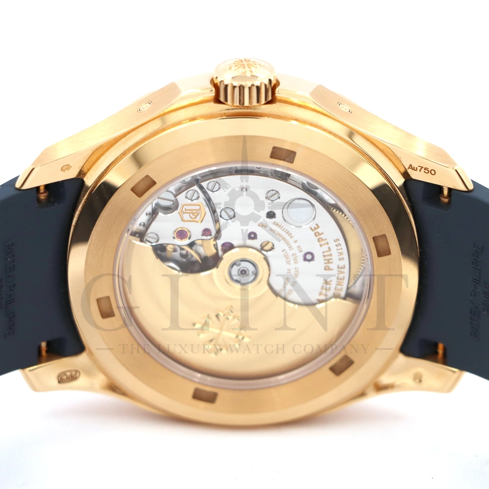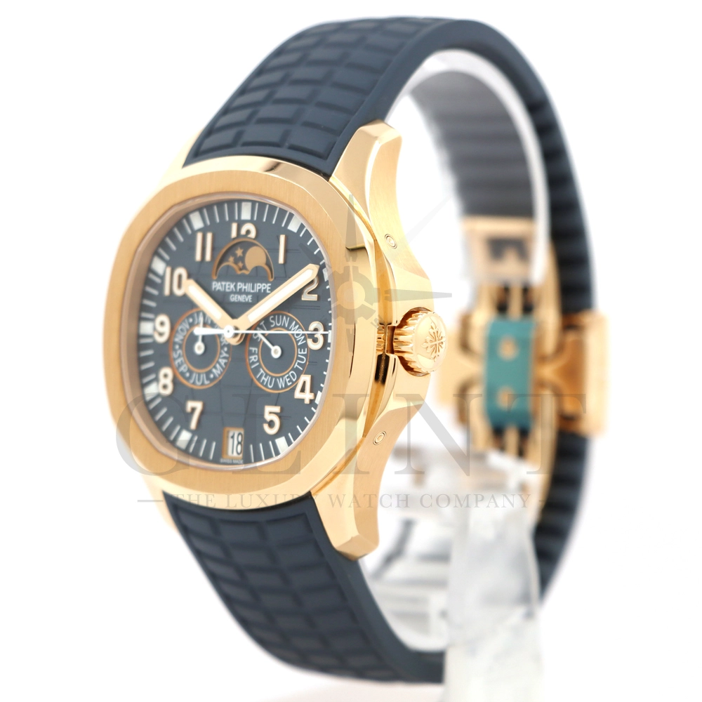 こちらは2023年新作モデルのアクアノート・ルーチェ 5261R-001です。特許取得の年次カレンダーを搭載し、婦人用コンプリケーテッド・ウォッチのレパートリーに、新たにジュエリーのないモデルが加わりました。39.9mmのローズゴールドケースとベゼルの丸みを帯びた8角形の象徴的なデザインは、ポリッシュ仕上げとサテン仕上げが生み出すコントラストによって強調されています。ブルーグレーの文字盤とアクアノート・パターンのコンポジット・バンドが、このモデルの《コンテンポラリー・カジュアル・シック》なスタイルを際立たせています。新たに進化したアクアノート・ルーチェは必ずや所有者を満足させてくれるタイムピースです。