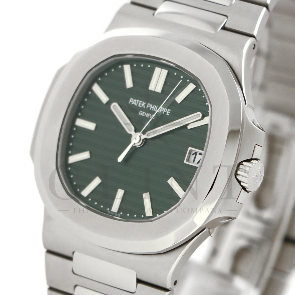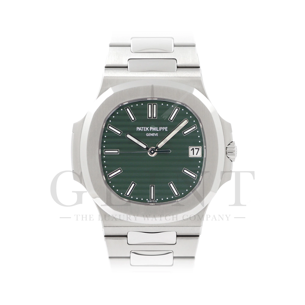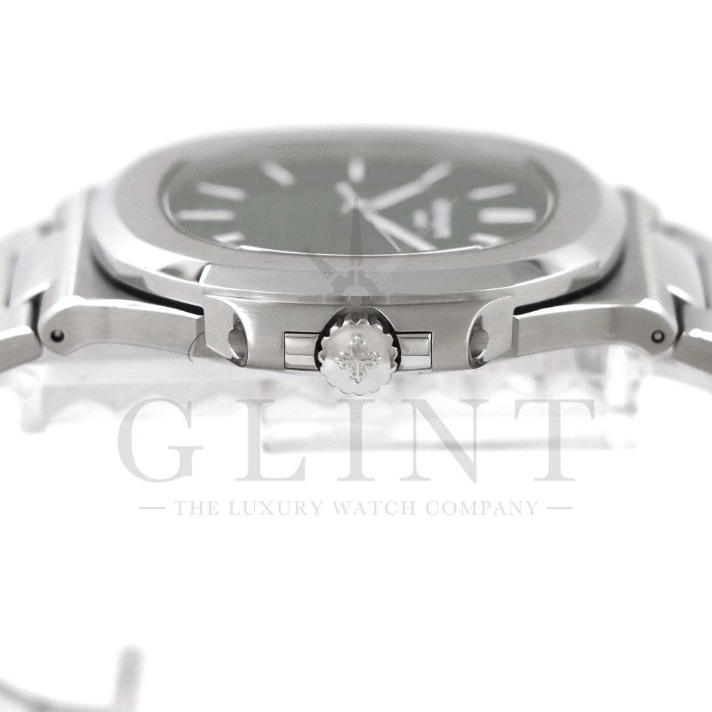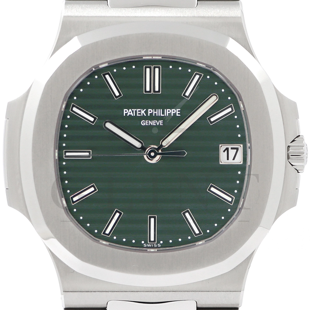 こちらはパテックフィリップ ノーチラス 5711/1A-014です。2021年に5711モデルのノーチラスの製造終了のアナウンスと同時に発表されたオリーブグリーンダイヤル。このエレガントな色合いは、ステンレススティールケースに反射した光と調和する、優しいソレイユ仕上げによって強調され、コンテンポラリーなパーソナリティを与えてくれます。また、夜光付ホワイトゴールドの植字インデックスと指針が、昼夜を問わず、最高の視認性とコントラストを保証してくれるでしょう。ムーブメントにはシリコン製スピロマックスヒゲゼンマイを備えた、センターローターの自動巻キャリバー 26-330 S Cが搭載。キャリバー324 S Cから派生したこの新しいムーブメントは、特に巻き上げシステムに関し、多くの技術革新と最適化された機能を備え、1秒単位の正確さで時刻合わせのできるストップセコンド機能も特徴となっております。シンプルながらもエレガントでラグジュアリーな印象を与えてくれるノーチラス。名実ともに世界最高の高級時計ブランドが誇る極上のタイムピースです。