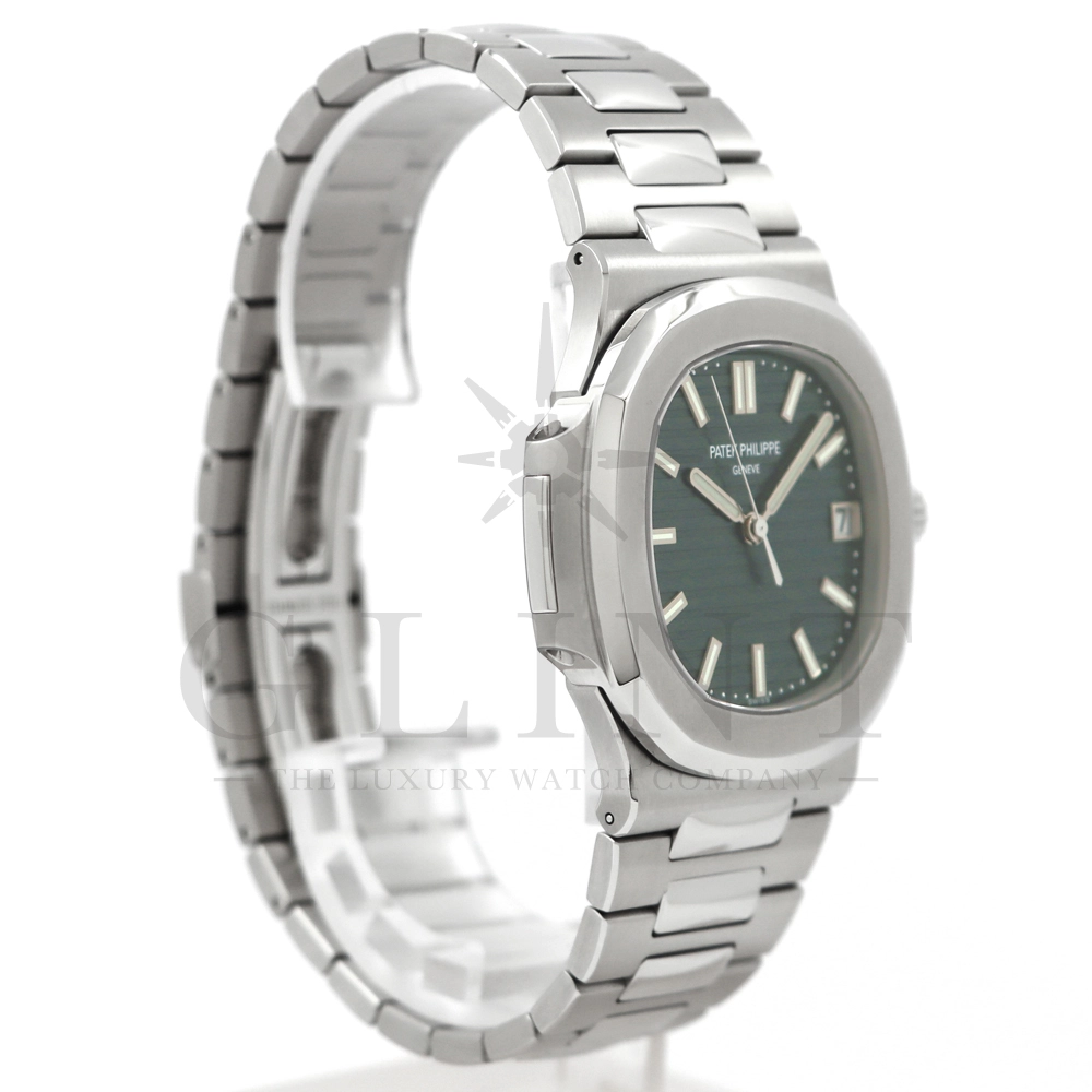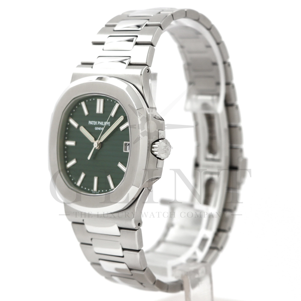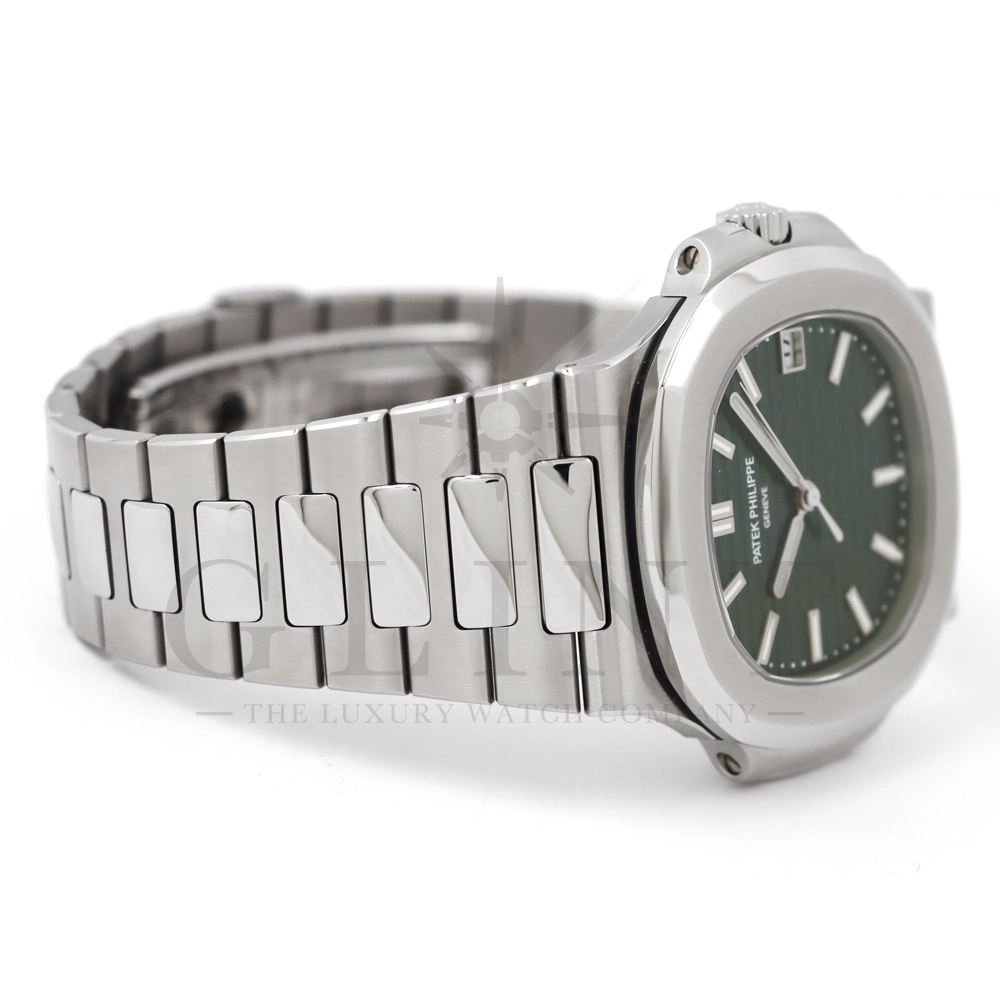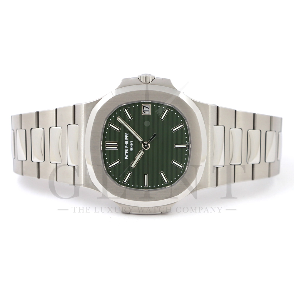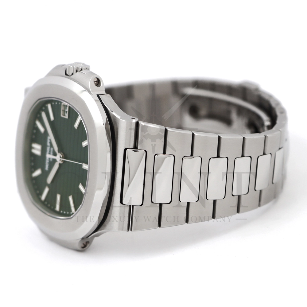 こちらはパテックフィリップ ノーチラス 5711/1A-014です。2021年に5711モデルのノーチラスの製造終了のアナウンスと同時に発表されたオリーブグリーンダイヤル。このエレガントな色合いは、ステンレススティールケースに反射した光と調和する、優しいソレイユ仕上げによって強調され、コンテンポラリーなパーソナリティを与えてくれます。また、夜光付ホワイトゴールドの植字インデックスと指針が、昼夜を問わず、最高の視認性とコントラストを保証してくれるでしょう。ムーブメントにはシリコン製スピロマックスヒゲゼンマイを備えた、センターローターの自動巻キャリバー 26-330 S Cが搭載。キャリバー324 S Cから派生したこの新しいムーブメントは、特に巻き上げシステムに関し、多くの技術革新と最適化された機能を備え、1秒単位の正確さで時刻合わせのできるストップセコンド機能も特徴となっております。シンプルながらもエレガントでラグジュアリーな印象を与えてくれるノーチラス。名実ともに世界最高の高級時計ブランドが誇る極上のタイムピースです。