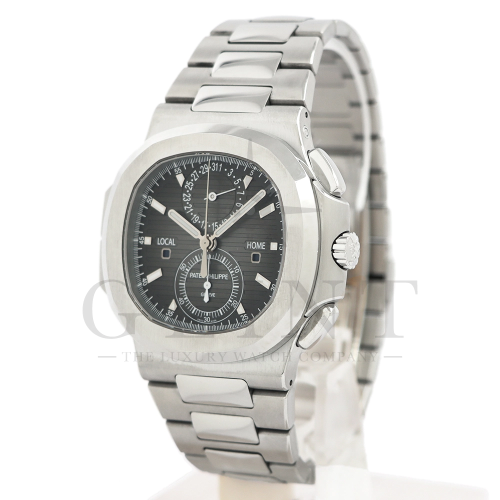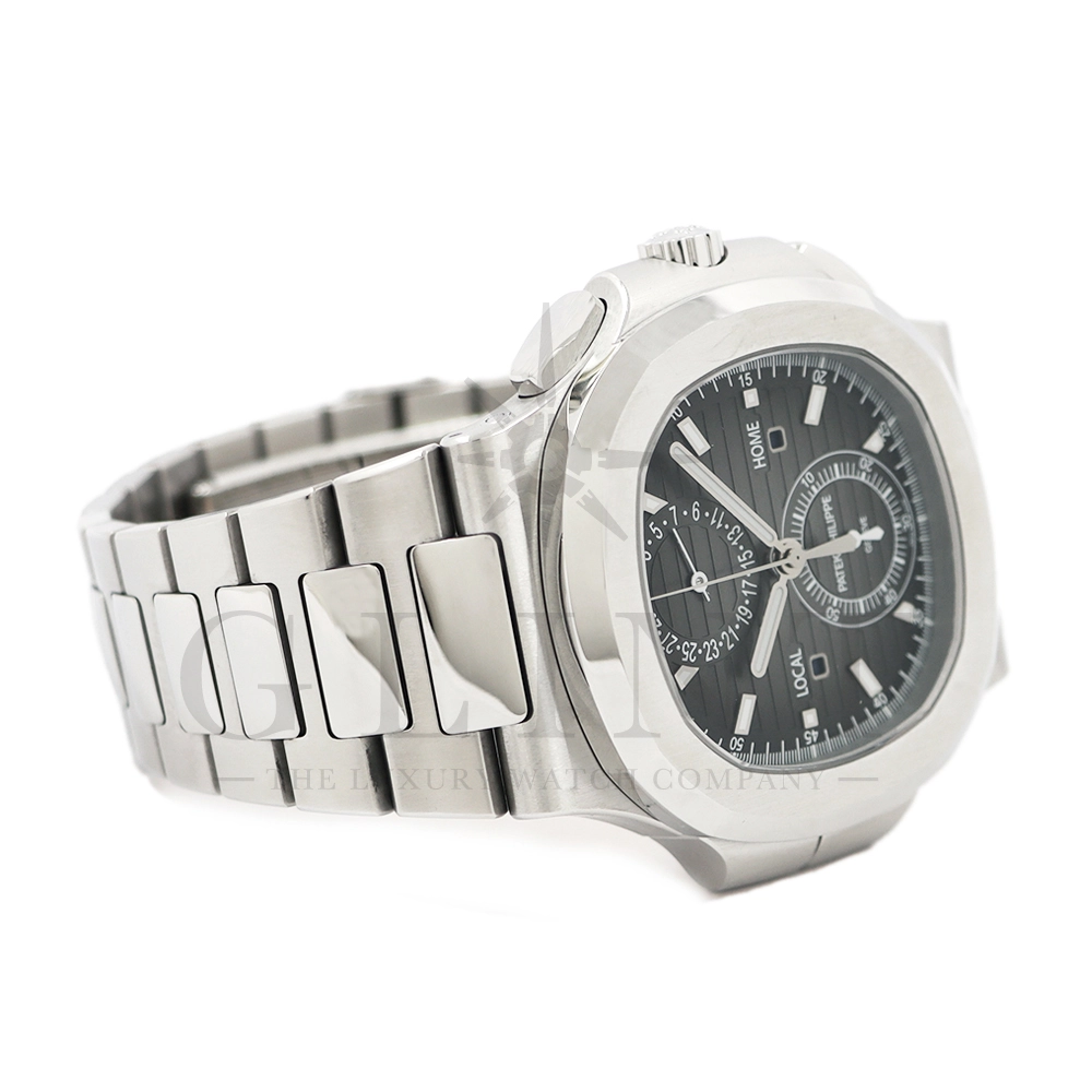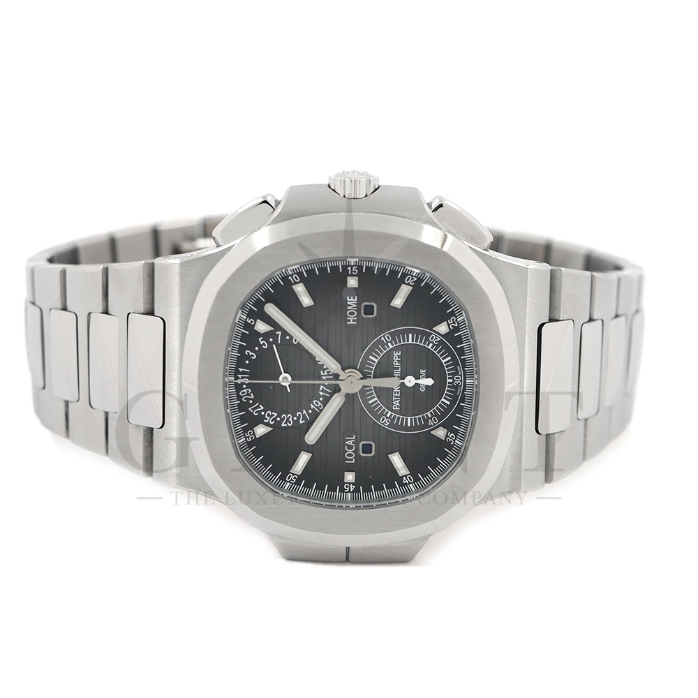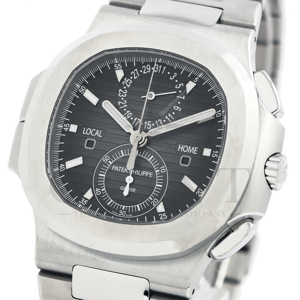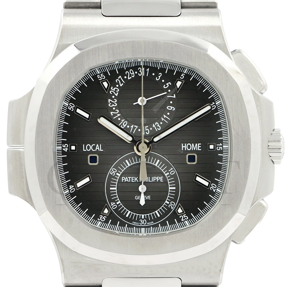 こちらはノーチラス トラベルタイム クロノグラフです。素材はステンレススティールでブラック・グラデーション文字盤との相性は良く、シックで落ち着いた印象を与えてくれます。トラベルタイムは重なり合う2本の時針により、2つの異なったタイムゾーンの時刻を一目で判るように表示する機構で、こちらのモデルは出発地と現地の2つの昼夜窓表示を搭載。12時位置には日付を指針表示されており、実用性に優れております。搭載されている自動巻きクロノグラフムーブメント Cal.CH 28-520 C FUSの垂直クラッチが非常に優れており、クロノグラフ作動時のエネルギーロスがほとんど無い為、6時側に位置するクロノグラフ秒針を通常秒針として使用する事も可能です。機械式時計の最高峰を追及した名門パテックフィリップの卓越した技術を心ゆくまで堪能できる至極の一本と言えるでしょう。