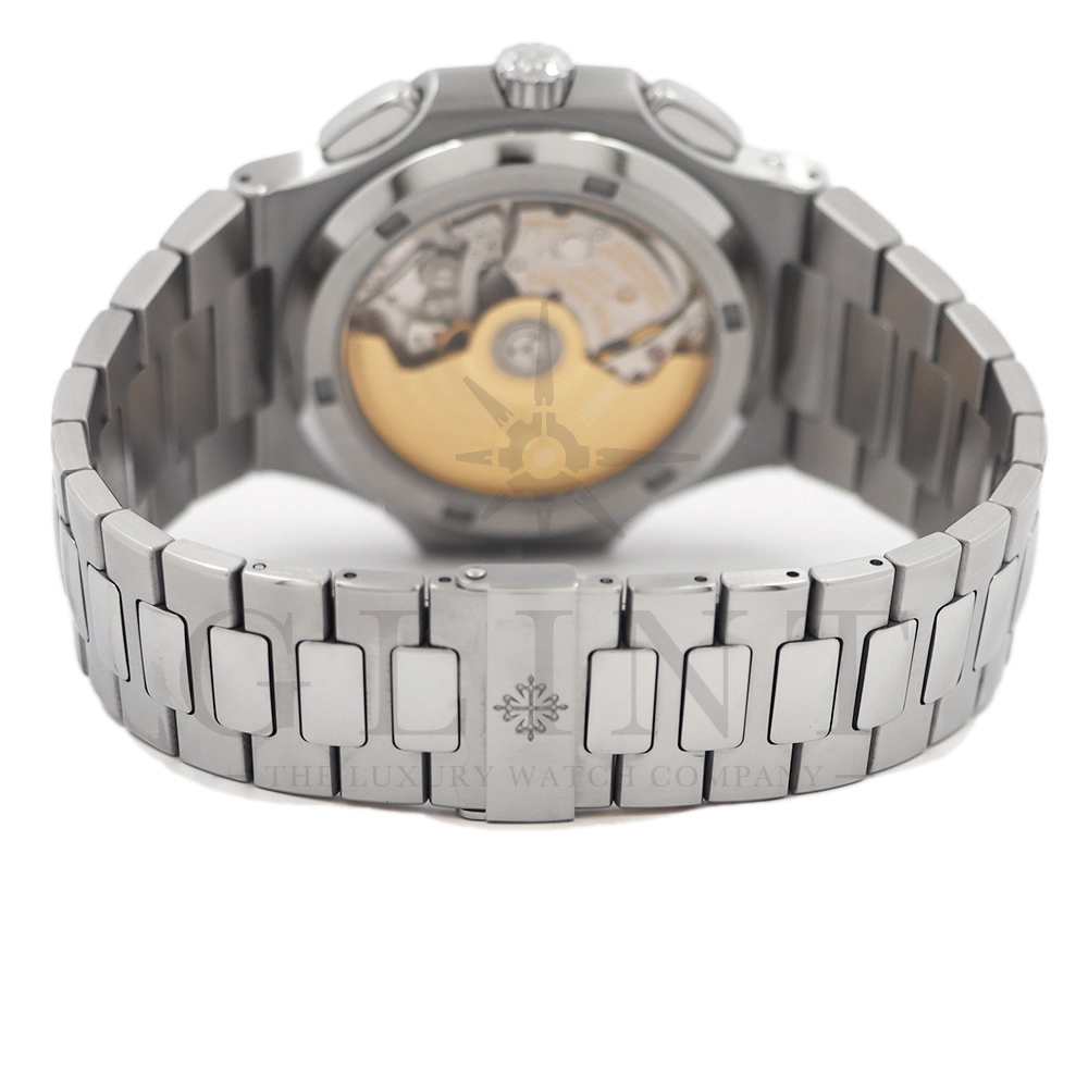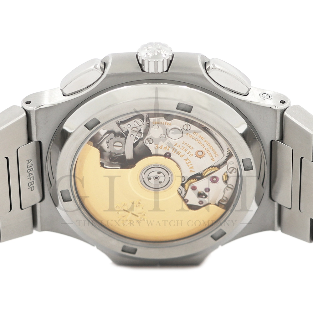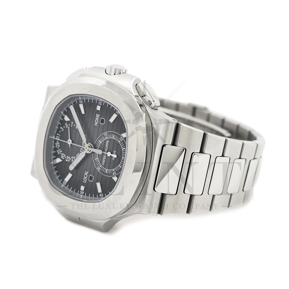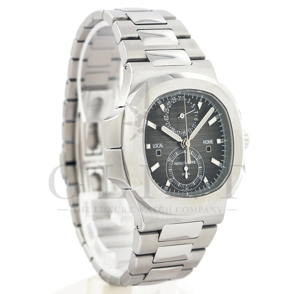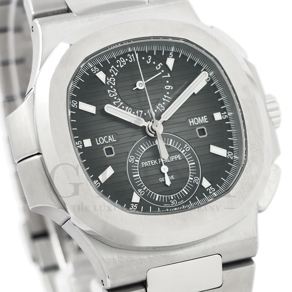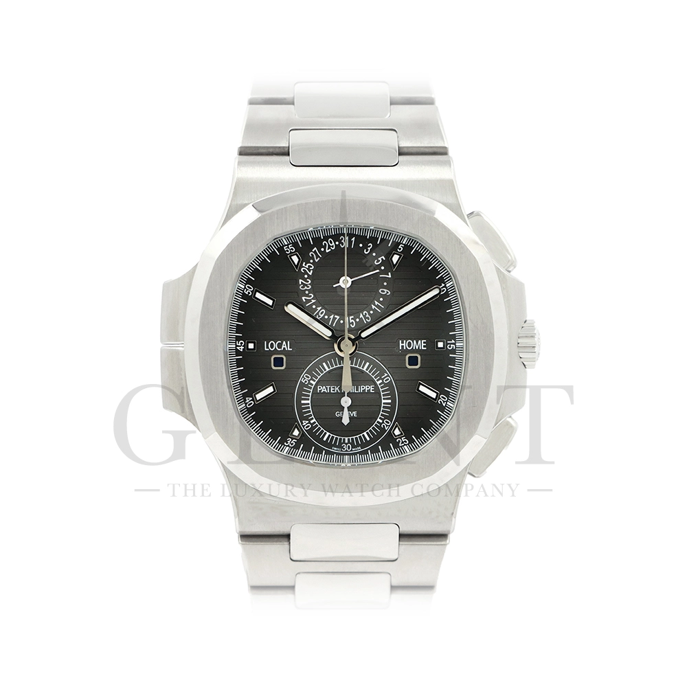 こちらはノーチラス トラベルタイム クロノグラフです。素材はステンレススティールでブラック・グラデーション文字盤との相性は良く、シックで落ち着いた印象を与えてくれます。トラベルタイムは重なり合う2本の時針により、2つの異なったタイムゾーンの時刻を一目で判るように表示する機構で、こちらのモデルは出発地と現地の2つの昼夜窓表示を搭載。12時位置には日付を指針表示されており、実用性に優れております。搭載されている自動巻きクロノグラフムーブメント Cal.CH 28-520 C FUSの垂直クラッチが非常に優れており、クロノグラフ作動時のエネルギーロスがほとんど無い為、6時側に位置するクロノグラフ秒針を通常秒針として使用する事も可能です。機械式時計の最高峰を追及した名門パテックフィリップの卓越した技術を心ゆくまで堪能できる至極の一本と言えるでしょう。