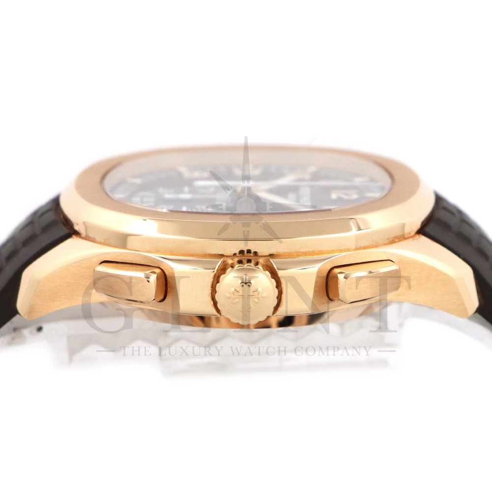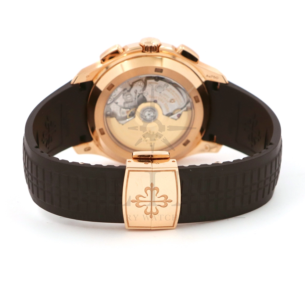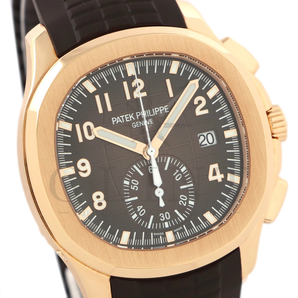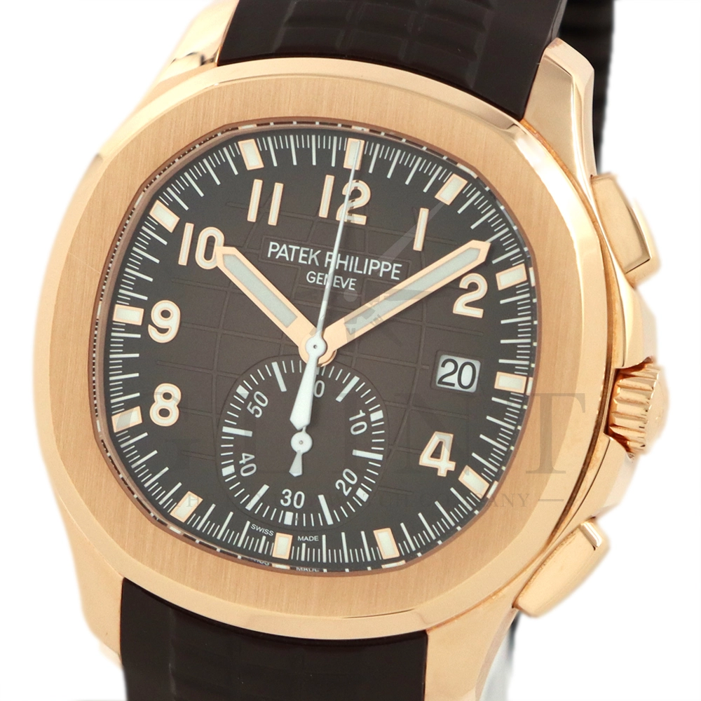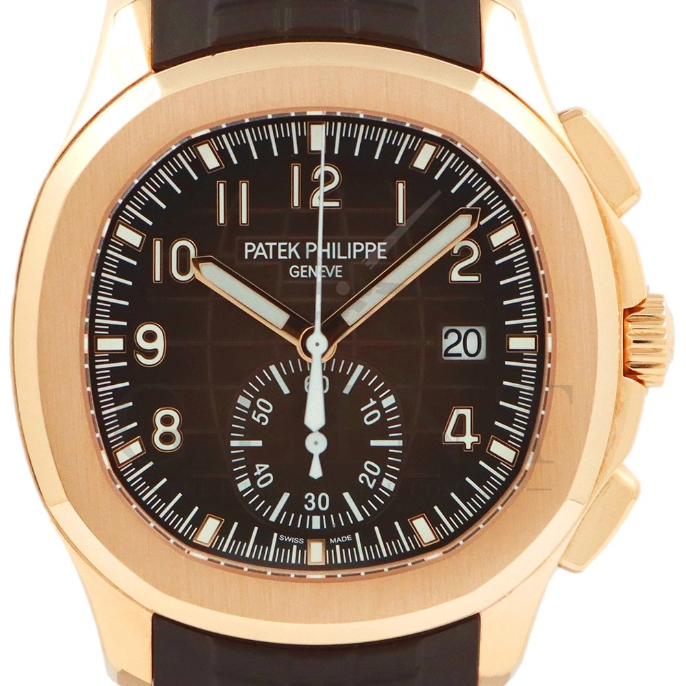 こちらはアクアノート フライバック クロノグラフ 5968R-001です。2023年に登場したアクアノート フライバック クロノグラフ初のローズゴールドモデル。ケースサイズは大きく、通称”JUMBO”と言われるジャンボサイズの42.2mmとなっております。エンボス加工のブラック・グラデーションのブラウン・ソレイユ文字盤にホワイトカラーのクロノグラフ針、60分積算計針がアクセントとなっており、爽やかな印象を与えてくれるでしょう。搭載されているフライバッククロノグラフ自動巻きムーブメント Cal.CH 28-520 C/528は5960Pや5980/1Aから系譜されてきたキャリバーで、ムーブメントの動きをシースルーバックから堪能する事ができます。12気圧防水、ねじ込み式リュウズ、ラバーベルトは海水にも耐えるコンポジット素材を採用。カジュアルながらもパテックフィリップらしい上品な雰囲気も感じさせてくれる魅力的な一本です。