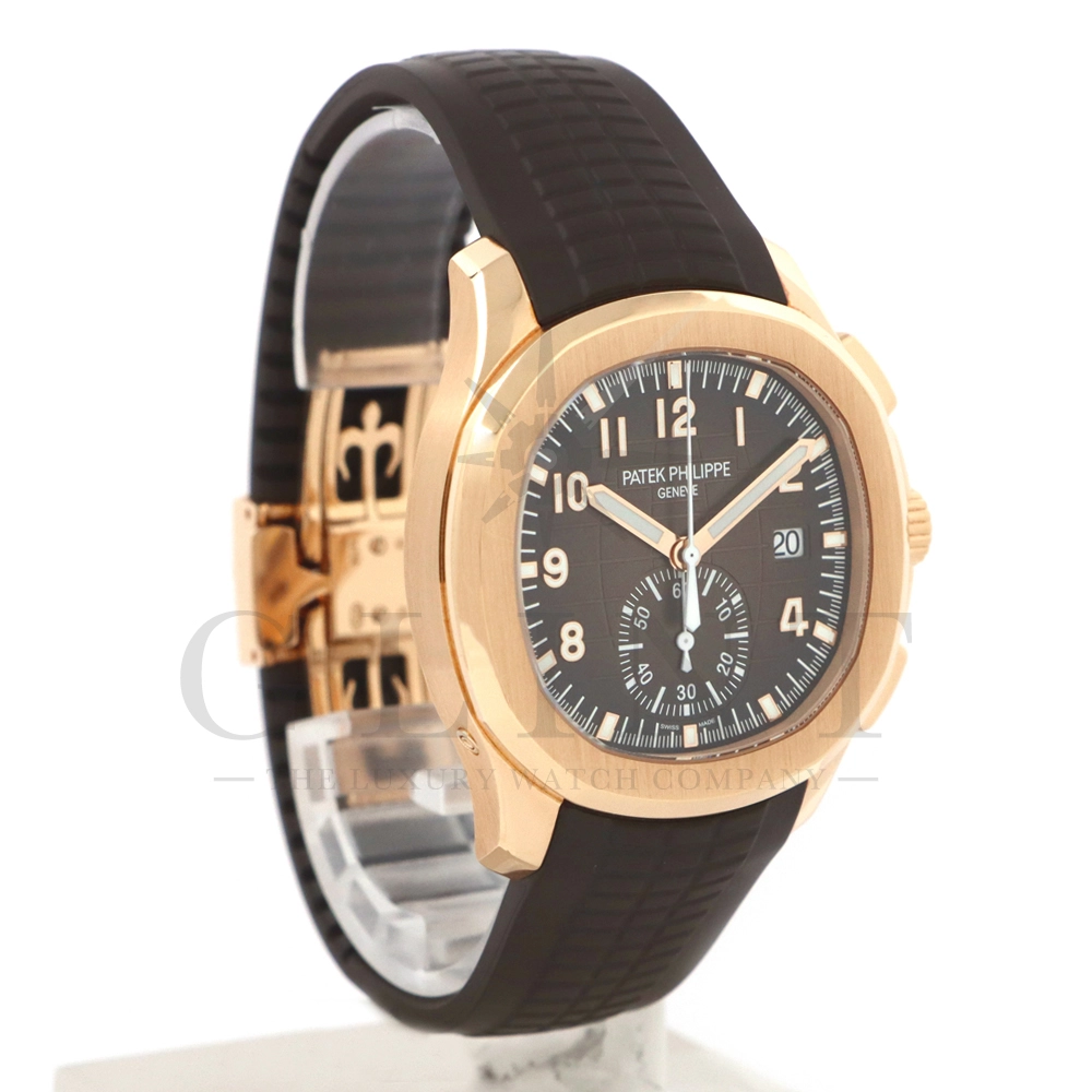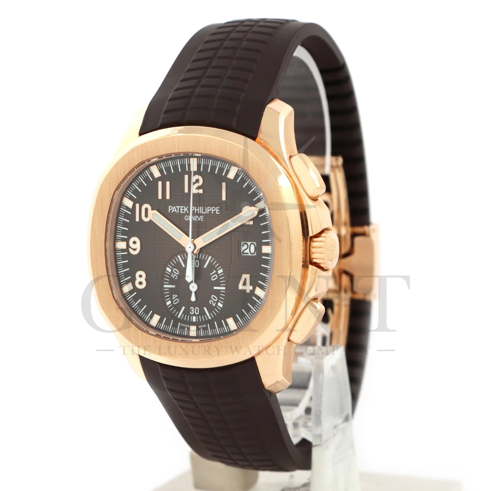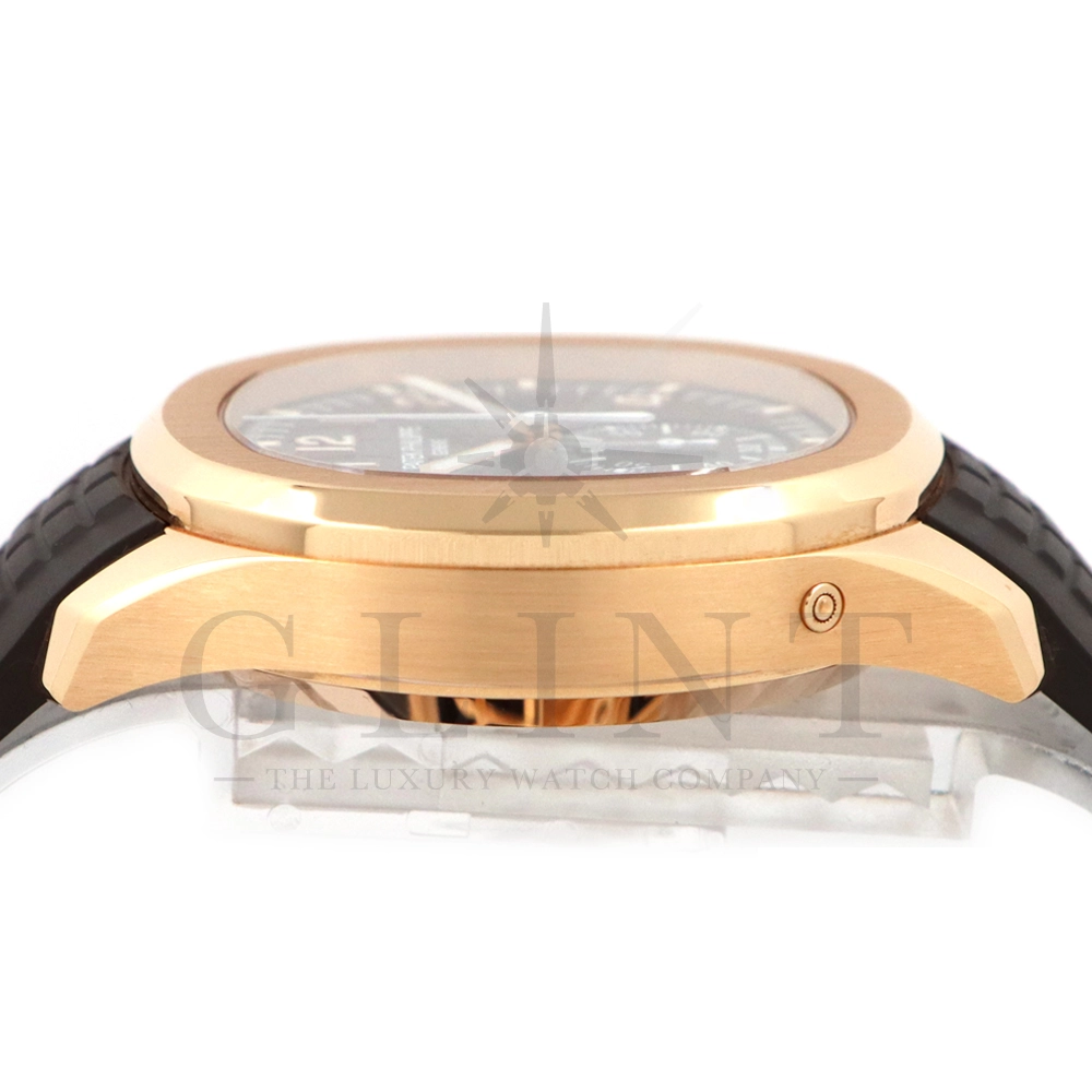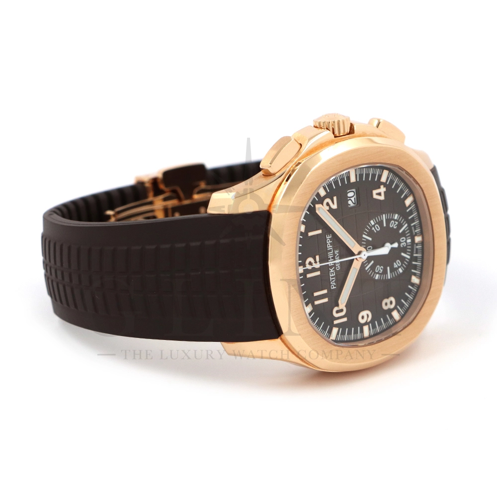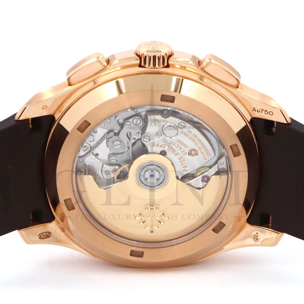 こちらはアクアノート フライバック クロノグラフ 5968R-001です。2023年に登場したアクアノート フライバック クロノグラフ初のローズゴールドモデル。ケースサイズは大きく、通称”JUMBO”と言われるジャンボサイズの42.2mmとなっております。エンボス加工のブラック・グラデーションのブラウン・ソレイユ文字盤にホワイトカラーのクロノグラフ針、60分積算計針がアクセントとなっており、爽やかな印象を与えてくれるでしょう。搭載されているフライバッククロノグラフ自動巻きムーブメント Cal.CH 28-520 C/528は5960Pや5980/1Aから系譜されてきたキャリバーで、ムーブメントの動きをシースルーバックから堪能する事ができます。12気圧防水、ねじ込み式リュウズ、ラバーベルトは海水にも耐えるコンポジット素材を採用。カジュアルながらもパテックフィリップらしい上品な雰囲気も感じさせてくれる魅力的な一本です。