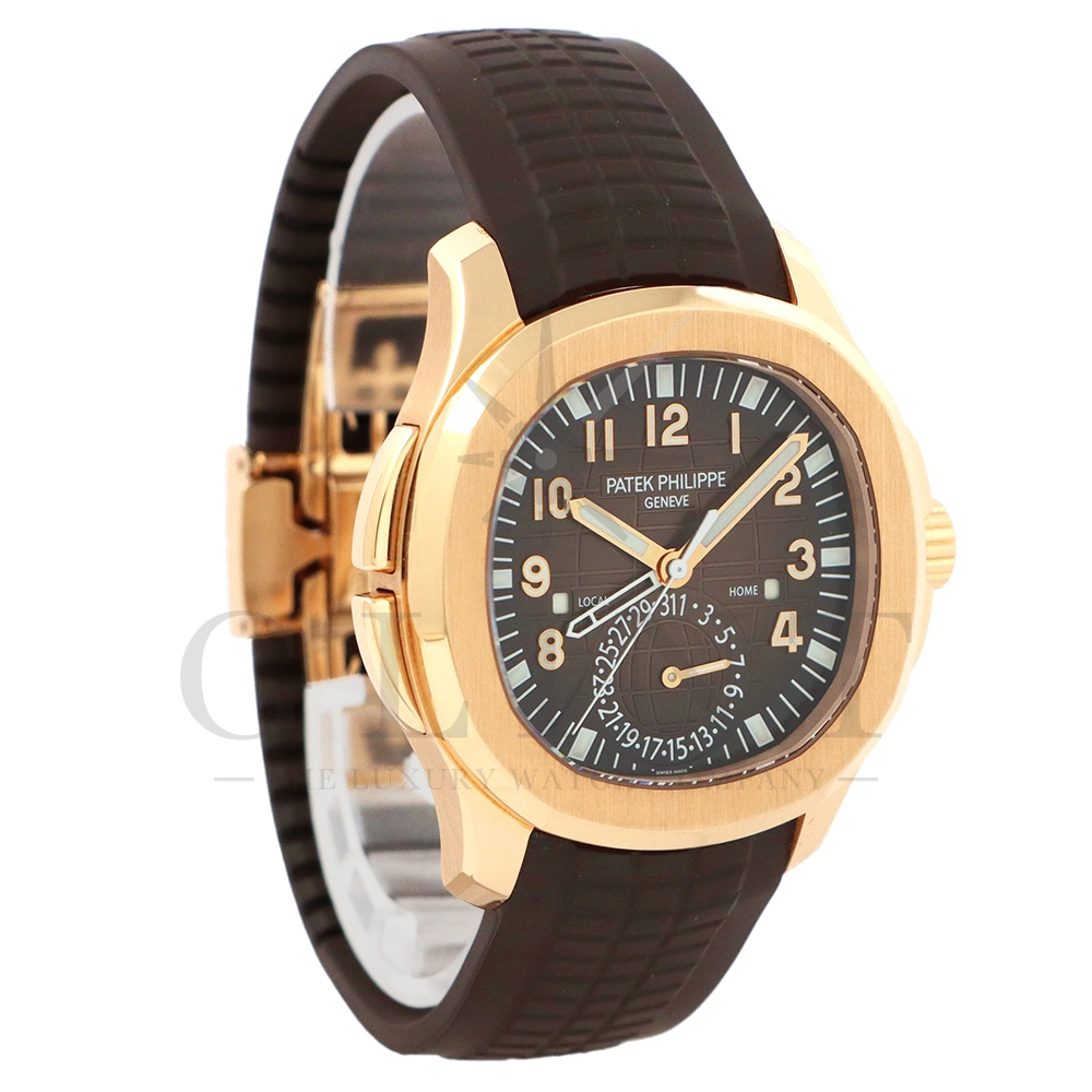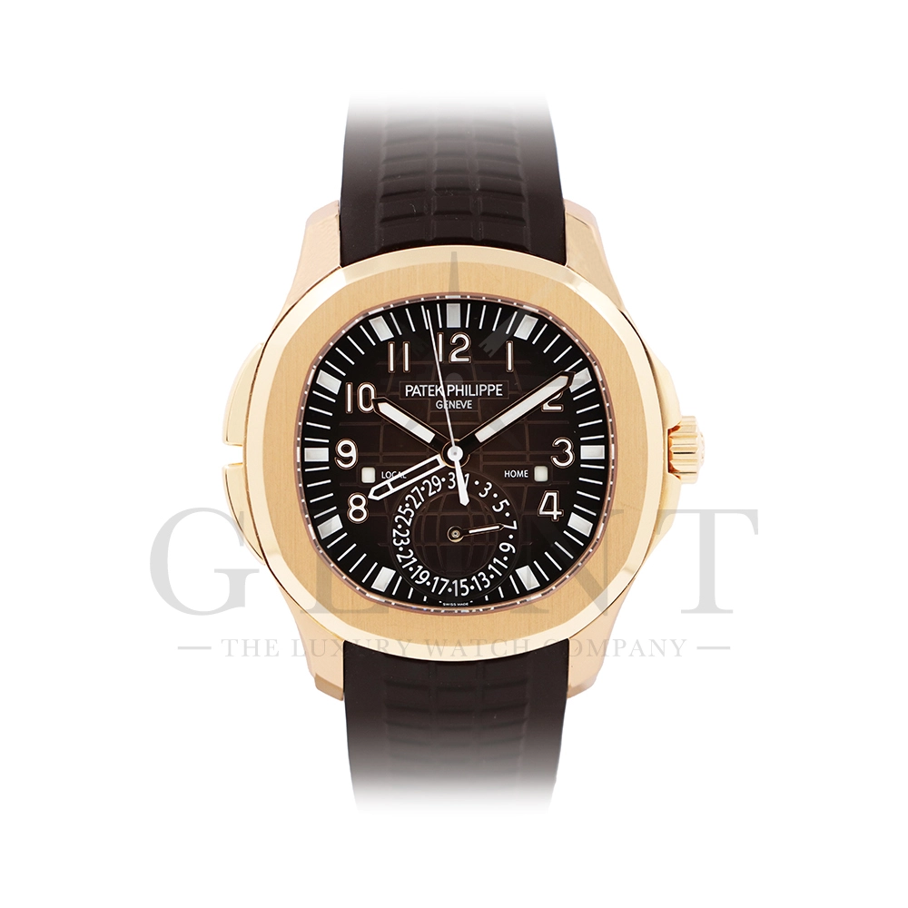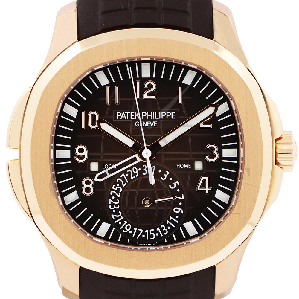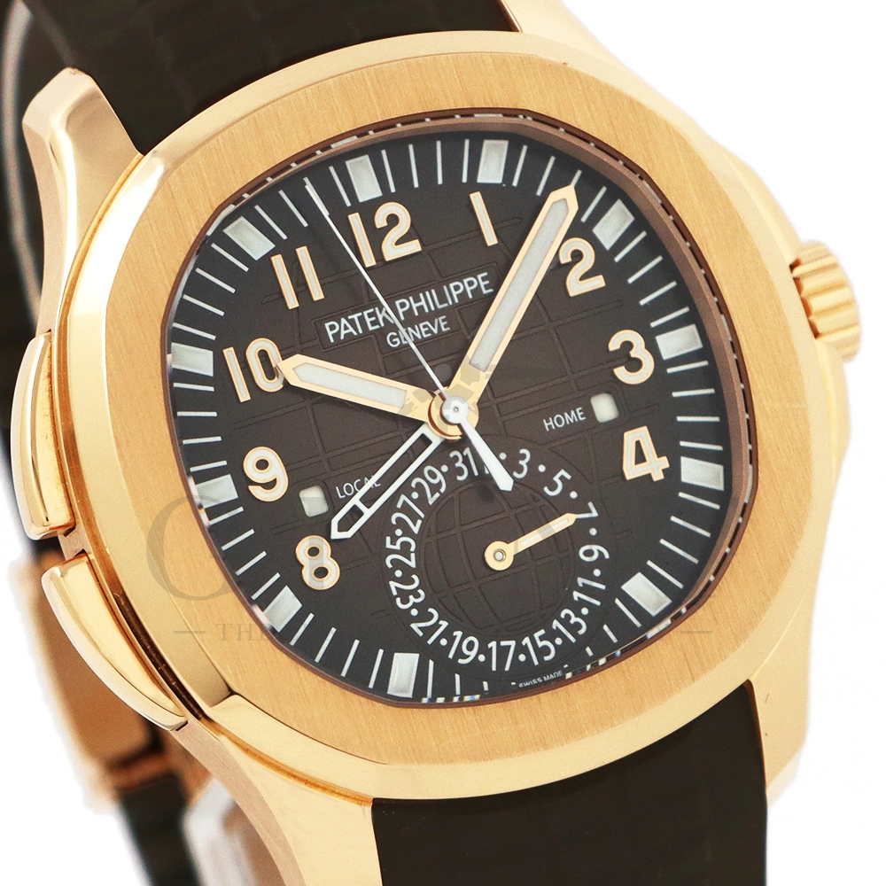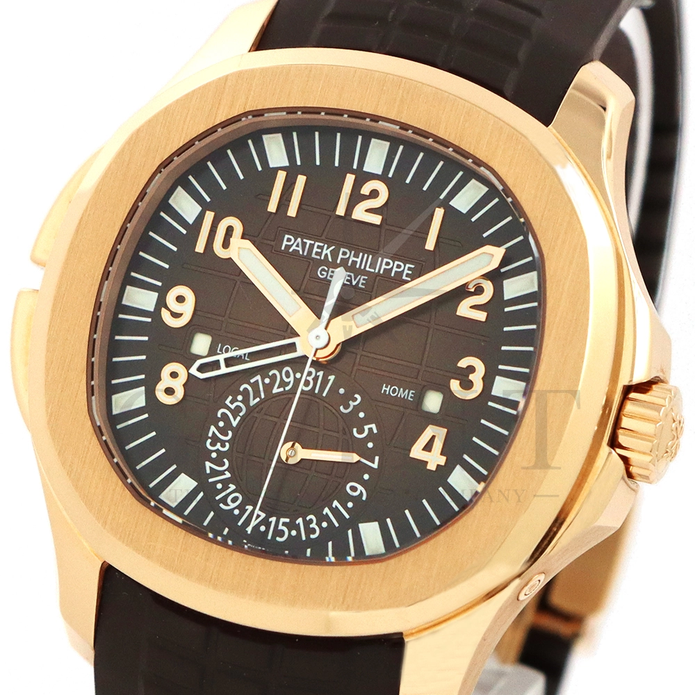 こちらはパテックフィリップ アクアノート トラベルタイム 5164R-001です。トラベルタイムは重なり合う2本の時針により、2つの異なったタイムゾーンの時刻を一目で判るように表示する機構で、こちらのモデルは出発地と現地の2つの昼夜窓表示を搭載するなど、より実用性に特化した仕様となっております。更には、12気圧防水、ねじ込み式リュウズ、海水にも耐えるコンポジット素材を採用したトロピカルバンドが最高の安全性を保証。そして美しい文字盤の構造的なデザインは、トロピカルバンドのモチーフと統一されており、丸みを帯びた八角形の驚くほどモダンなフォルムが、アクアノートの魅力を存分に引き出してくれます。