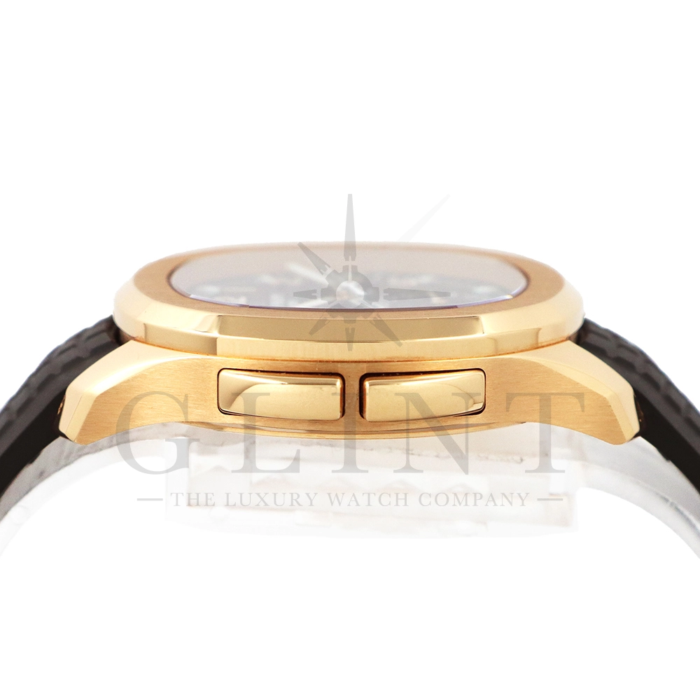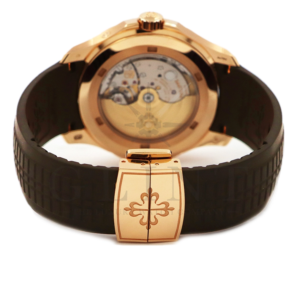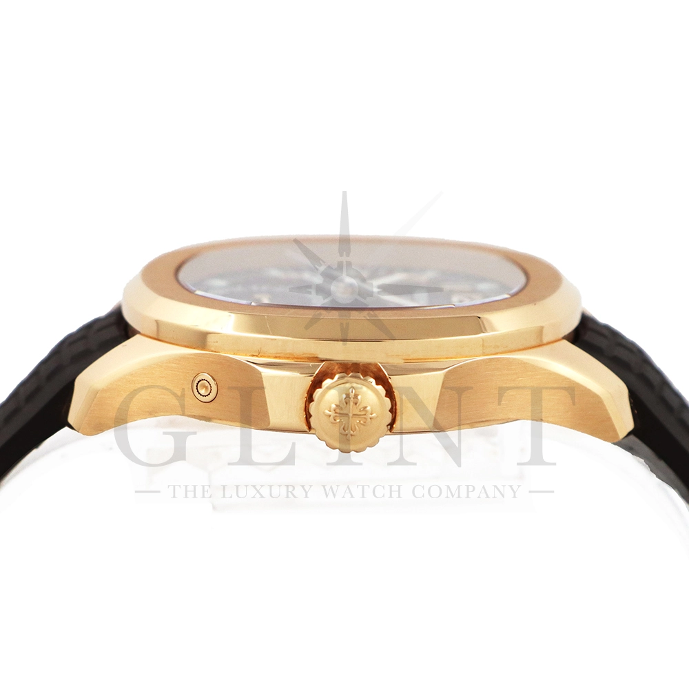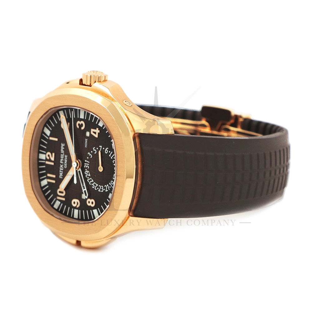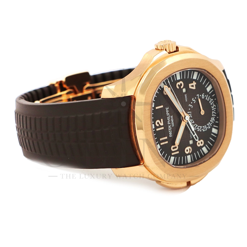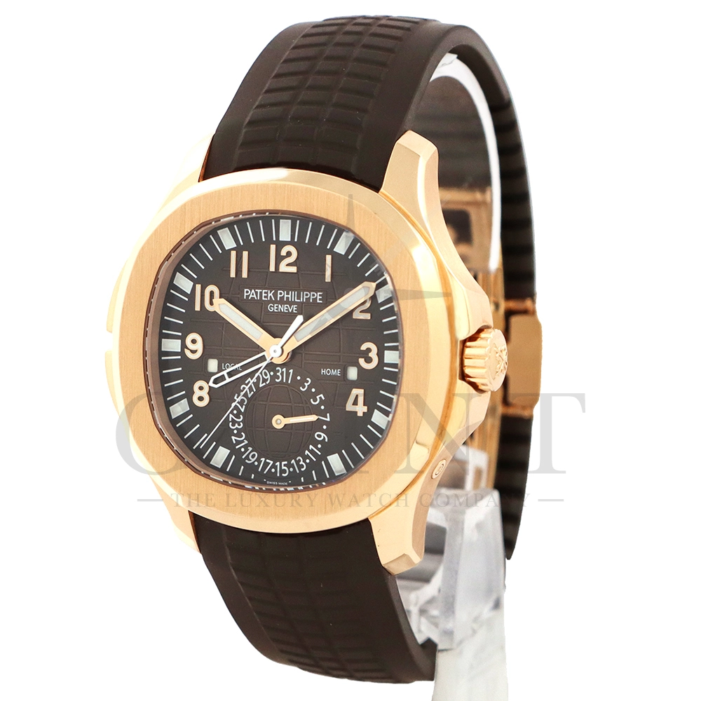 こちらはパテックフィリップ アクアノート トラベルタイム 5164R-001です。トラベルタイムは重なり合う2本の時針により、2つの異なったタイムゾーンの時刻を一目で判るように表示する機構で、こちらのモデルは出発地と現地の2つの昼夜窓表示を搭載するなど、より実用性に特化した仕様となっております。更には、12気圧防水、ねじ込み式リュウズ、海水にも耐えるコンポジット素材を採用したトロピカルバンドが最高の安全性を保証。そして美しい文字盤の構造的なデザインは、トロピカルバンドのモチーフと統一されており、丸みを帯びた八角形の驚くほどモダンなフォルムが、アクアノートの魅力を存分に引き出してくれます。