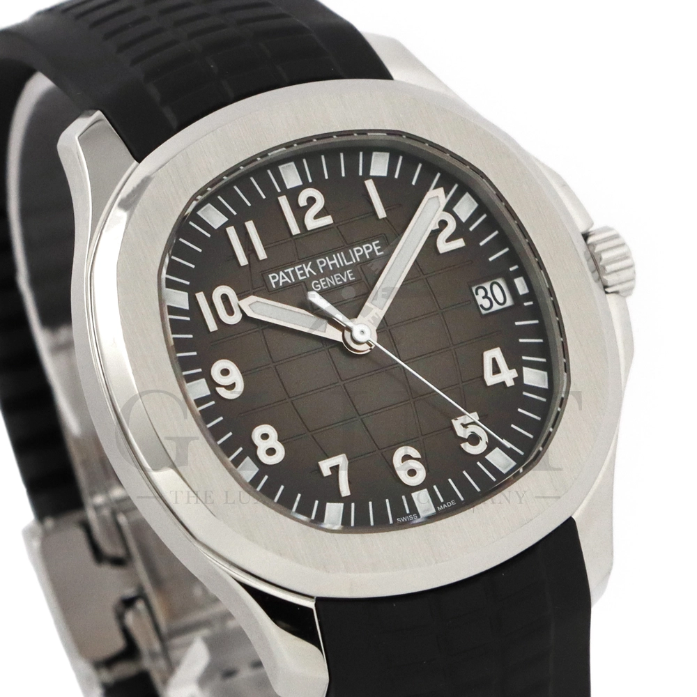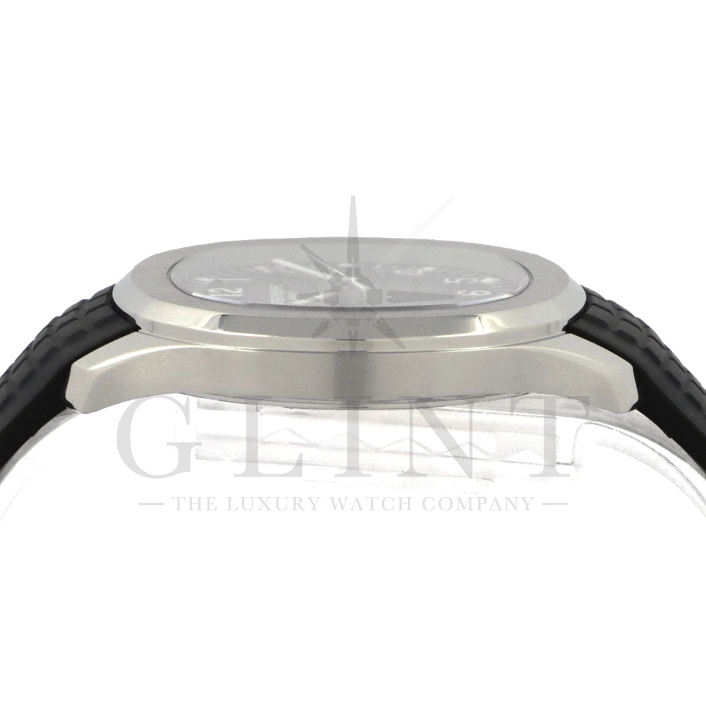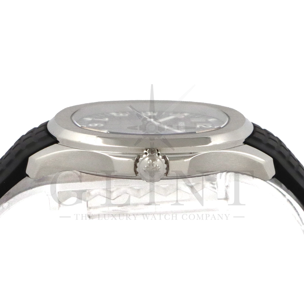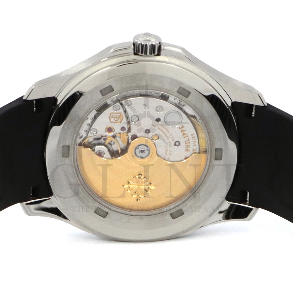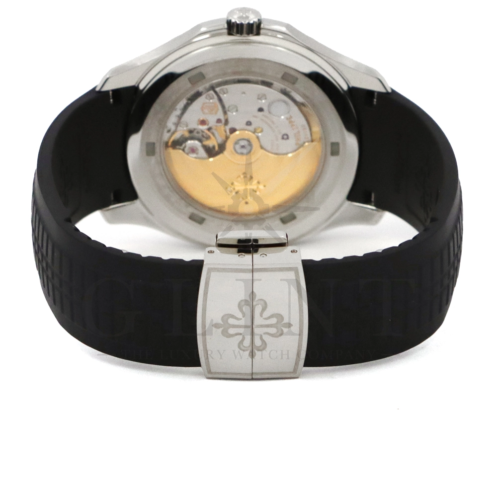 こちらはアクアノート 5167A-001です。ゆるやかな八角形のケースフォルムに、特徴的な格子状のダイアル、そして“トロピカルバンド”と呼ばれ、防水性、耐久性、紫外線耐性に優れたラバーベルトを採用したモデル。ムーブメントには2022年より採用された新型自動巻きムーブメント Cal.26-330 S C FUSを搭載。パワーリザーブは約45時間で、シースルーのケースバックからは21Kゴールドローターとムーブメントの動きをダイレクトに堪能する事ができます。洗練された大人の雰囲気を演出したい時にぴったりの一本です。