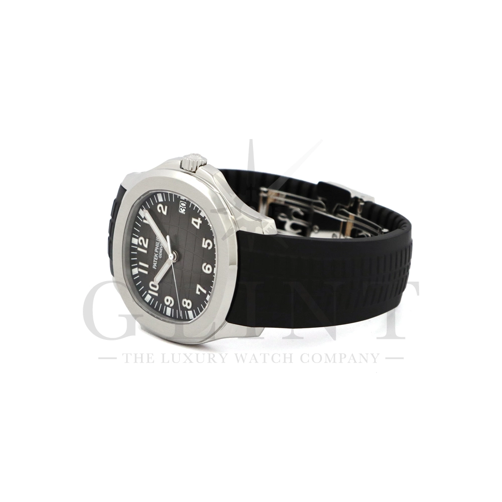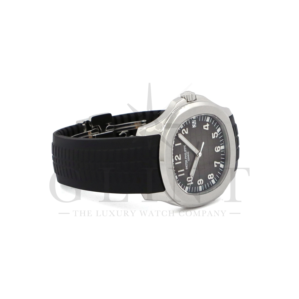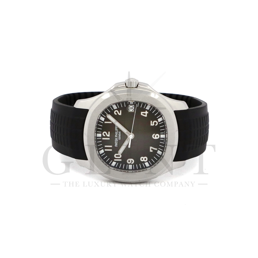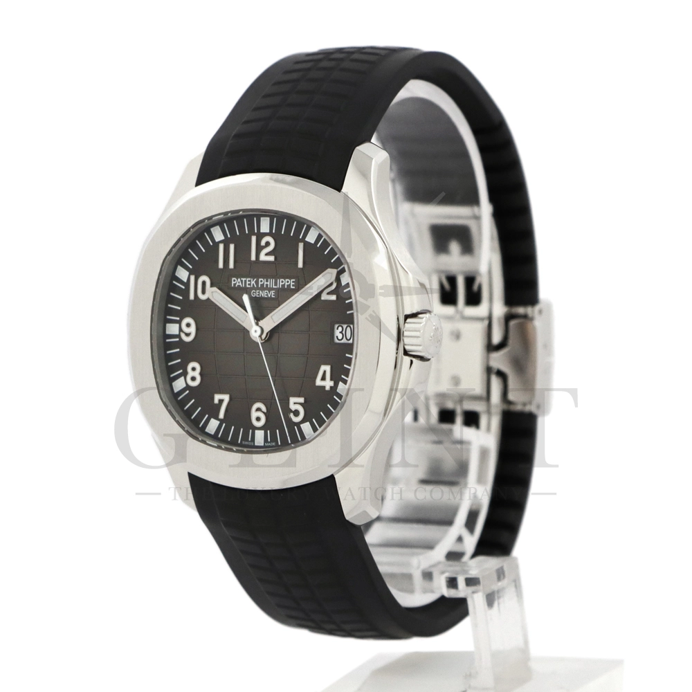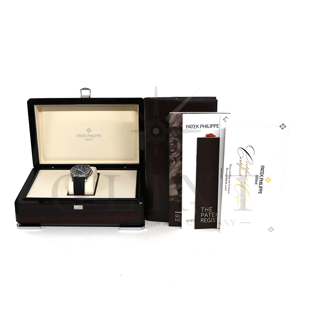 こちらはアクアノート 5167A-001です。ゆるやかな八角形のケースフォルムに、特徴的な格子状のダイアル、そして“トロピカルバンド”と呼ばれ、防水性、耐久性、紫外線耐性に優れたラバーベルトを採用したモデル。ムーブメントには2022年より採用された新型自動巻きムーブメント Cal.26-330 S C FUSを搭載。パワーリザーブは約45時間で、シースルーのケースバックからは21Kゴールドローターとムーブメントの動きをダイレクトに堪能する事ができます。洗練された大人の雰囲気を演出したい時にぴったりの一本です。
