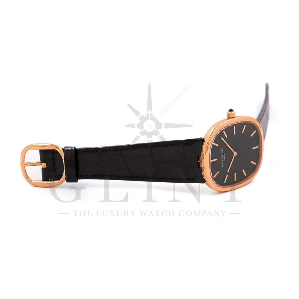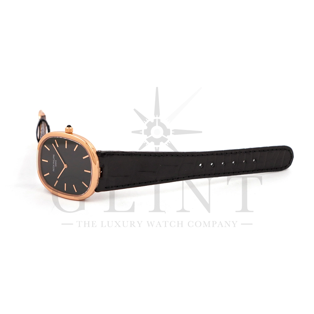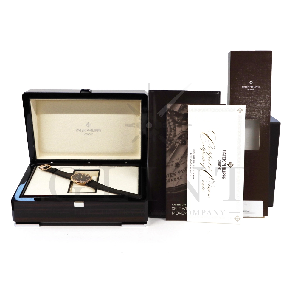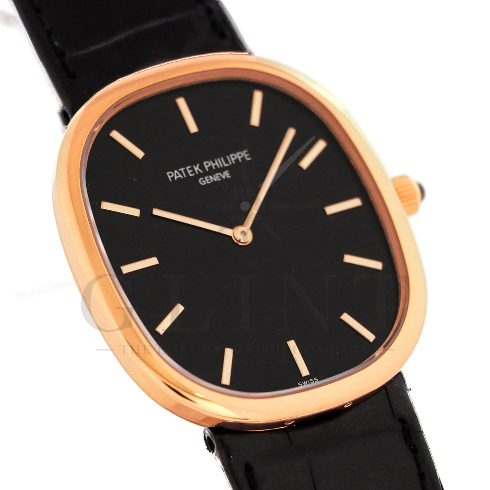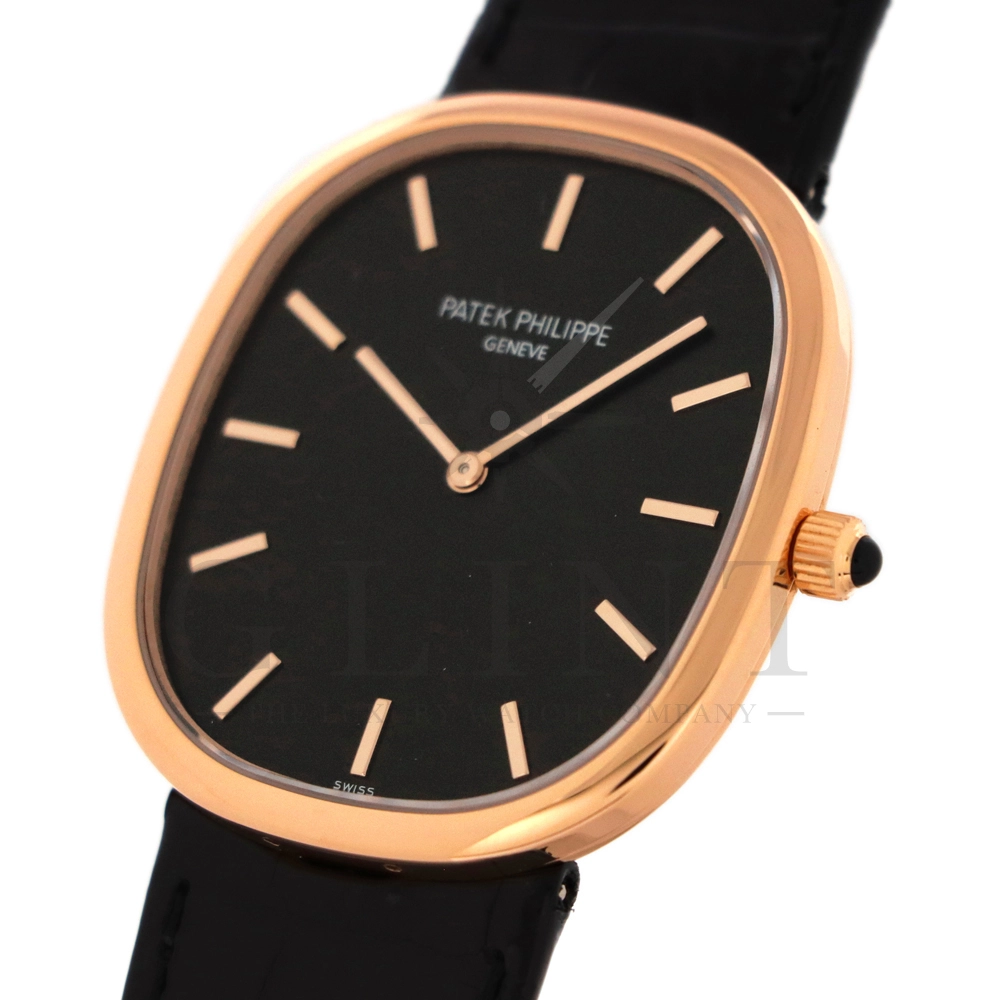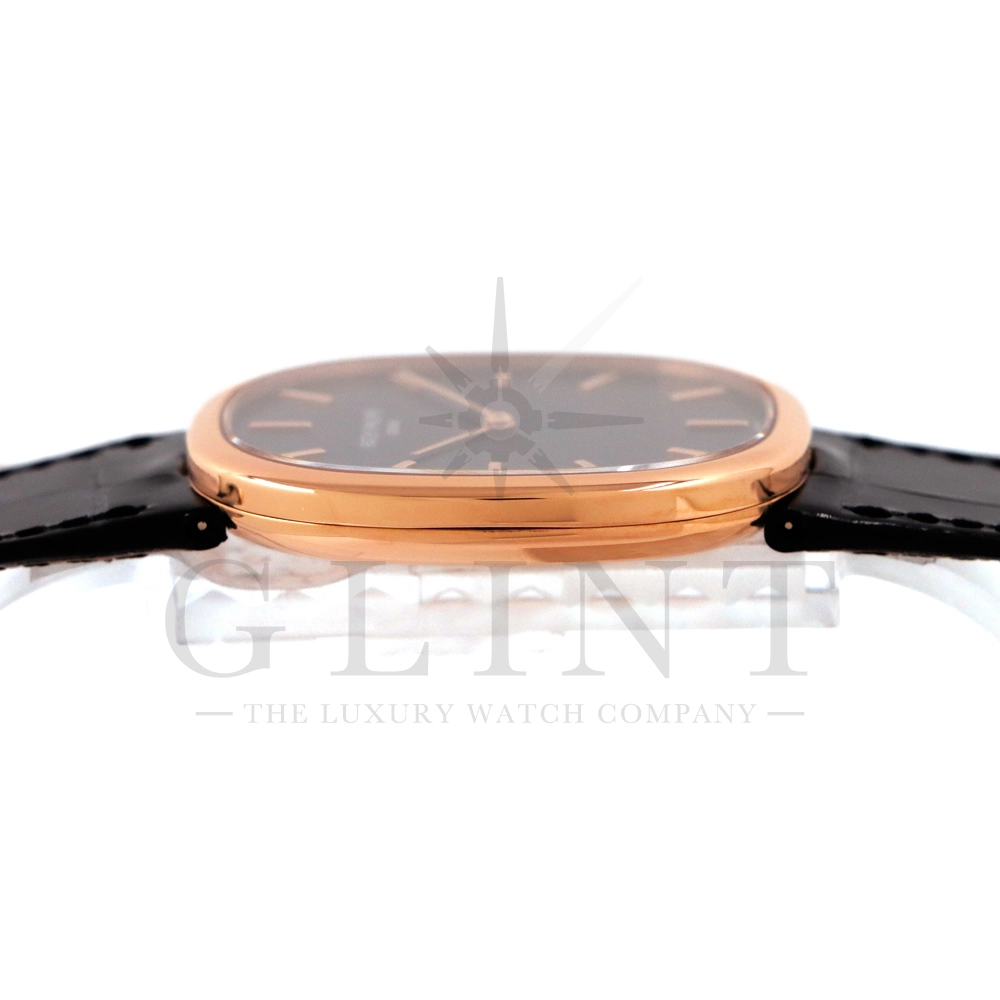 こちらはゴールデンエリプスです。誕生50周年を記念して登場したRef.5738のローズゴールドバージョン。シャイニーな文字盤とのエボニーブラック・ソレイユ文字盤との組み合わせることで独特の温かみを演出しています。ムーブメントにはCal.240を搭載。最大の長所は、22金偏心マイクロローターを搭載することで実現した2.53mmの厚さであり、今やパテック フィリップの時計製造において欠かせないムーブメントです。 上品な大人の雰囲気を醸し出す極上の一本となります。