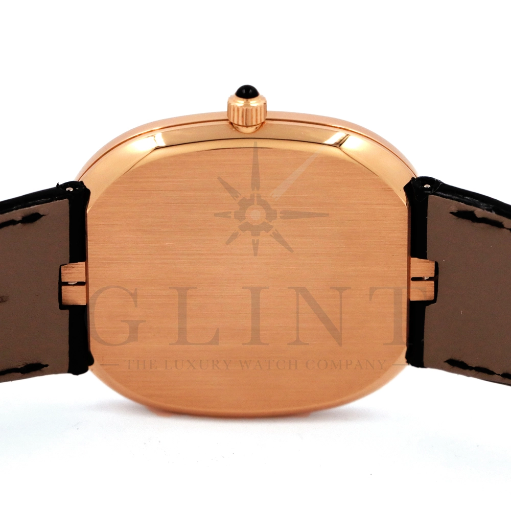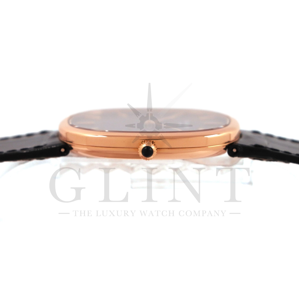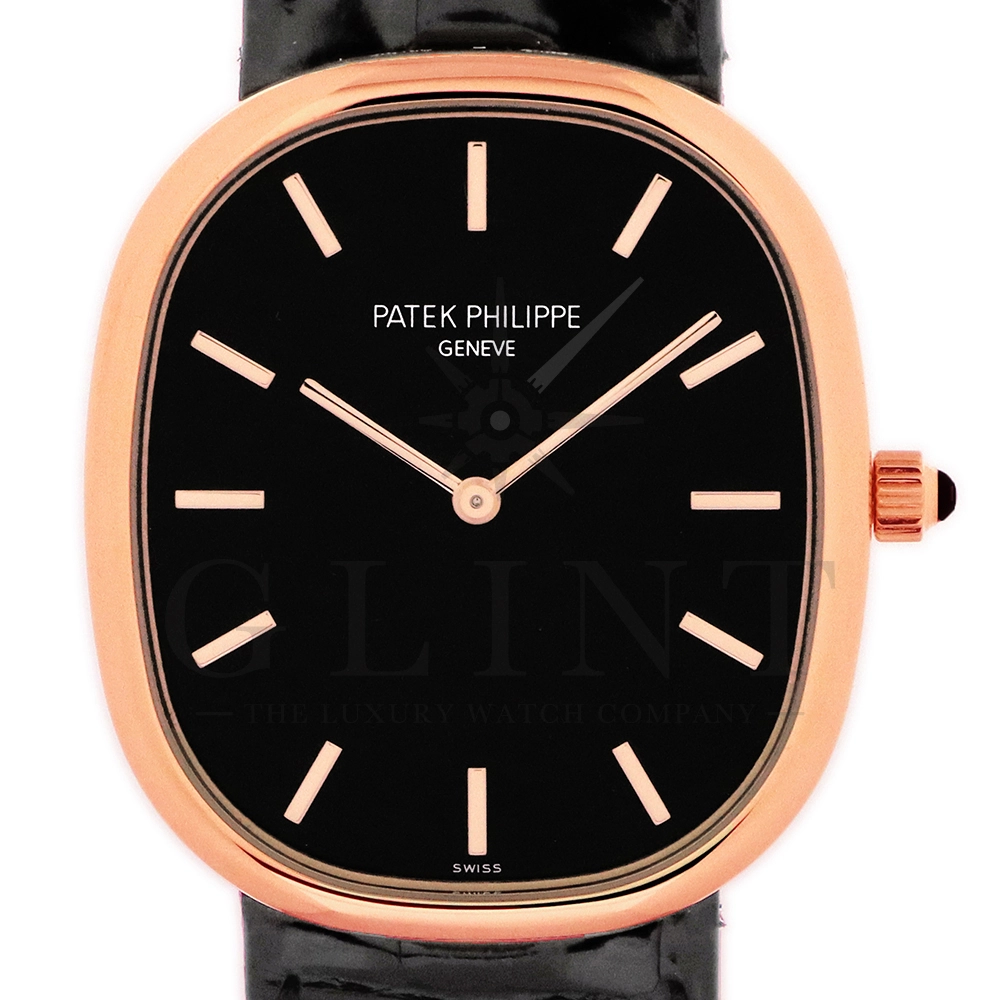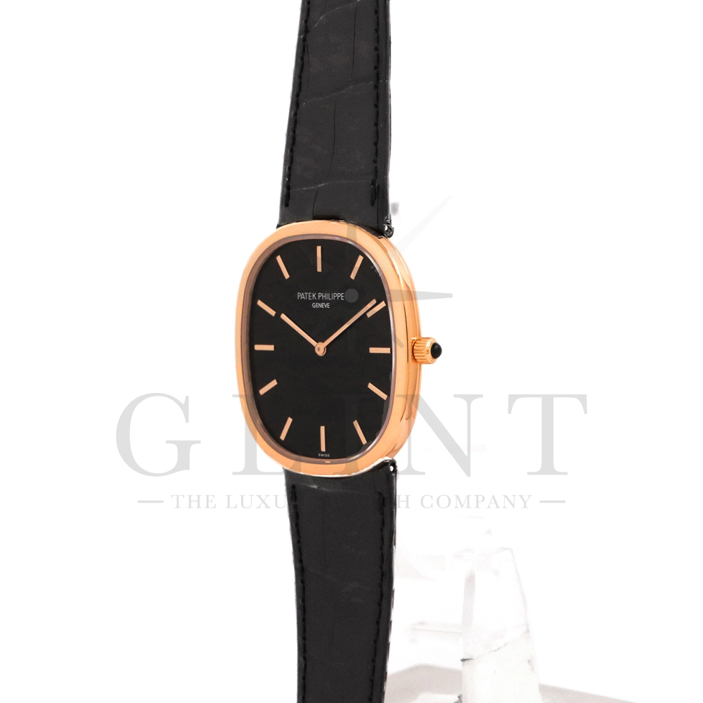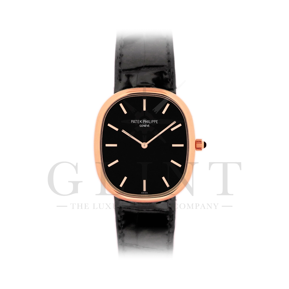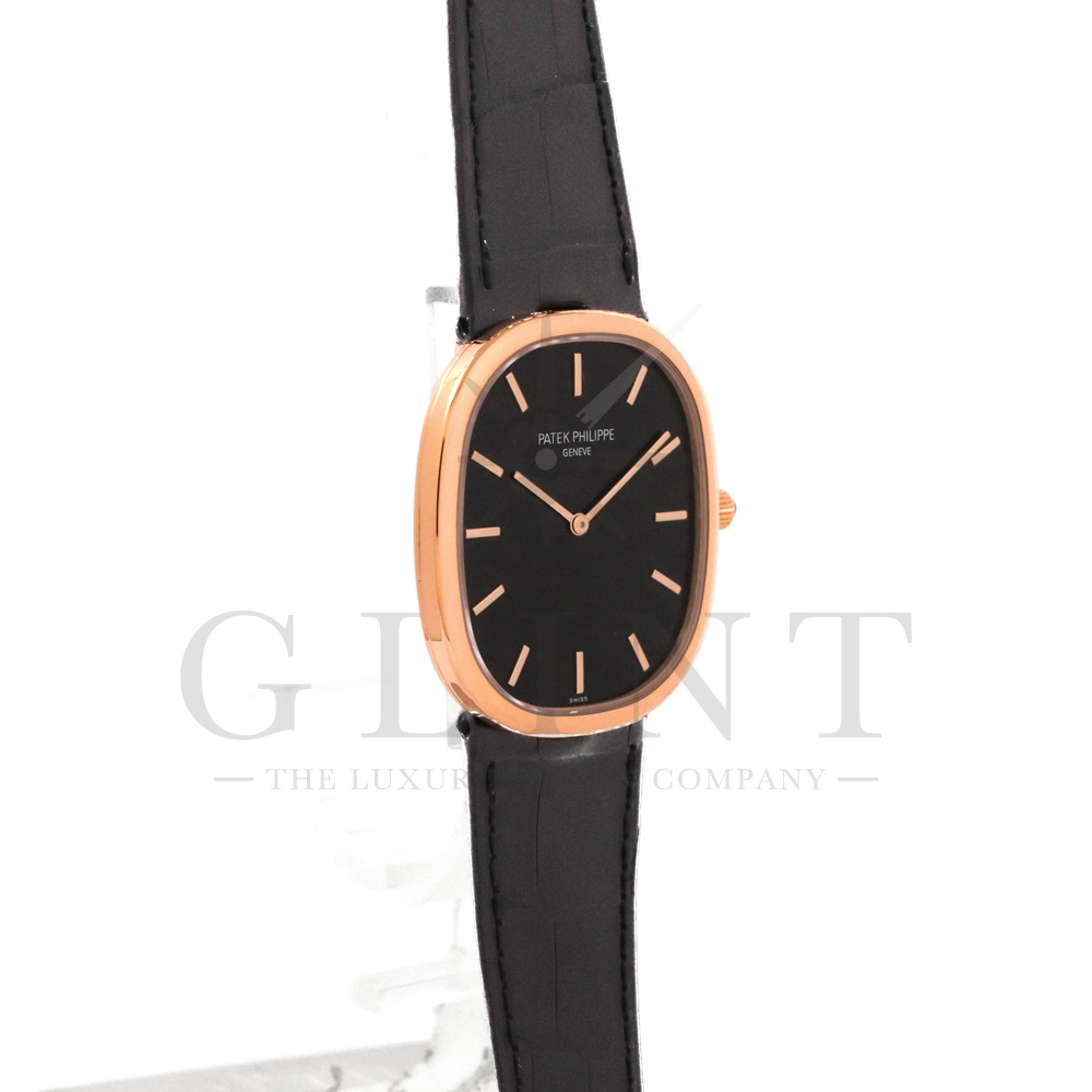こちらはゴールデンエリプスです。誕生50周年を記念して登場したRef.5738のローズゴールドバージョン。シャイニーな文字盤とのエボニーブラック・ソレイユ文字盤との組み合わせることで独特の温かみを演出しています。ムーブメントにはCal.240を搭載。最大の長所は、22金偏心マイクロローターを搭載することで実現した2.53mmの厚さであり、今やパテック フィリップの時計製造において欠かせないムーブメントです。 上品な大人の雰囲気を醸し出す極上の一本となります。