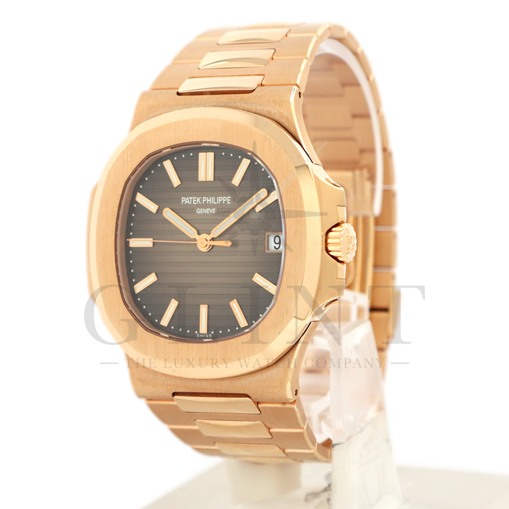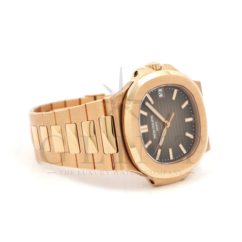 こちらはパテックフィリップ ノーチラス 5711/1R-001です。素材にローズゴールドを使用し、高級感を存分に押し出したブレスレットタイプのノーチラス。ローズゴールドモデルにしか配されないブラウンを基調としたグラデーションカラーの文字盤との絶妙なコントラストは所有者を格別な気持ちにさせてくれるでしょう。ブレスレットはケース厚8.3mmの薄型に合わせて仕上げられており、ゴールド素材ならではの重量感もしっかり味わえる事ながら、腕元への絶妙なフィット感が抜群の着け心地と装着感を与えてくれます。シンプルながらもエレガントでラグジュアリーな印象を与えてくれるノーチラス。名実ともに世界最高の高級時計ブランドが誇る極上のタイムピースです。
