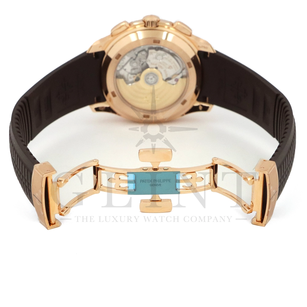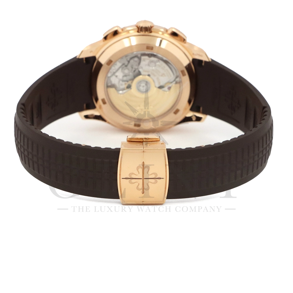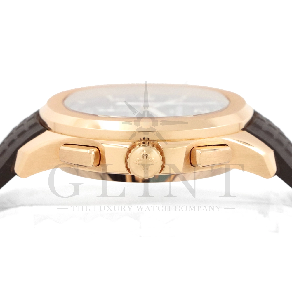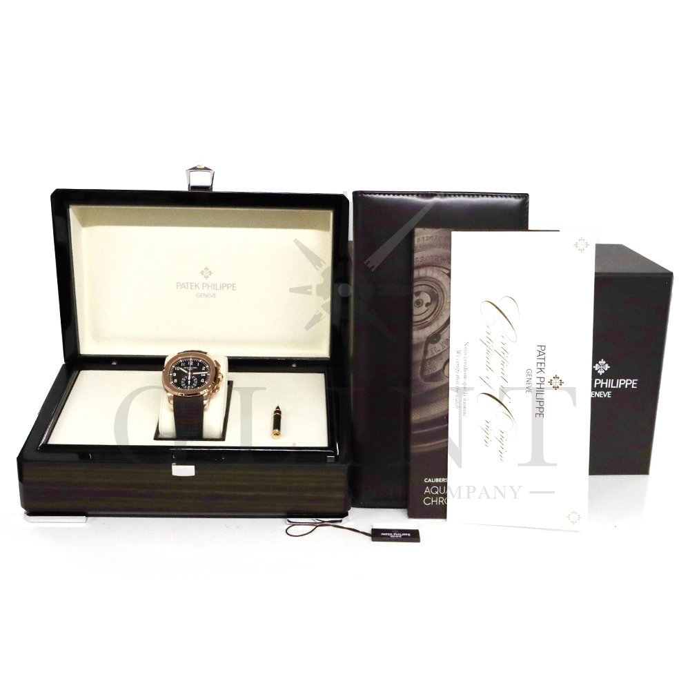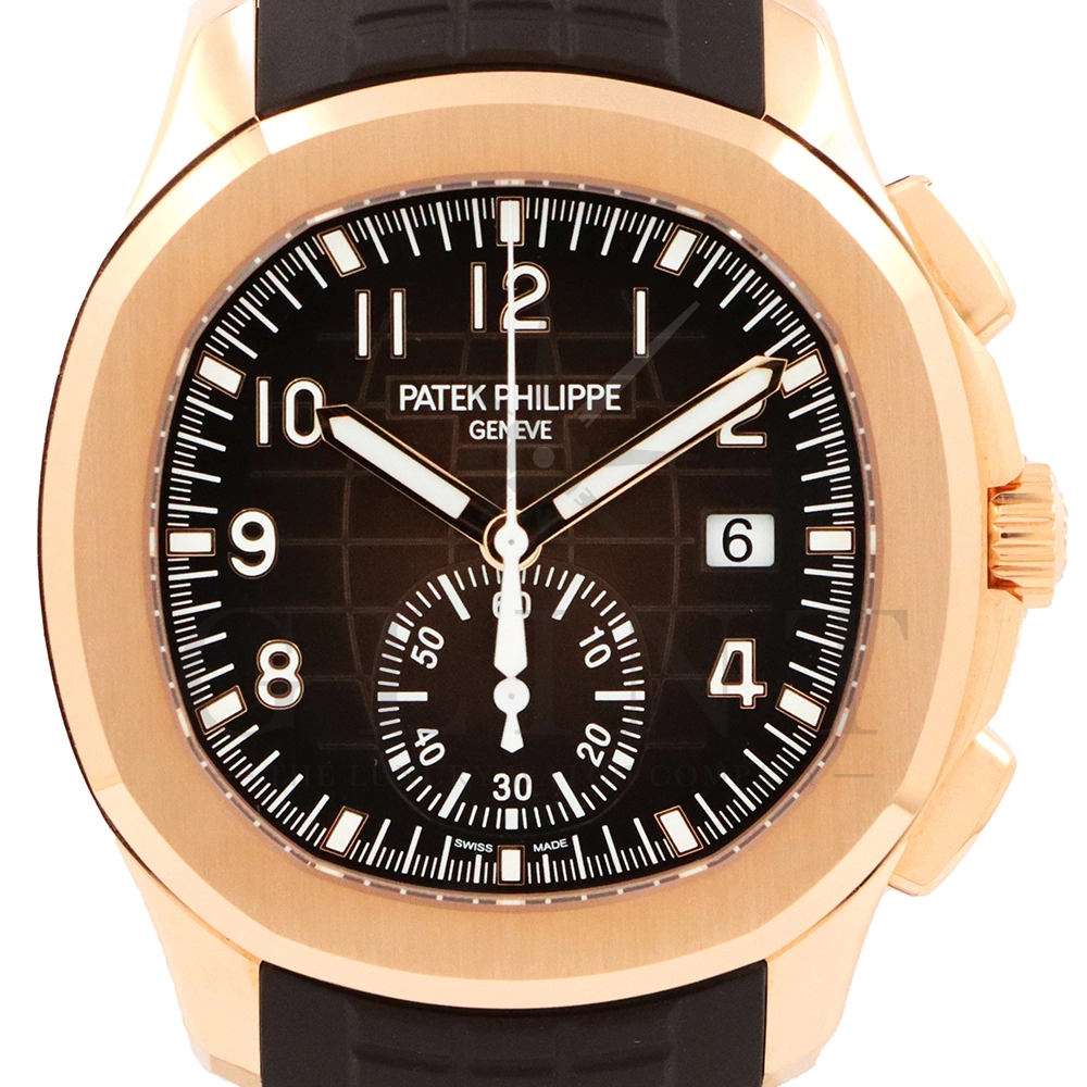 こちらはアクアノート フライバック クロノグラフ 5968R-001です。2023年に登場したアクアノート フライバック クロノグラフ初のローズゴールドモデル。ケースサイズは大きく、通称”JUMBO”と言われるジャンボサイズの42.2mmとなっております。エンボス加工のブラック・グラデーションのブラウン・ソレイユ文字盤にホワイトカラーのクロノグラフ針、60分積算計針がアクセントとなっており、爽やかな印象を与えてくれるでしょう。搭載されているフライバッククロノグラフ自動巻きムーブメント Cal.CH 28-520 C/528は5960Pや5980/1Aから系譜されてきたキャリバーで、ムーブメントの動きをシースルーバックから堪能する事ができます。12気圧防水、ねじ込み式リュウズ、ラバーベルトは海水にも耐えるコンポジット素材を採用。カジュアルながらもパテックフィリップらしい上品な雰囲気も感じさせてくれる魅力的な一本です。