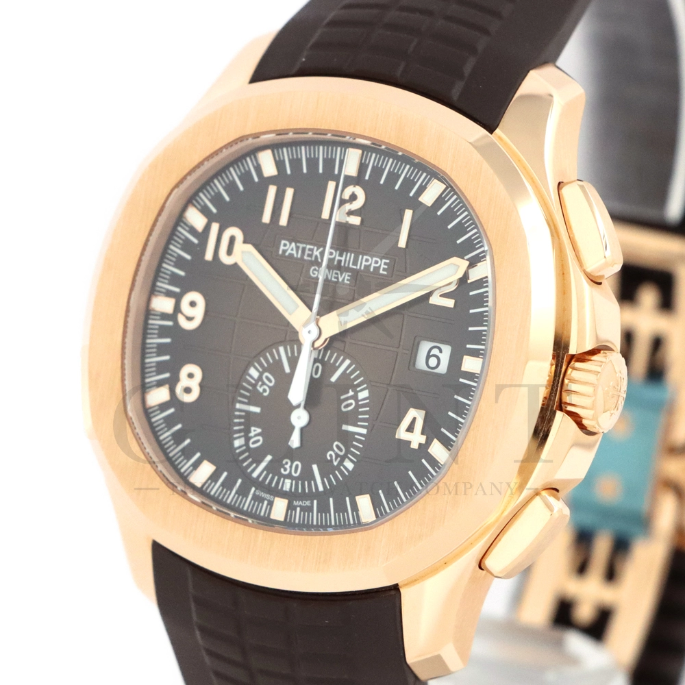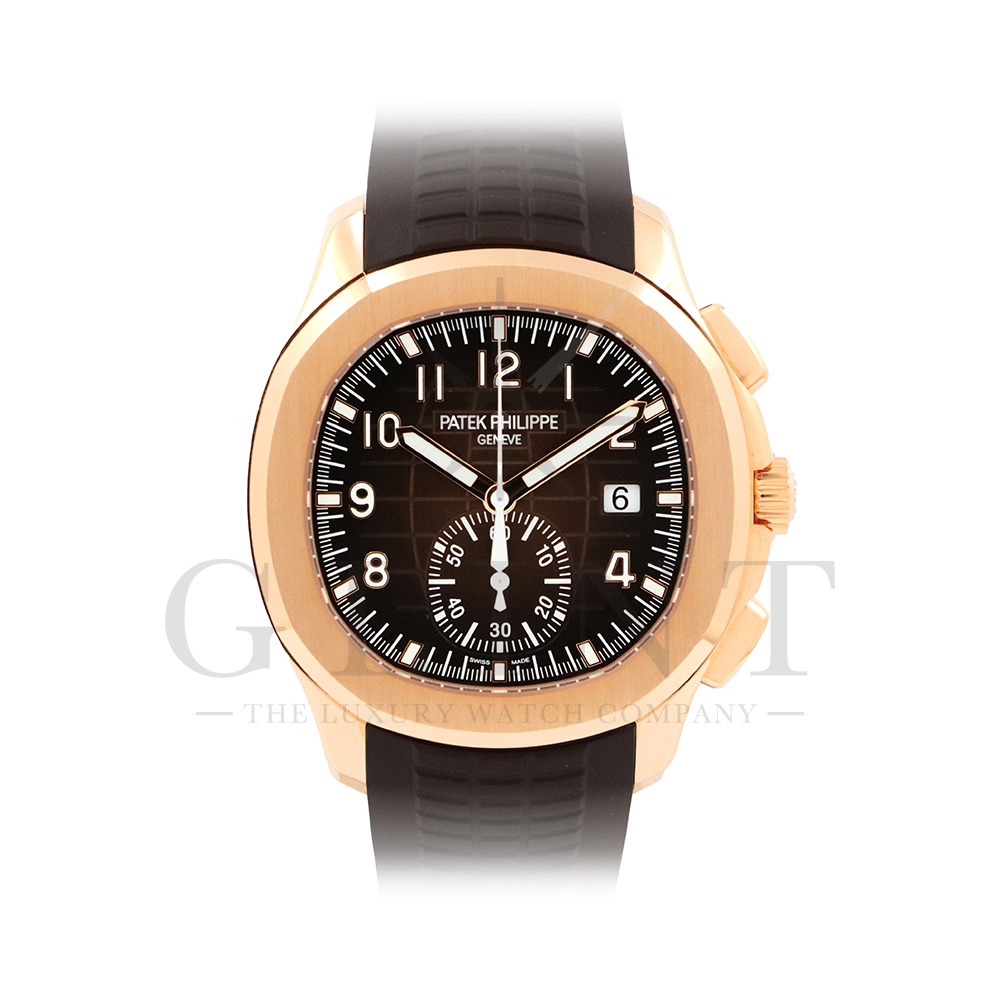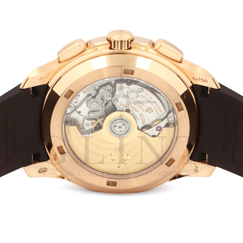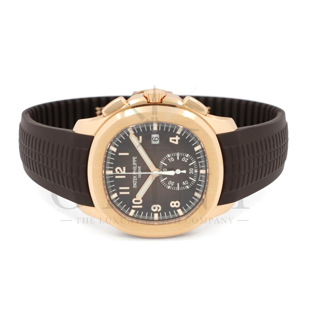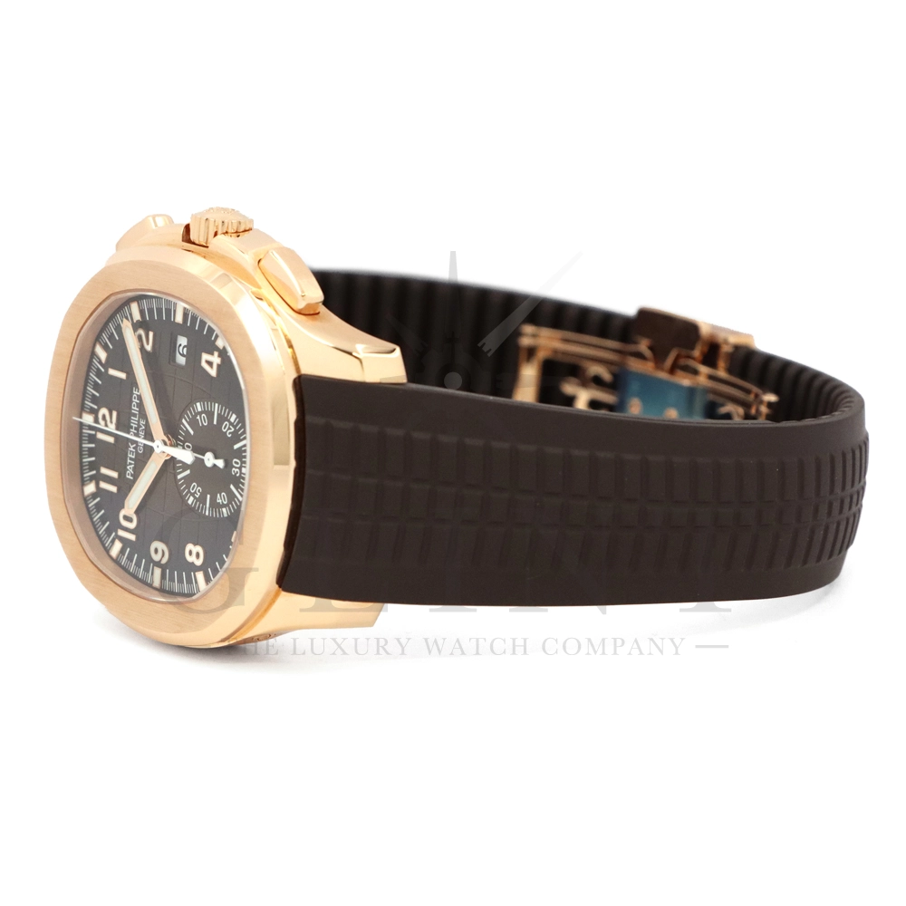 こちらはアクアノート フライバック クロノグラフ 5968R-001です。2023年に登場したアクアノート フライバック クロノグラフ初のローズゴールドモデル。ケースサイズは大きく、通称”JUMBO”と言われるジャンボサイズの42.2mmとなっております。エンボス加工のブラック・グラデーションのブラウン・ソレイユ文字盤にホワイトカラーのクロノグラフ針、60分積算計針がアクセントとなっており、爽やかな印象を与えてくれるでしょう。搭載されているフライバッククロノグラフ自動巻きムーブメント Cal.CH 28-520 C/528は5960Pや5980/1Aから系譜されてきたキャリバーで、ムーブメントの動きをシースルーバックから堪能する事ができます。12気圧防水、ねじ込み式リュウズ、ラバーベルトは海水にも耐えるコンポジット素材を採用。カジュアルながらもパテックフィリップらしい上品な雰囲気も感じさせてくれる魅力的な一本です。