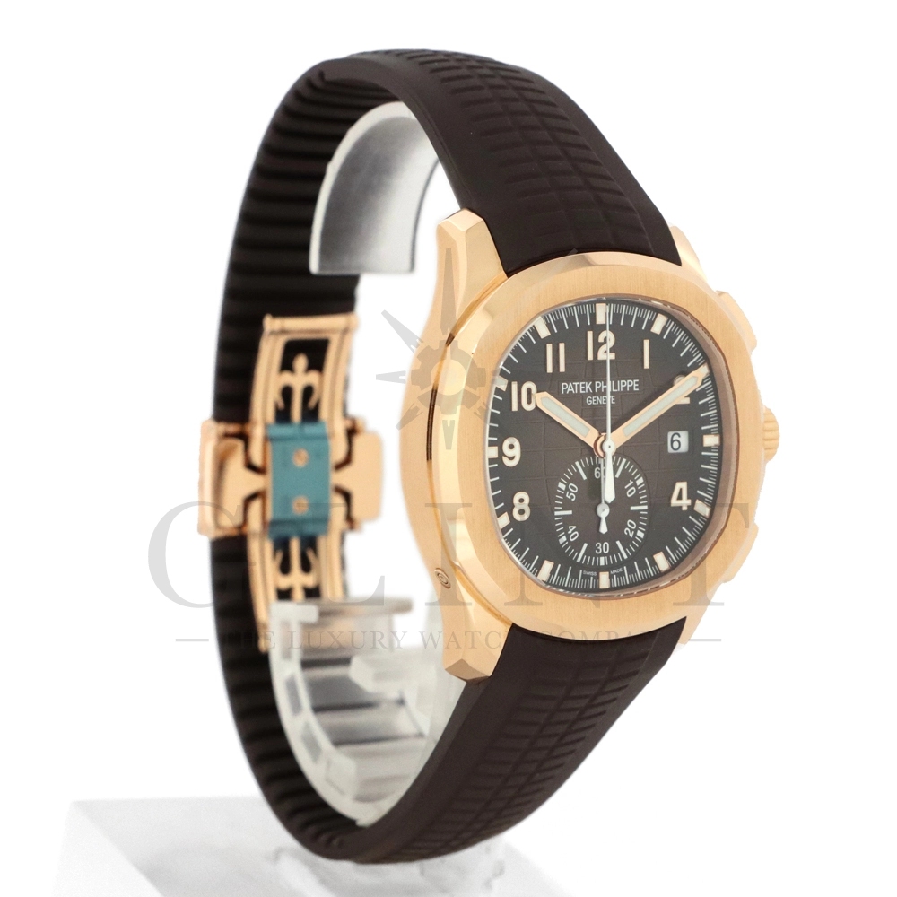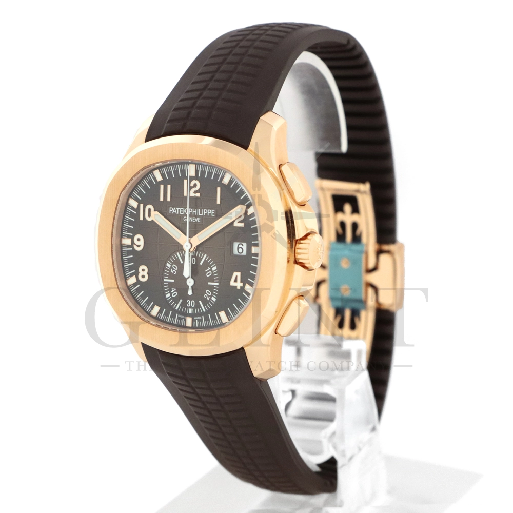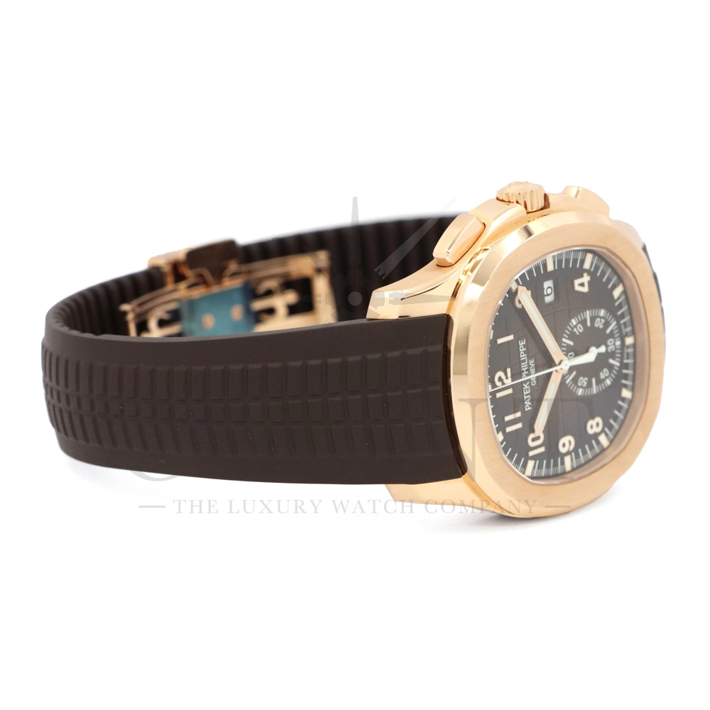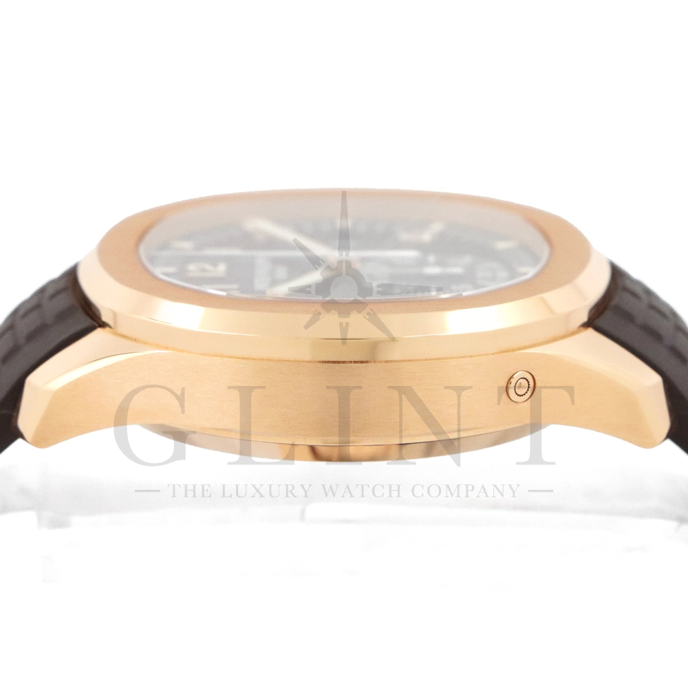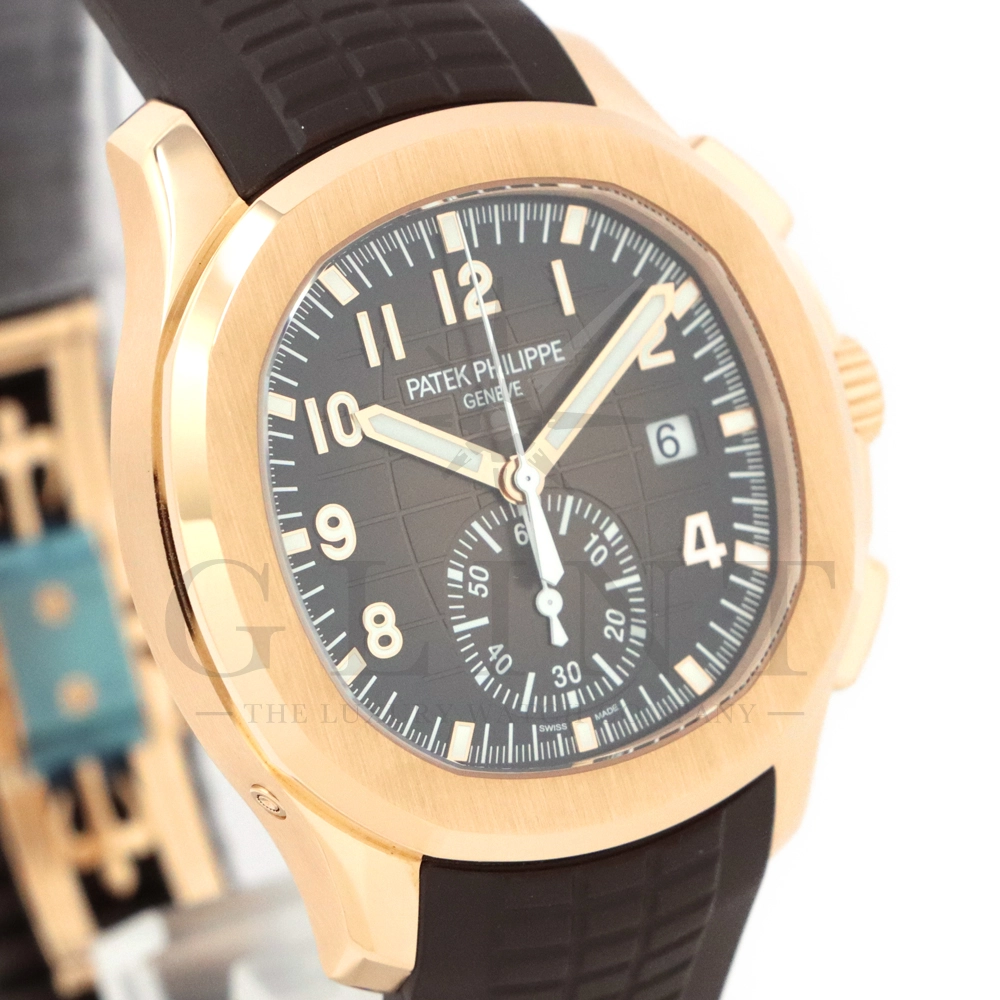 こちらはアクアノート フライバック クロノグラフ 5968R-001です。2023年に登場したアクアノート フライバック クロノグラフ初のローズゴールドモデル。ケースサイズは大きく、通称”JUMBO”と言われるジャンボサイズの42.2mmとなっております。エンボス加工のブラック・グラデーションのブラウン・ソレイユ文字盤にホワイトカラーのクロノグラフ針、60分積算計針がアクセントとなっており、爽やかな印象を与えてくれるでしょう。搭載されているフライバッククロノグラフ自動巻きムーブメント Cal.CH 28-520 C/528は5960Pや5980/1Aから系譜されてきたキャリバーで、ムーブメントの動きをシースルーバックから堪能する事ができます。12気圧防水、ねじ込み式リュウズ、ラバーベルトは海水にも耐えるコンポジット素材を採用。カジュアルながらもパテックフィリップらしい上品な雰囲気も感じさせてくれる魅力的な一本です。