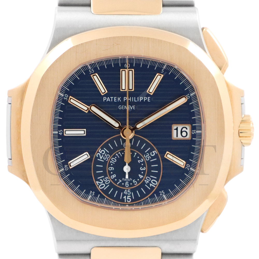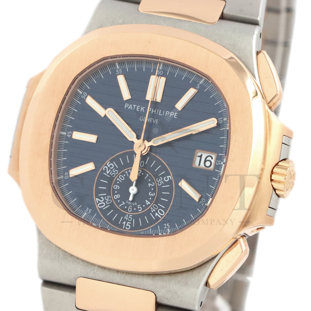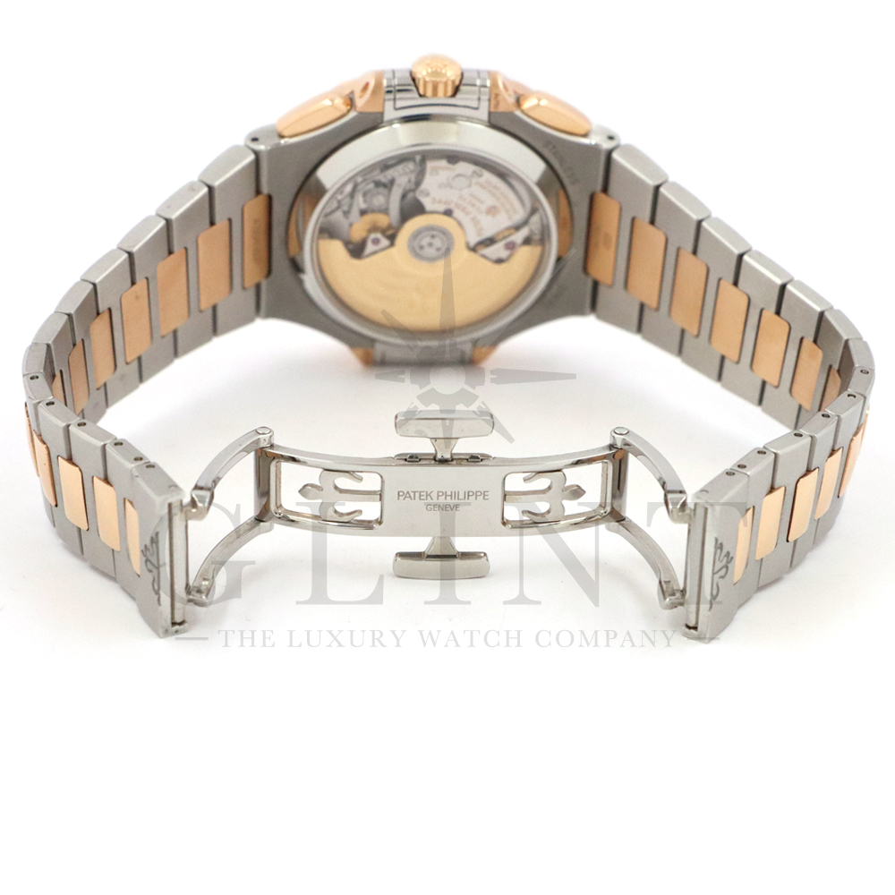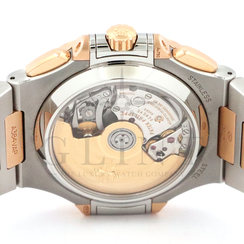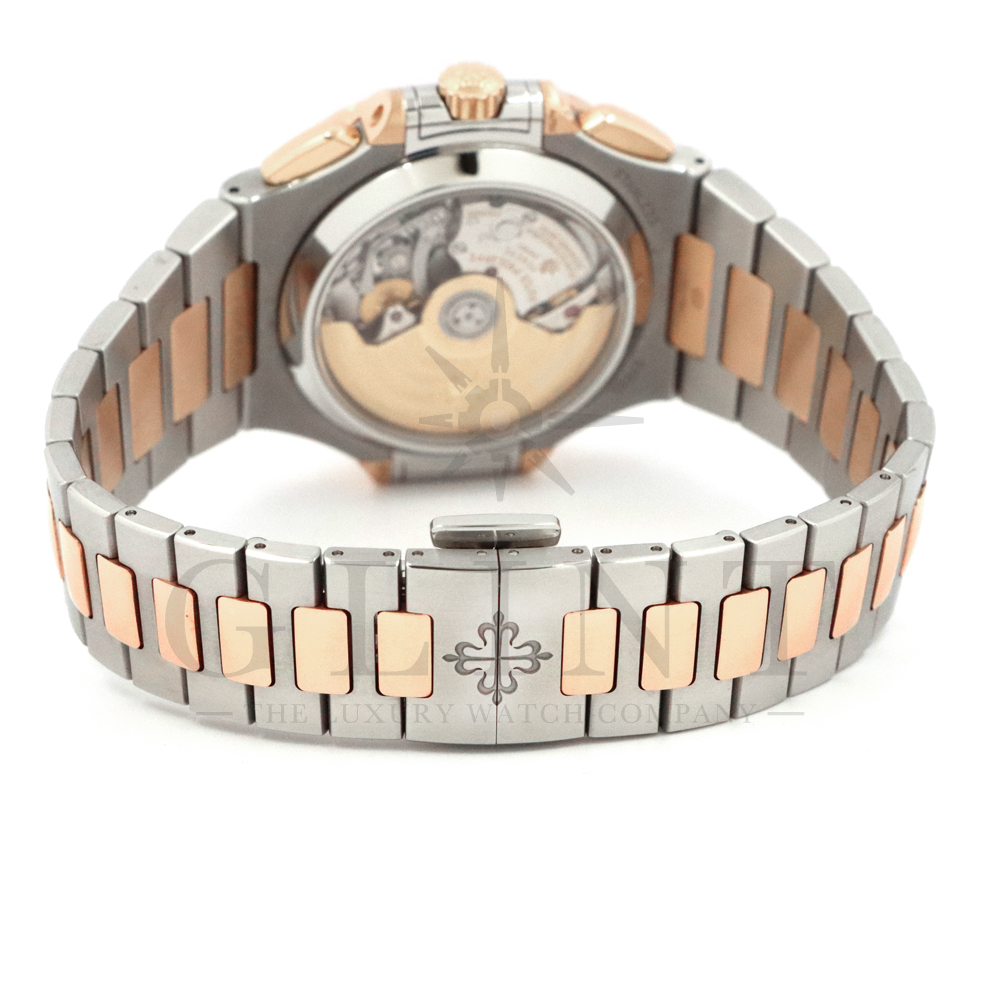 こちらはノーチラス初のスポーツクロノグラフ Ref.5980/1AR-001。ケースとベルトにステンレススティールとローズゴールドを使用したラグジュアリーなモデルでブルー・グラデーション文字盤との組み合わせによって上品な雰囲気を演出してくれます。また、見た目の華やかさのみならず、言わずと知れた機能性と信頼性が凝縮された珠玉の一本であり、他のクロノグラフとは一線を画す唯一無二のモデルです。シースルーのケースバックからは、自社開発自動巻きクロノグラフ「Cal.CH28-520」を覗き見る事ができ、機械式時計の最高峰を追及した名門パテックフィリップが作り出す独自の世界観を存分に堪能することができるでしょう。