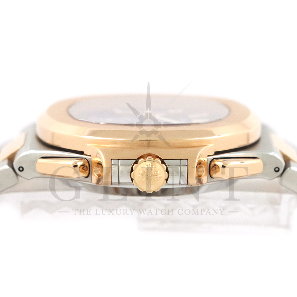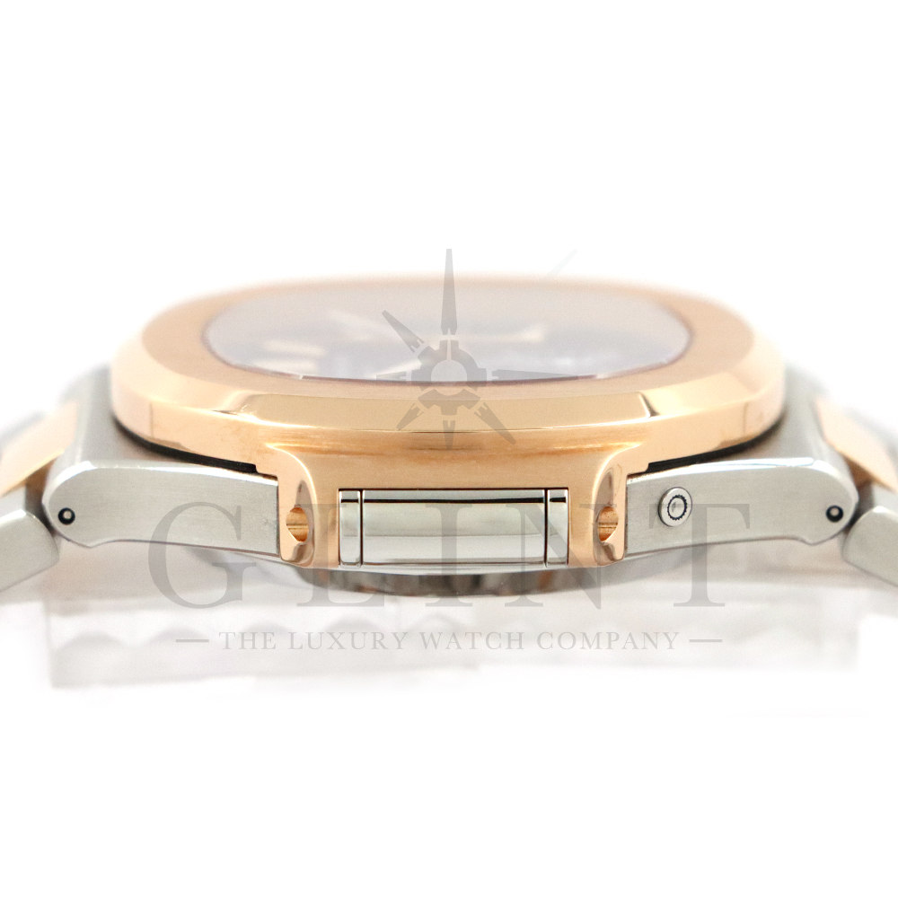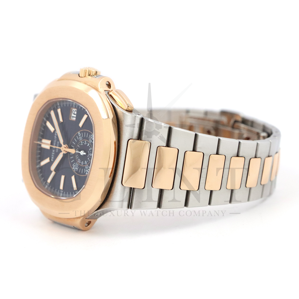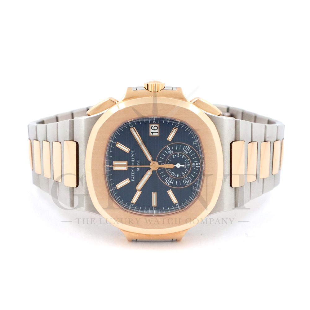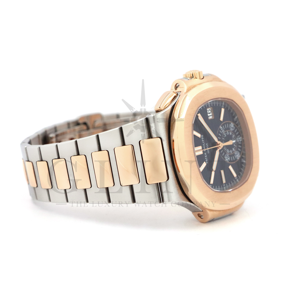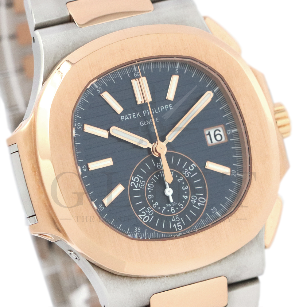 こちらはノーチラス初のスポーツクロノグラフ Ref.5980/1AR-001。ケースとベルトにステンレススティールとローズゴールドを使用したラグジュアリーなモデルでブルー・グラデーション文字盤との組み合わせによって上品な雰囲気を演出してくれます。また、見た目の華やかさのみならず、言わずと知れた機能性と信頼性が凝縮された珠玉の一本であり、他のクロノグラフとは一線を画す唯一無二のモデルです。シースルーのケースバックからは、自社開発自動巻きクロノグラフ「Cal.CH28-520」を覗き見る事ができ、機械式時計の最高峰を追及した名門パテックフィリップが作り出す独自の世界観を存分に堪能することができるでしょう。