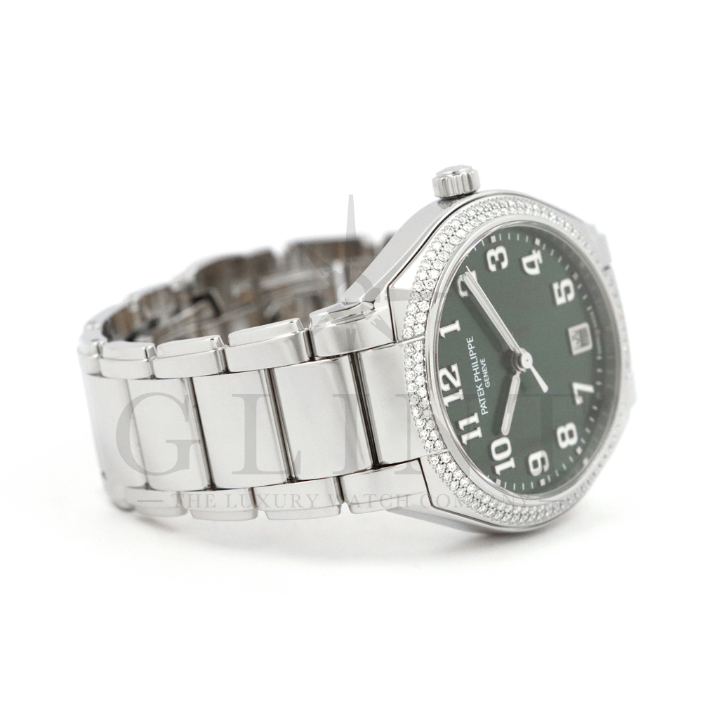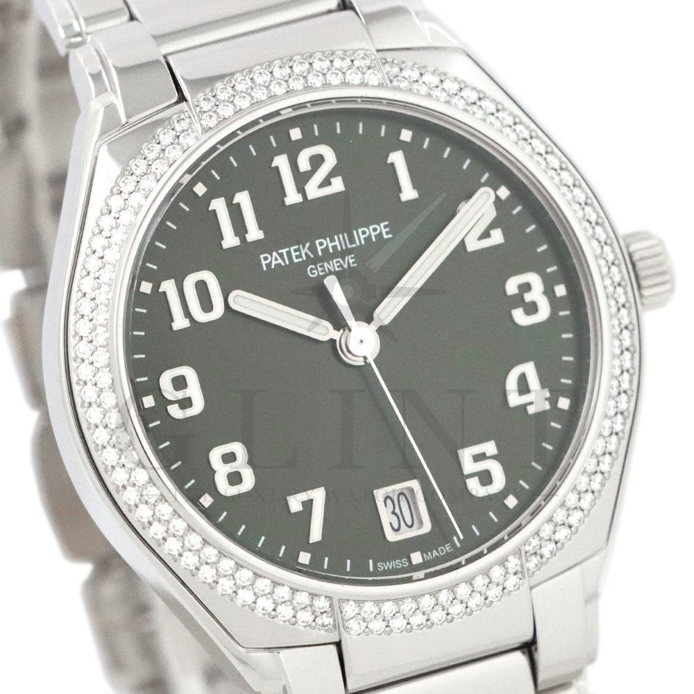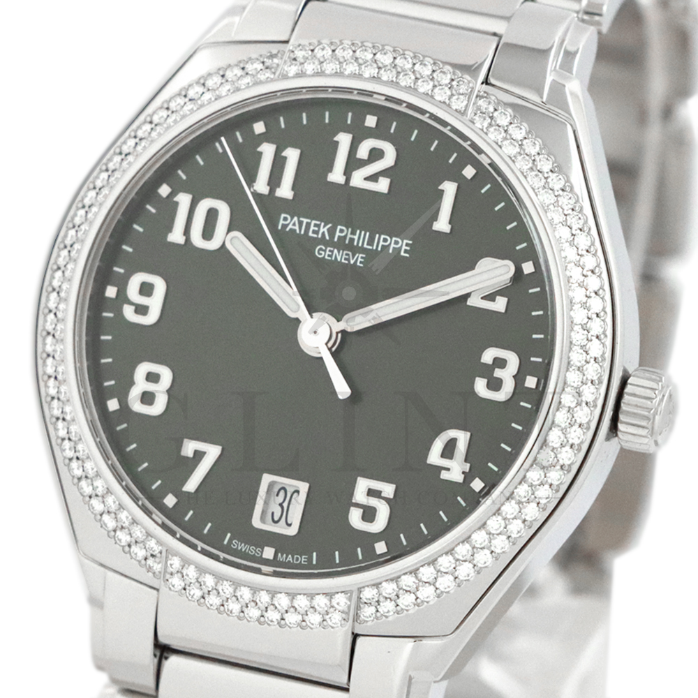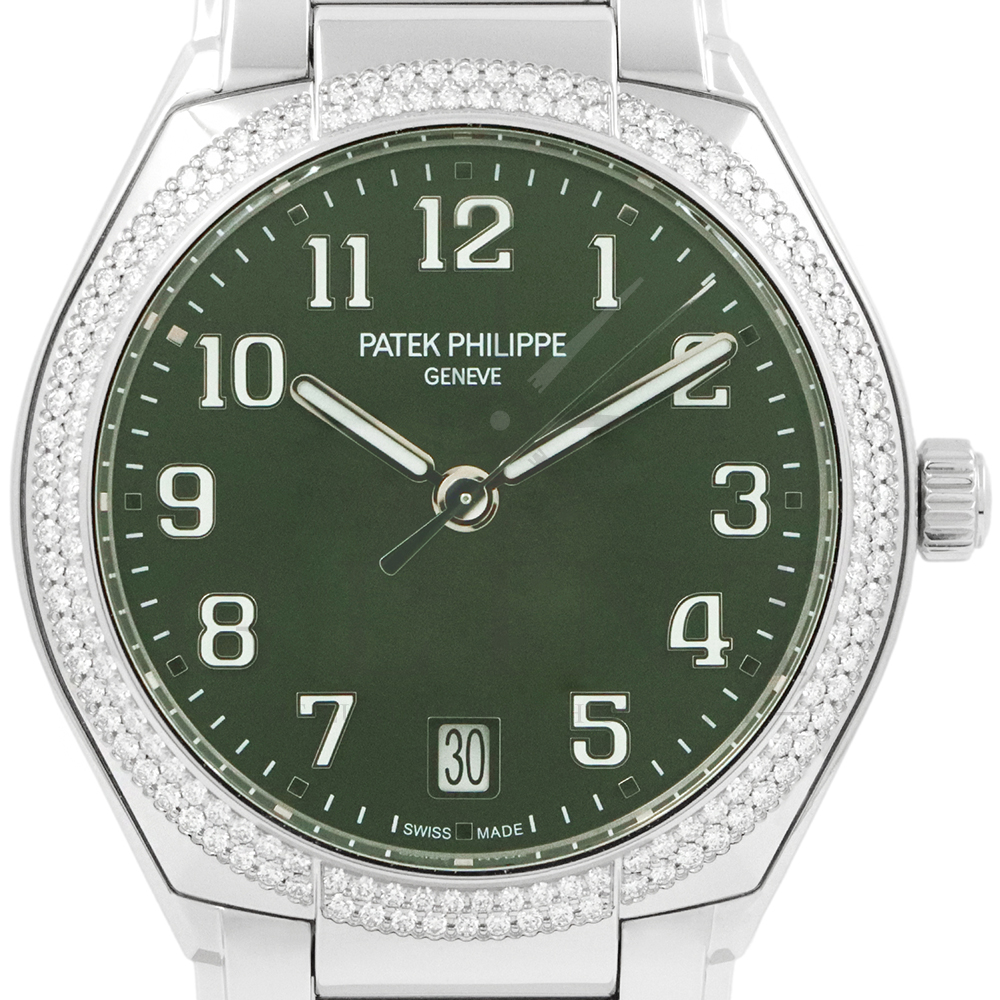 こちらはTWENTY~4 7300/1200A-011 オリーブグリーン・ソレイユです。このステンレススチール仕様の新しいTwenty~4 Automaticは、オリーブグリーンのエレガントな文字盤で際立ちます。このカラーは、現代のパテック フィリップ・コレクションで今回初めて登場し、放射状・ソレイユ仕上げにより輝かしい効果を発揮します。ベゼルに輝く160個のダイヤモンドと相まって大人の女性の腕元を演出してくれるでしょう。