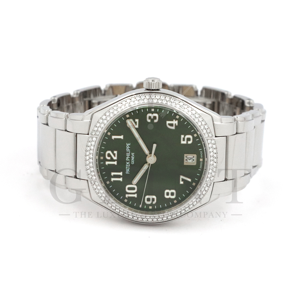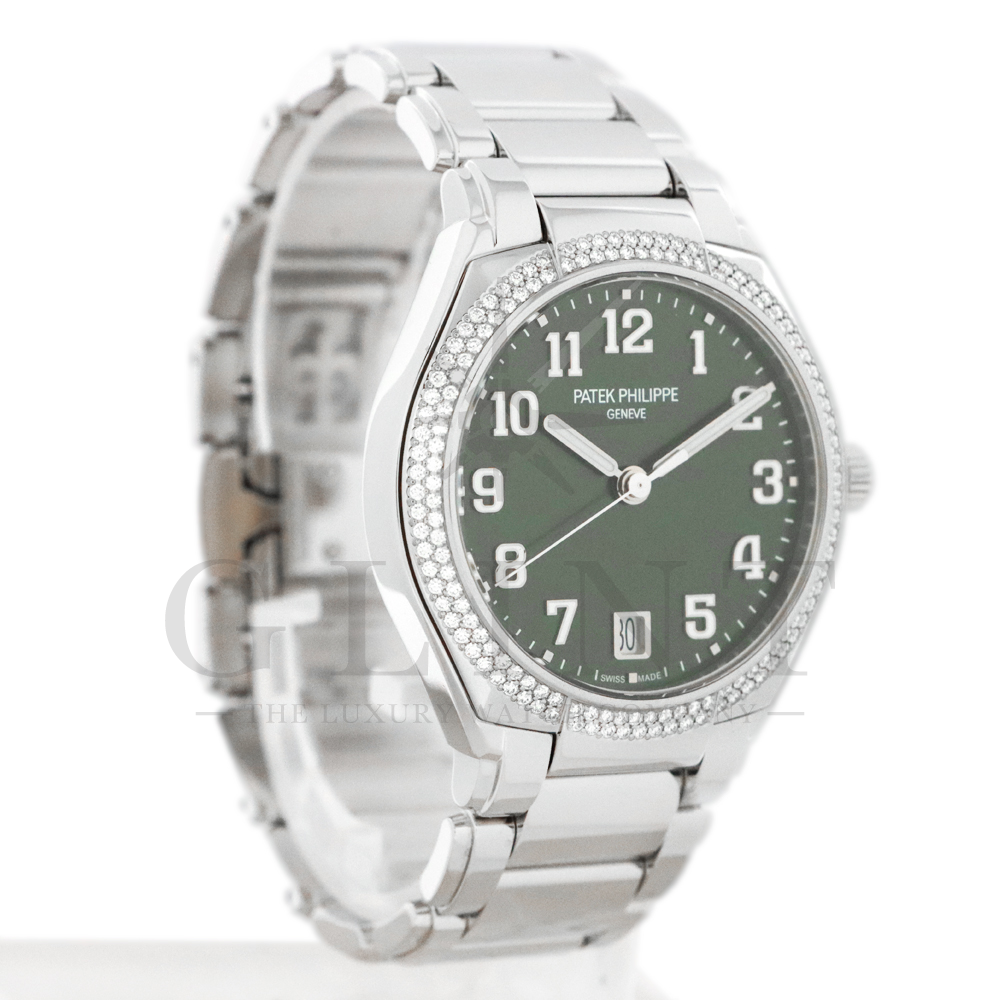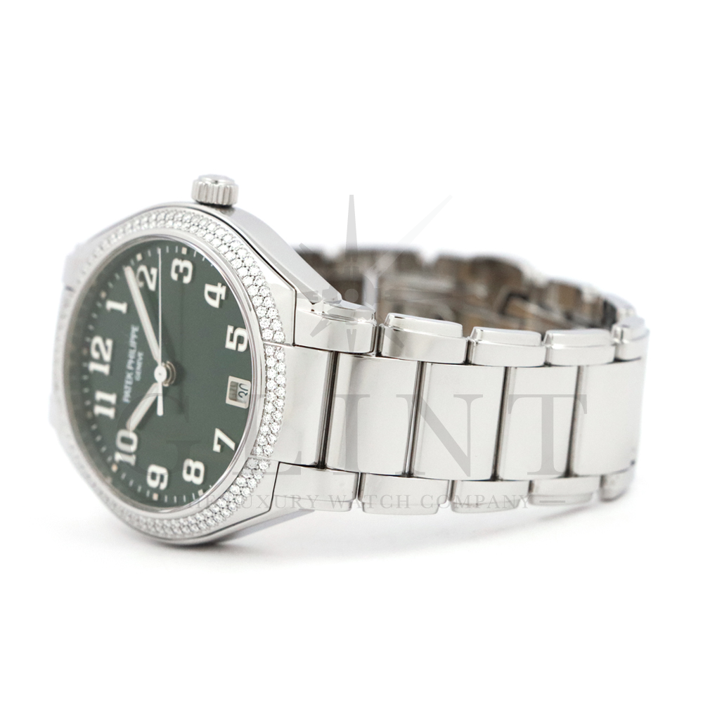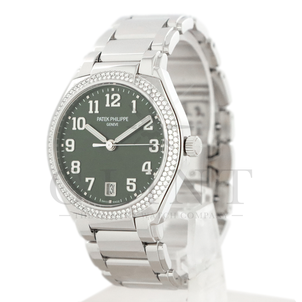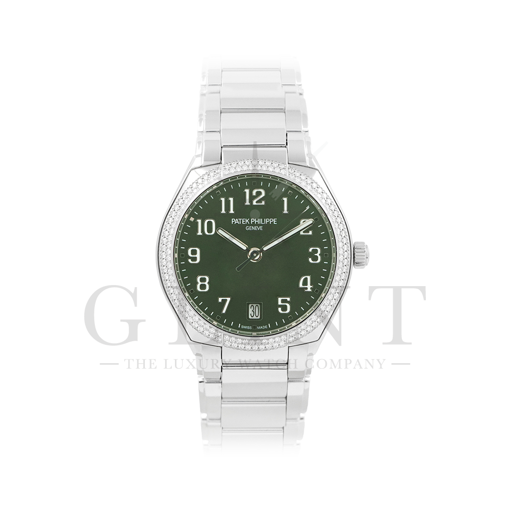 こちらはTWENTY~4 7300/1200A-011 オリーブグリーン・ソレイユです。このステンレススチール仕様の新しいTwenty~4 Automaticは、オリーブグリーンのエレガントな文字盤で際立ちます。このカラーは、現代のパテック フィリップ・コレクションで今回初めて登場し、放射状・ソレイユ仕上げにより輝かしい効果を発揮します。ベゼルに輝く160個のダイヤモンドと相まって大人の女性の腕元を演出してくれるでしょう。